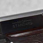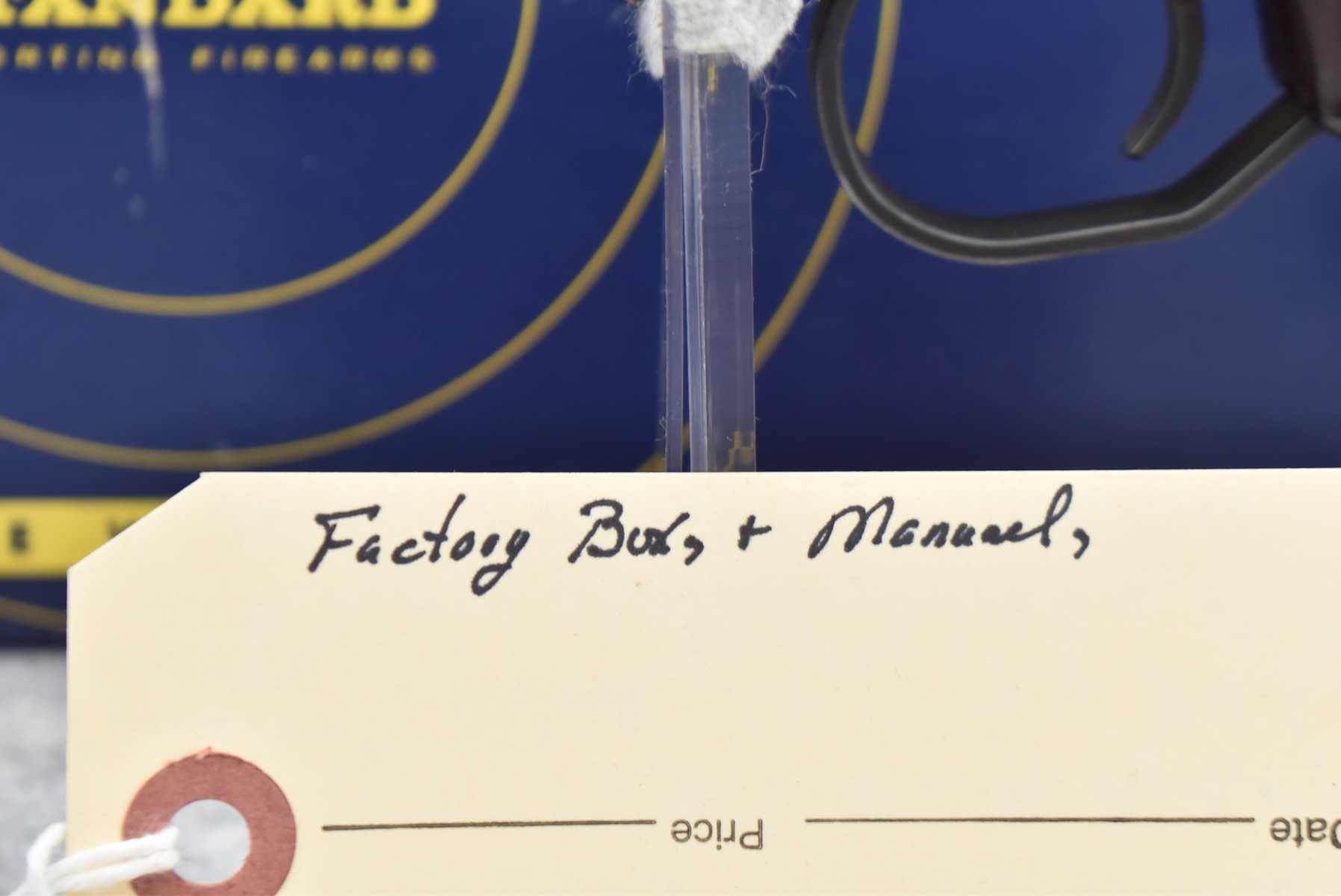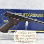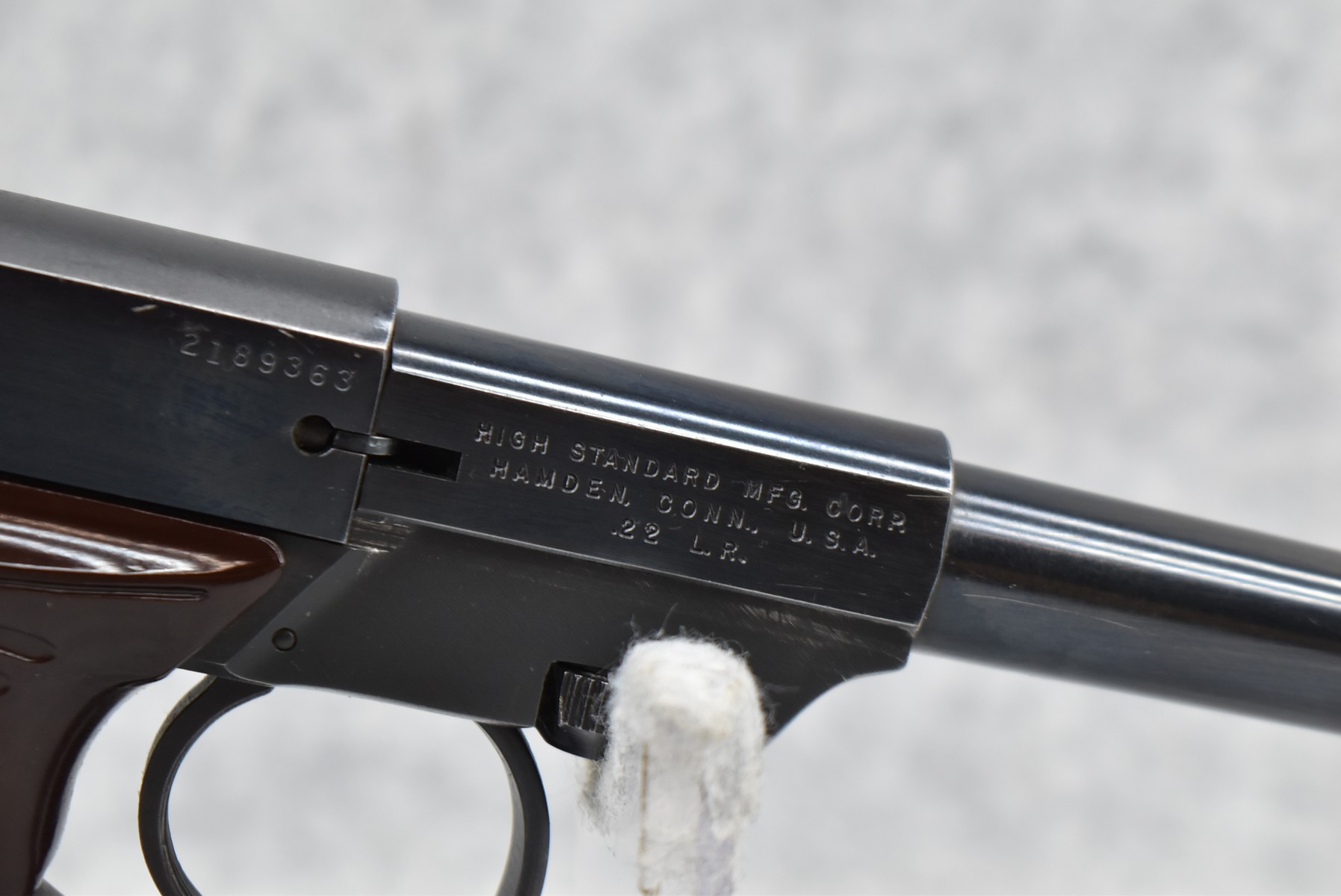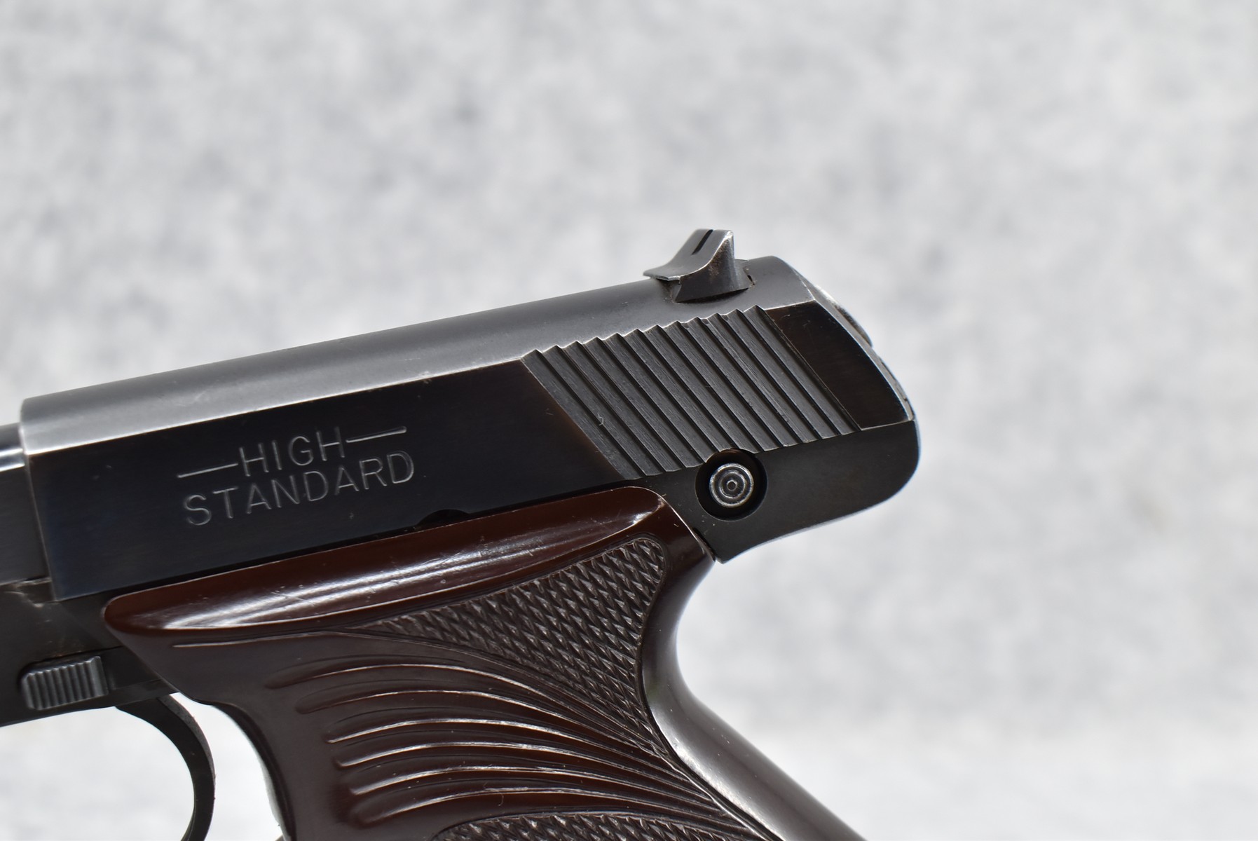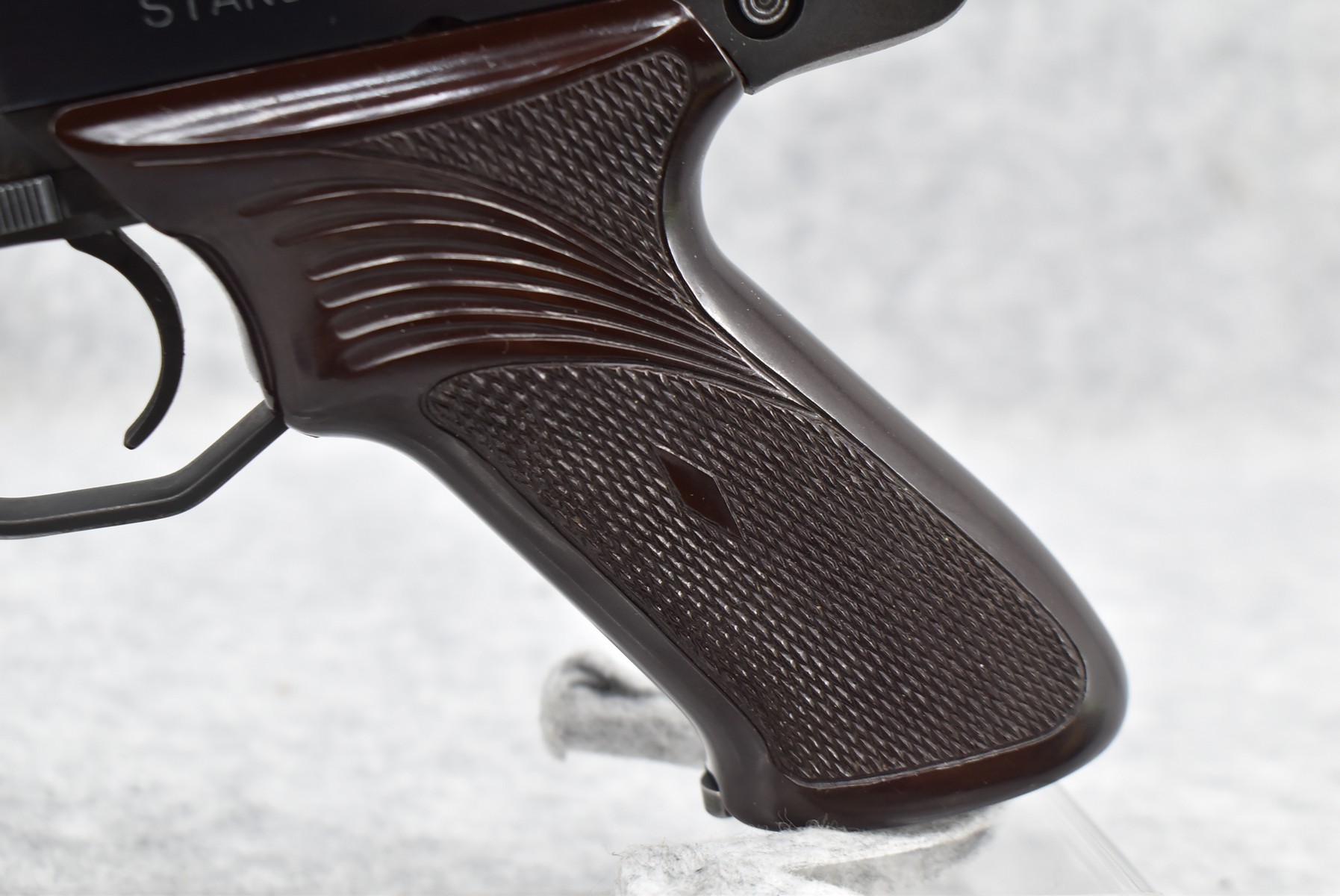 182R. High Standard – Mod. The Plinker M-101 – 22LR Cal. Semi-Auto Pistol – w/6½” Barrel w/Blade Front and Adjustable Rear Notch Sights – Blued Finish – w/Diamond Checkered Brown Plastic Grips – w/Factory Detachable Magazine – Like New Condition w/Factory Box and Manual