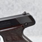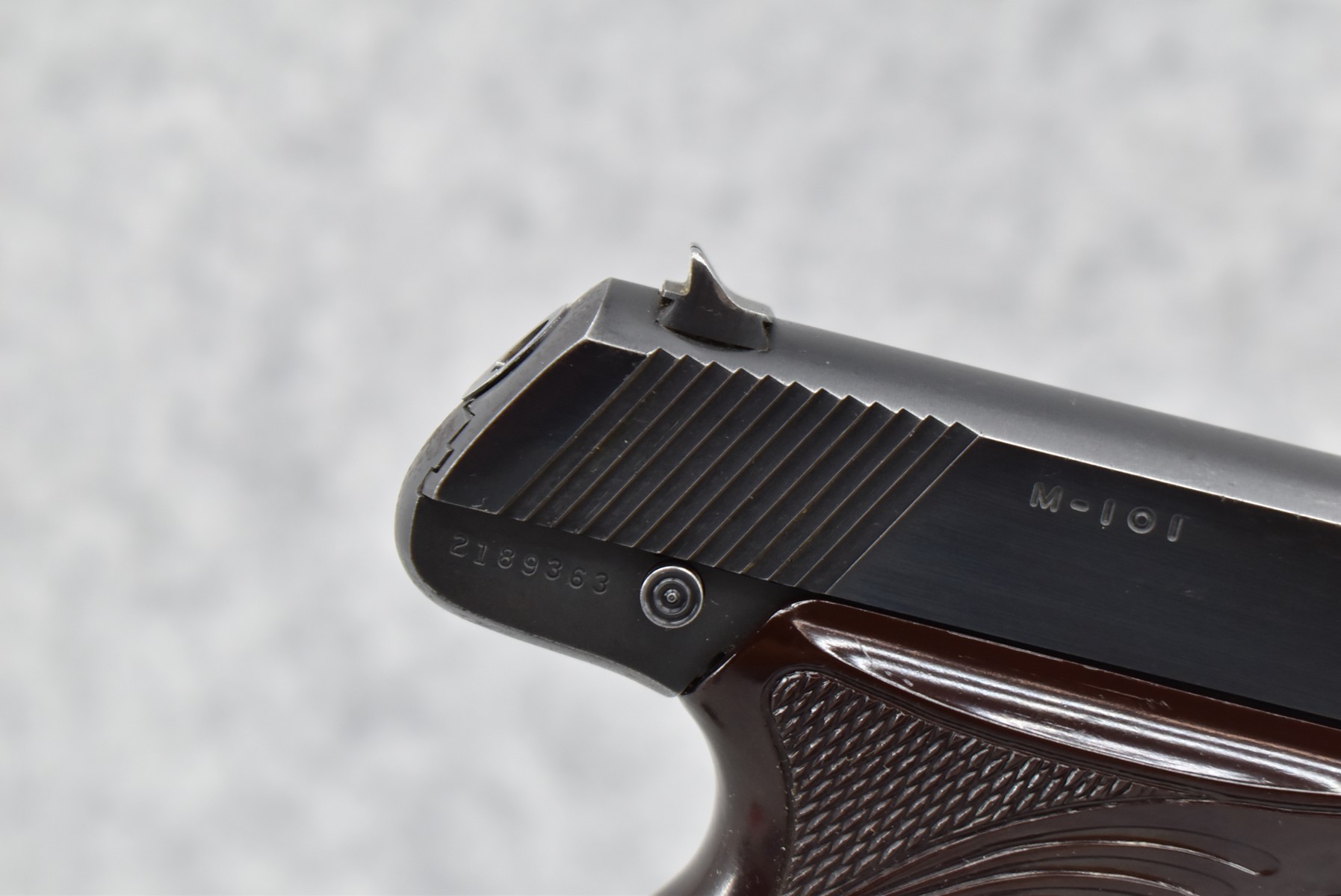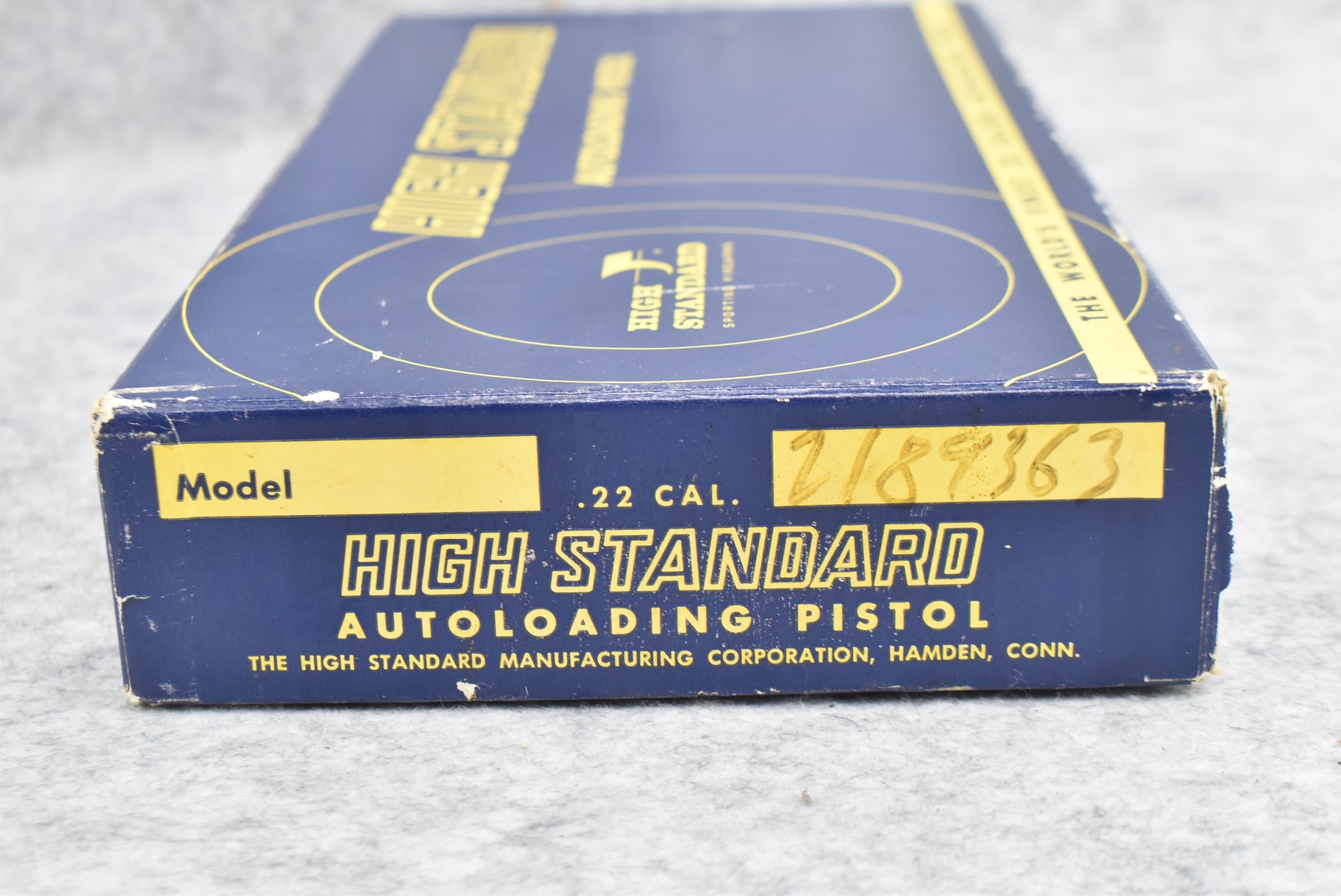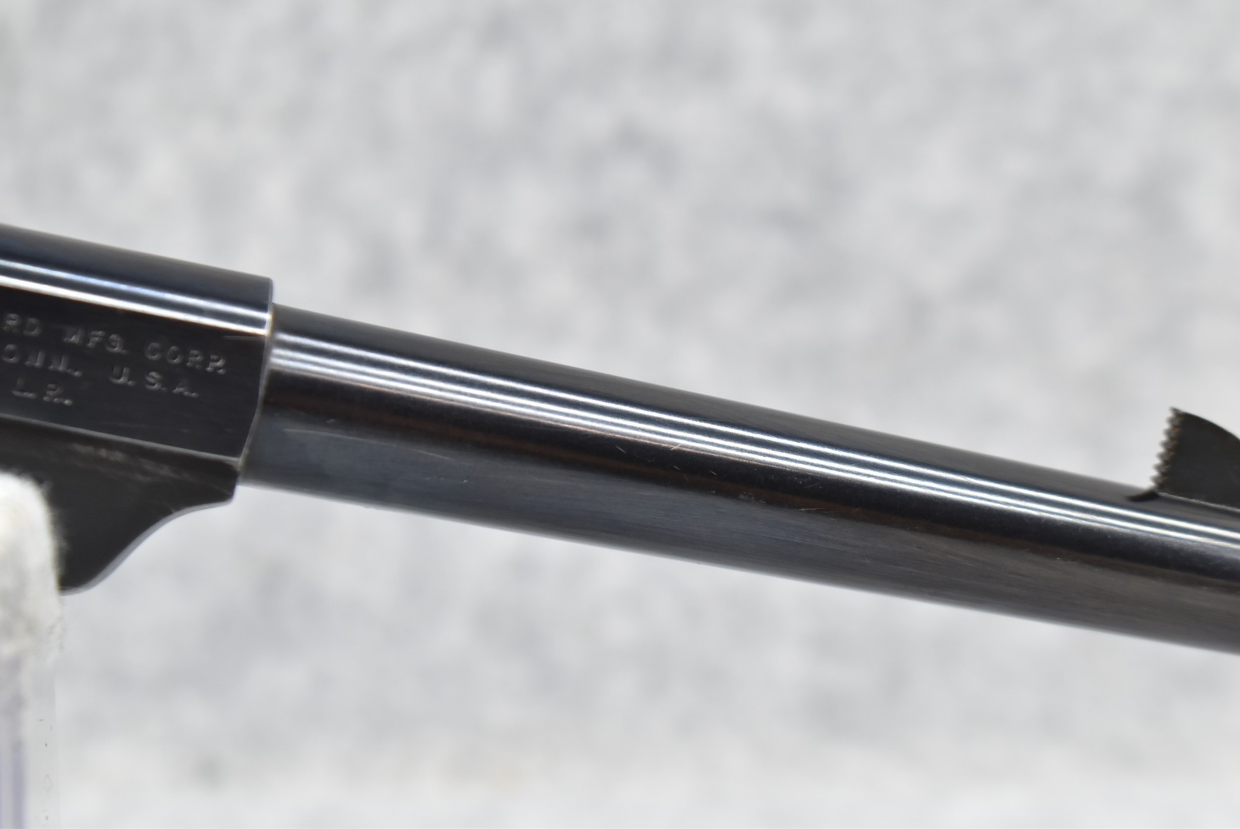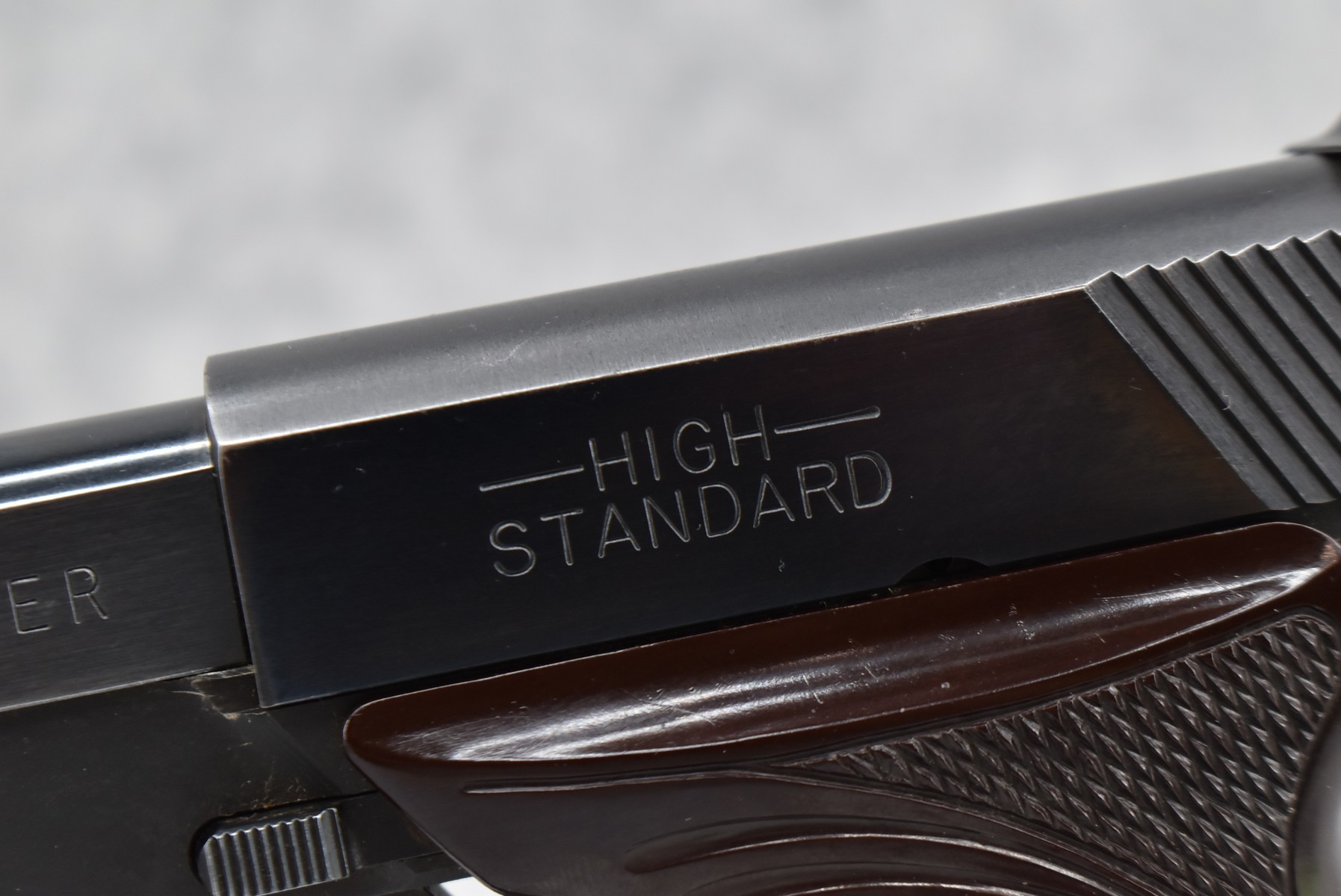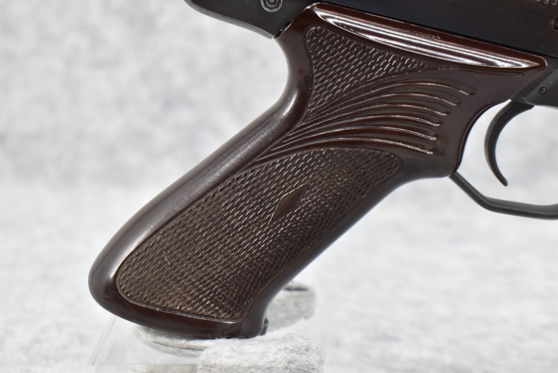 182R. High Standard – Mod. The Plinker M-101 – 22LR Cal. Semi-Auto Pistol – w/6½” Barrel w/Blade Front and Adjustable Rear Notch Sights – Blued Finish – w/Diamond Checkered Brown Plastic Grips – w/Factory Detachable Magazine – Like New Condition w/Factory Box and Manual