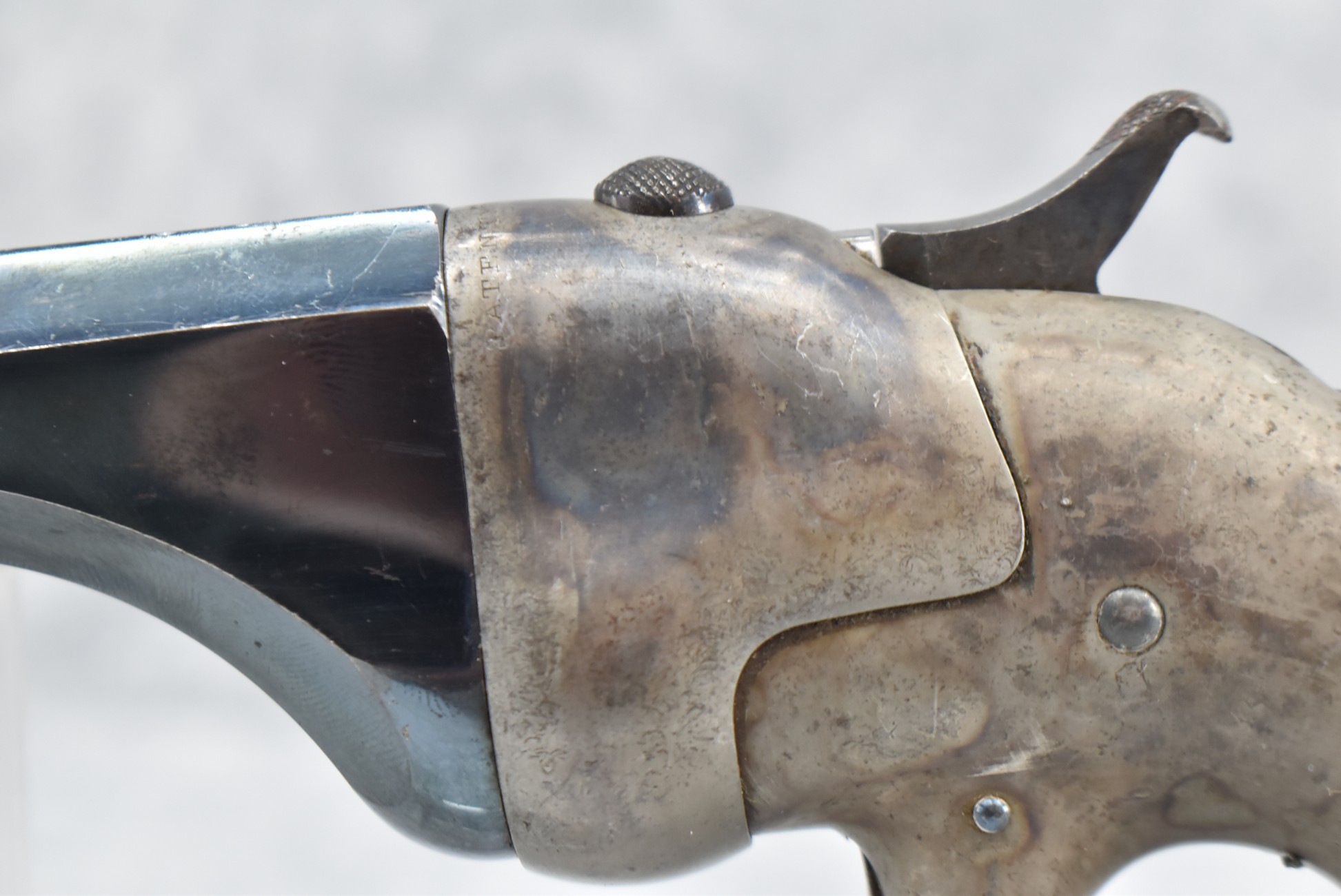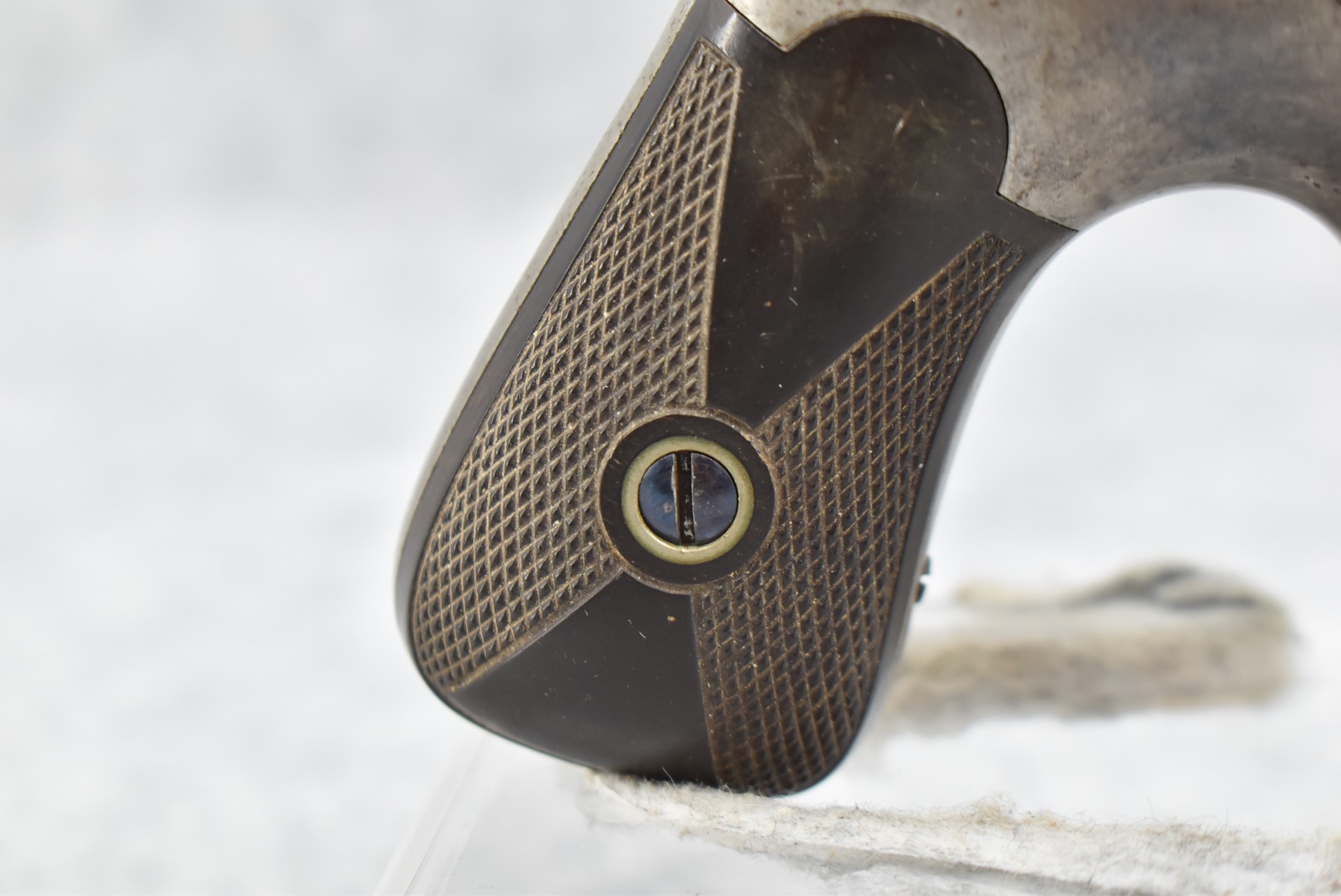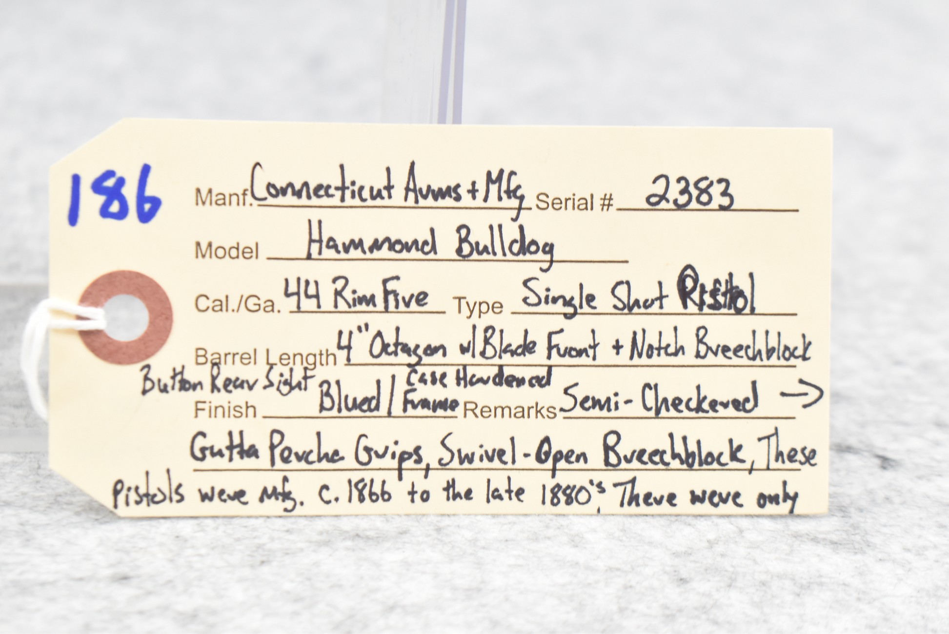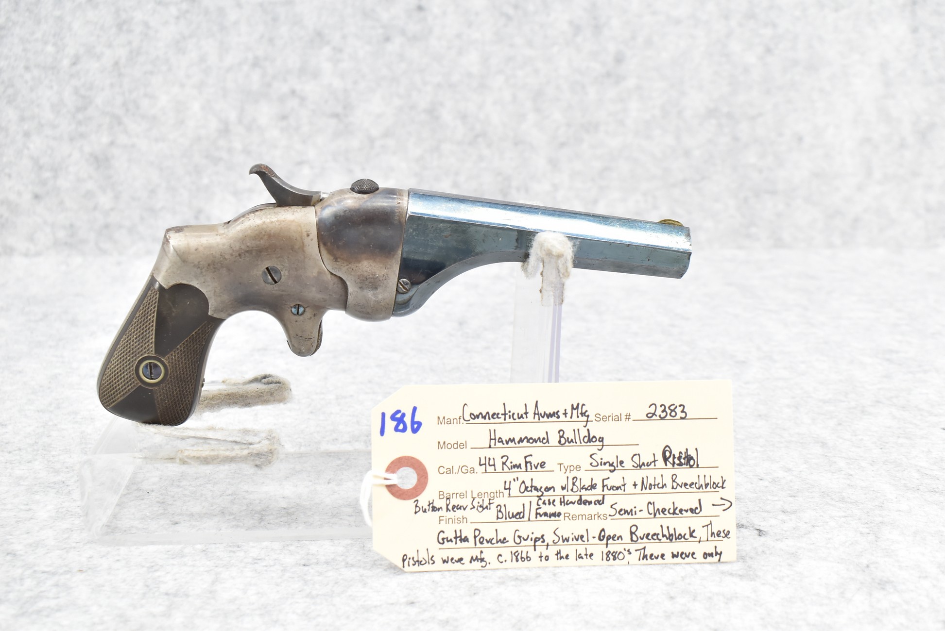 186. Connecticut Arms & Mfg. – Mod. Hammond Bulldog – 44 Rim Fire Cal. Single Shot Pistol – w/4” Octagon Barrel w/Blade Front & Notch Breechblock Button Rear Sights – Blued Finish w/Case Hardened Frame – w/Semi-Checkered Gutta Percha Grips – w/Swivel-Open Breechblock – Gun Retains Almost all Original Bluing on the Barrel w/Strong Spots of Original Case Color on the Frame & Breechblock – These Pistols Were Mfg. Circa 1866 to the Late 1880’s, There Were Only an Estimated 8,000 Total Mfg. w/This One Being #2383 of That Estimated 8,000