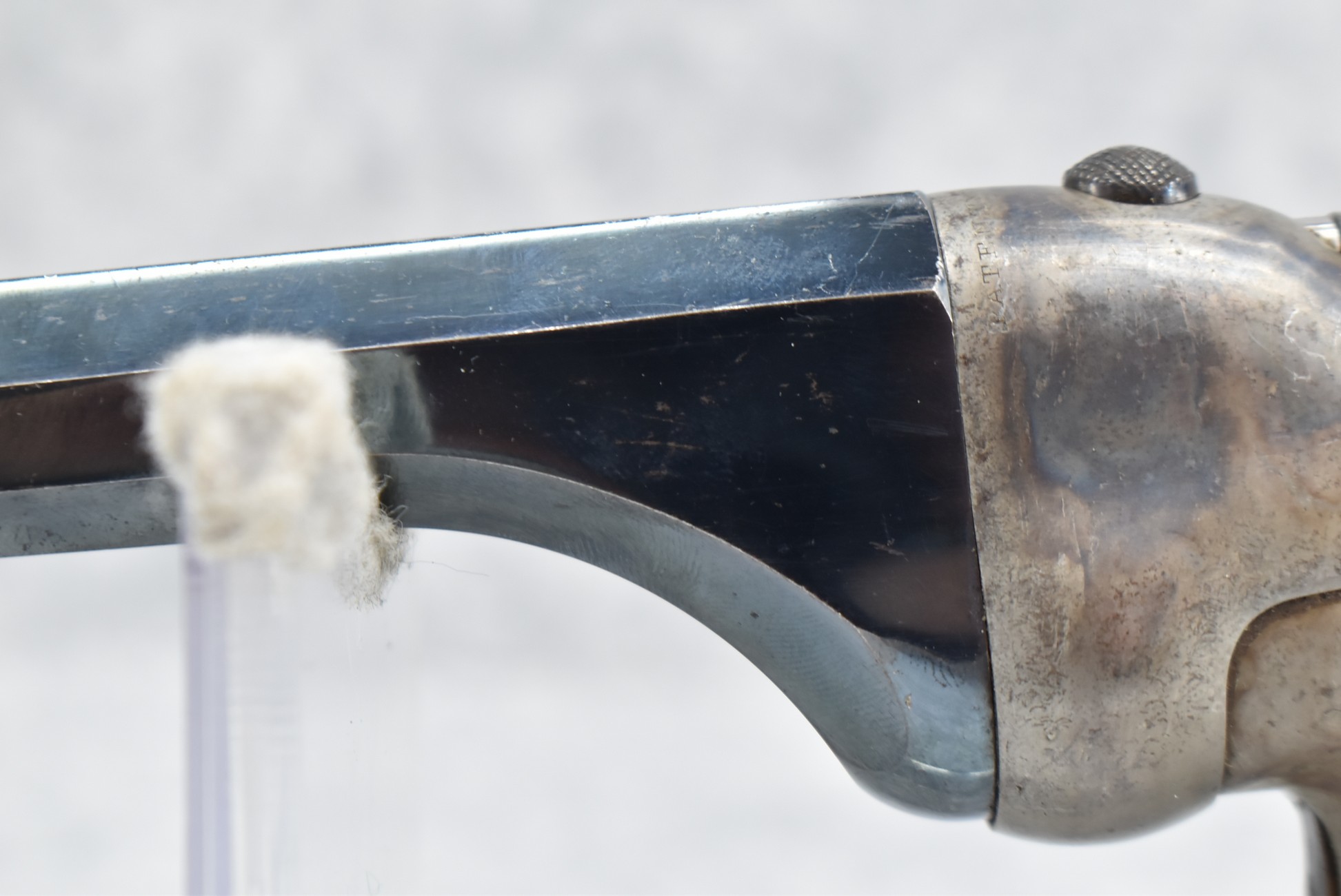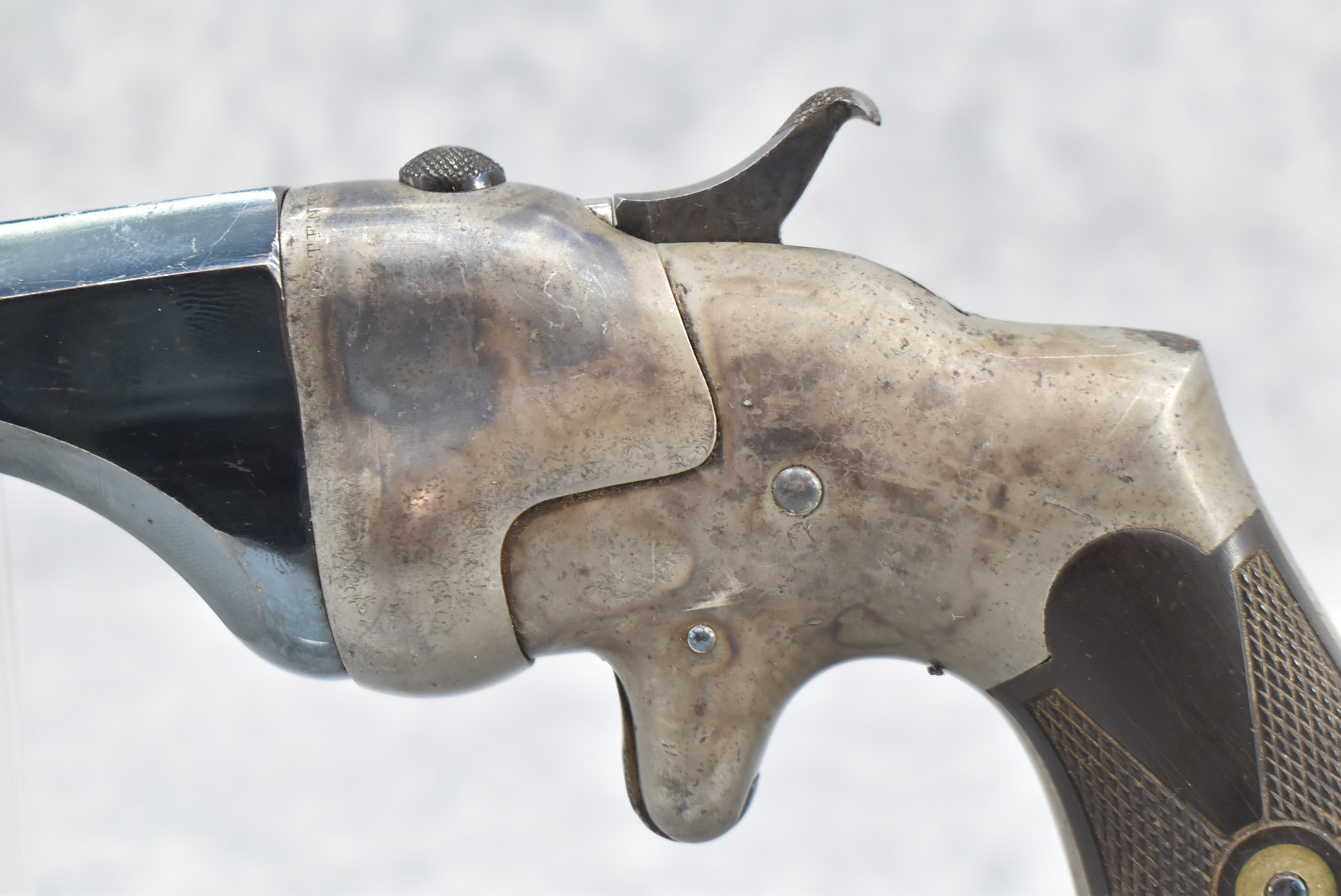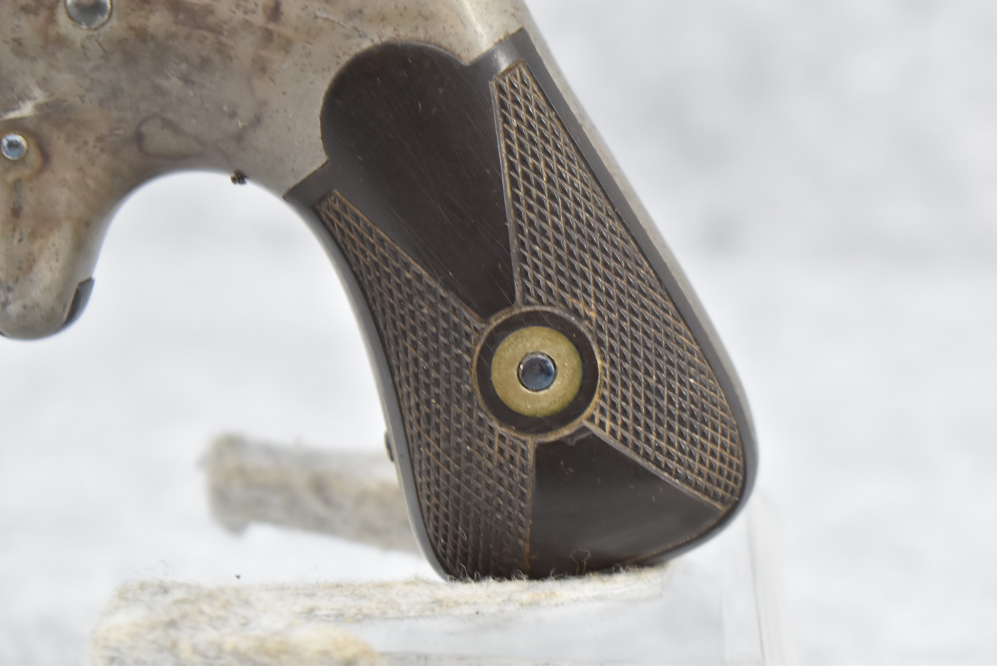 186. Connecticut Arms & Mfg. – Mod. Hammond Bulldog – 44 Rim Fire Cal. Single Shot Pistol – w/4” Octagon Barrel w/Blade Front & Notch Breechblock Button Rear Sights – Blued Finish w/Case Hardened Frame – w/Semi-Checkered Gutta Percha Grips – w/Swivel-Open Breechblock – Gun Retains Almost all Original Bluing on the Barrel w/Strong Spots of Original Case Color on the Frame & Breechblock – These Pistols Were Mfg. Circa 1866 to the Late 1880’s, There Were Only an Estimated 8,000 Total Mfg. w/This One Being #2383 of That Estimated 8,000