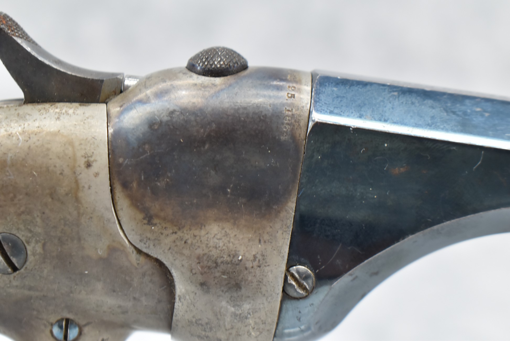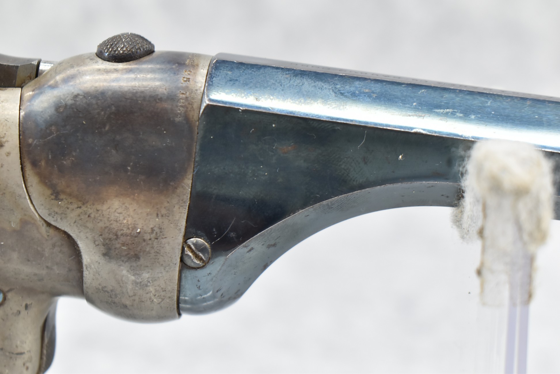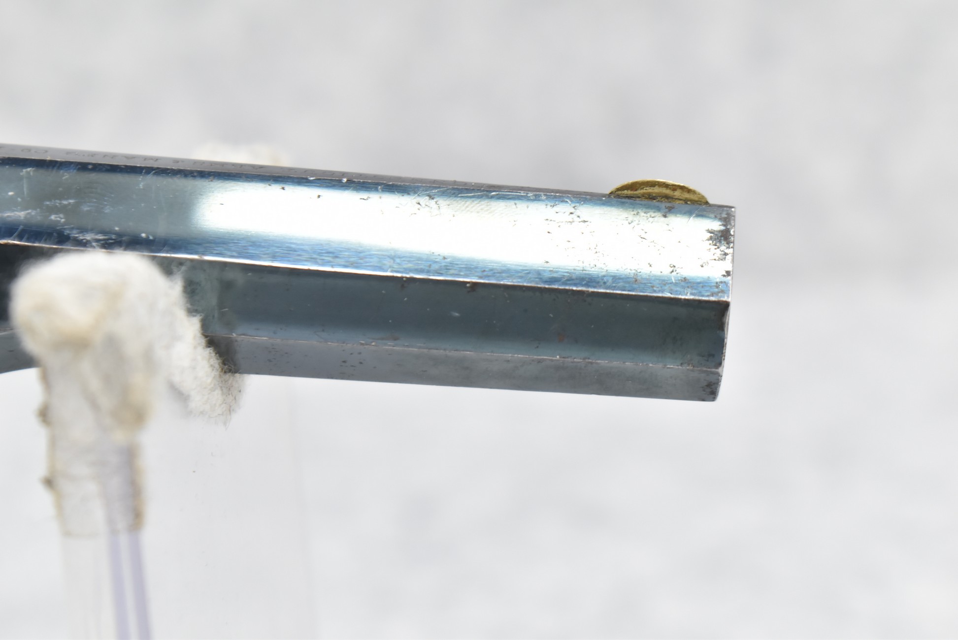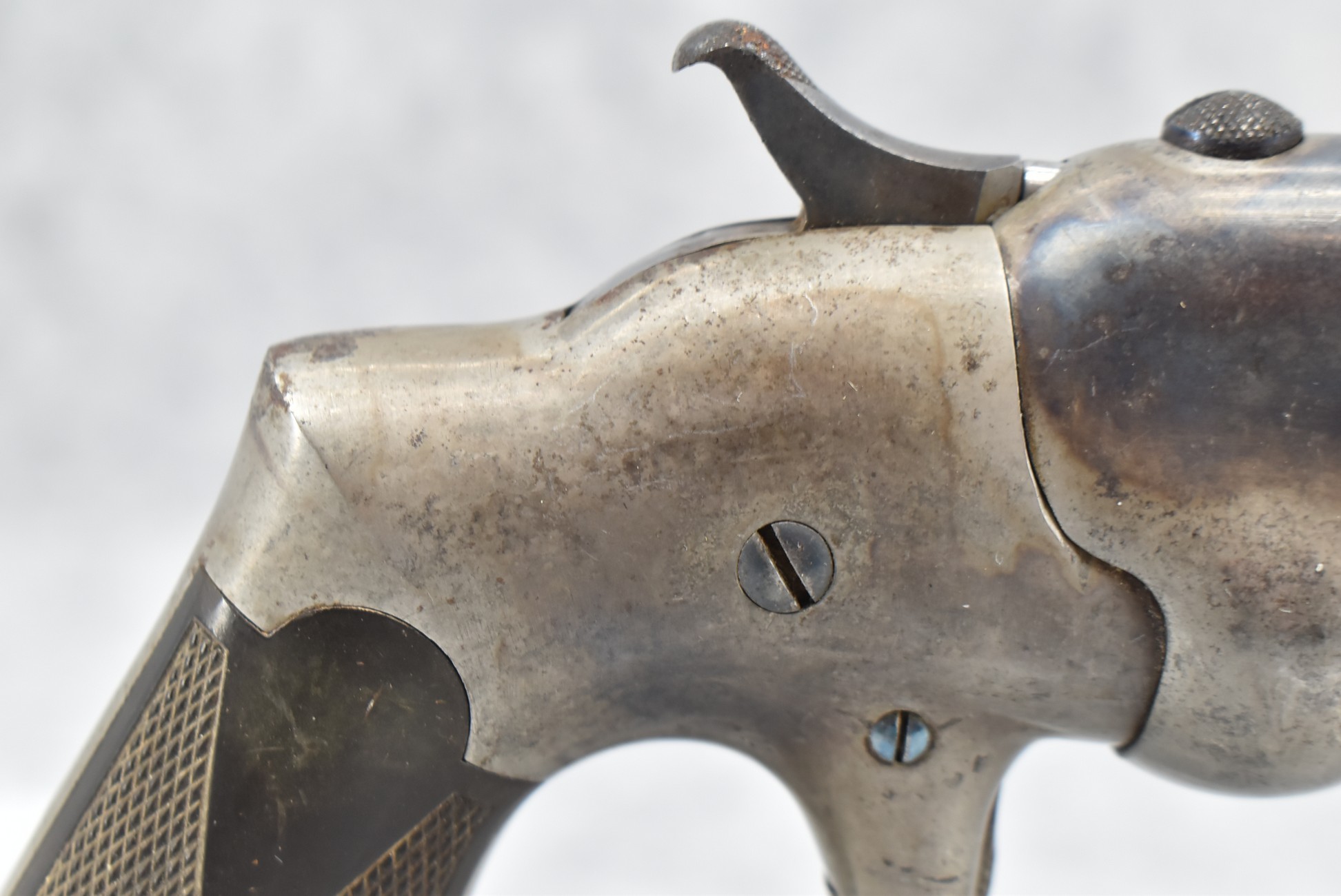 186. Connecticut Arms & Mfg. – Mod. Hammond Bulldog – 44 Rim Fire Cal. Single Shot Pistol – w/4” Octagon Barrel w/Blade Front & Notch Breechblock Button Rear Sights – Blued Finish w/Case Hardened Frame – w/Semi-Checkered Gutta Percha Grips – w/Swivel-Open Breechblock – Gun Retains Almost all Original Bluing on the Barrel w/Strong Spots of Original Case Color on the Frame & Breechblock – These Pistols Were Mfg. Circa 1866 to the Late 1880’s, There Were Only an Estimated 8,000 Total Mfg. w/This One Being #2383 of That Estimated 8,000
