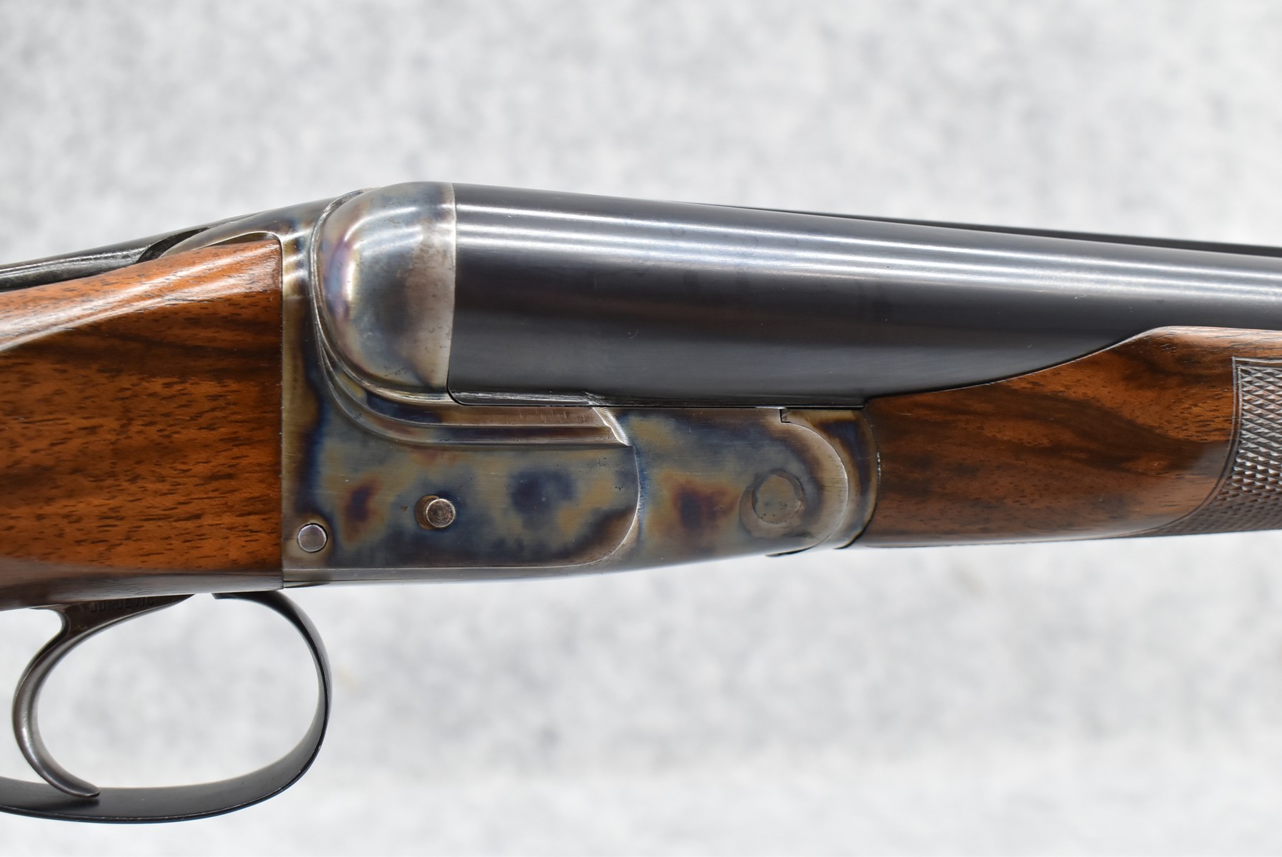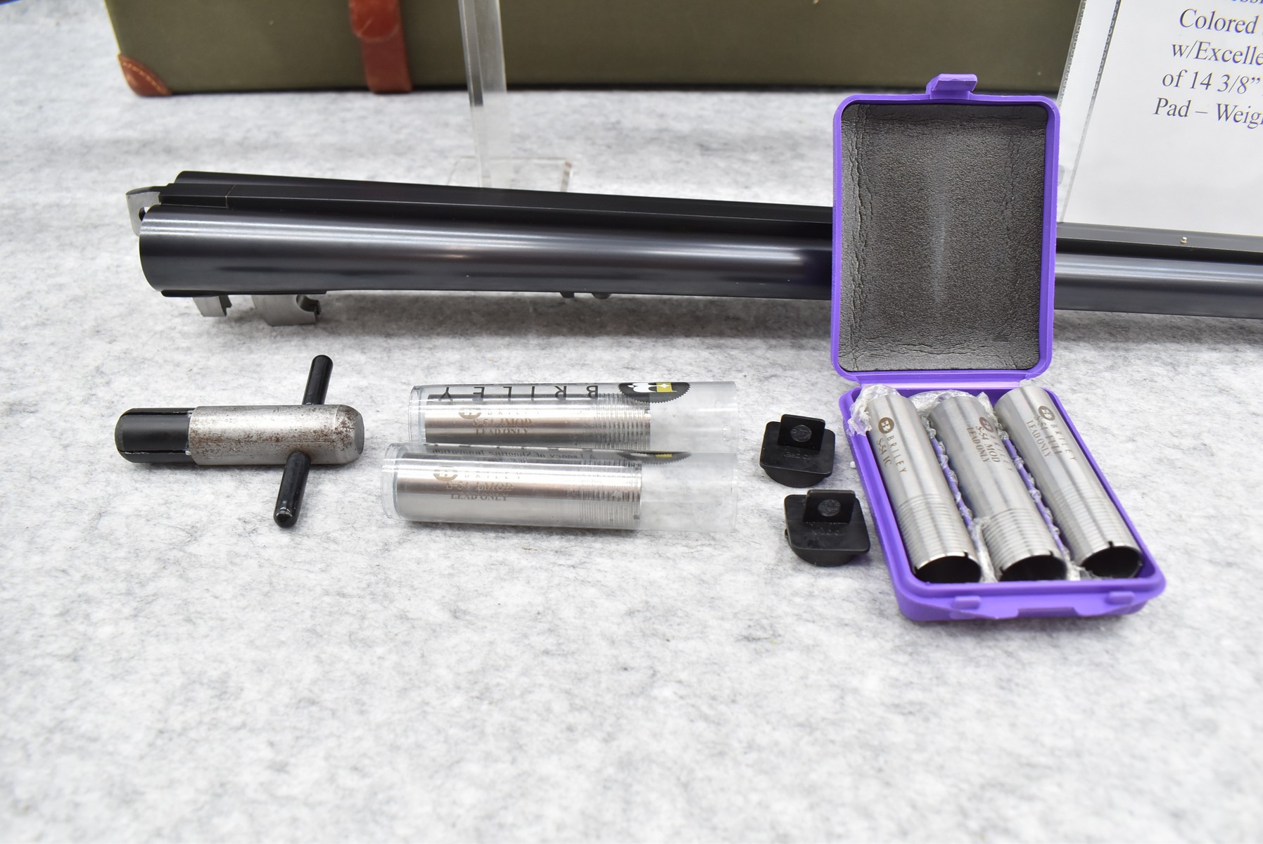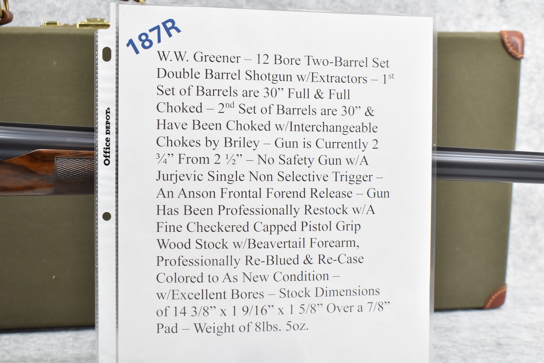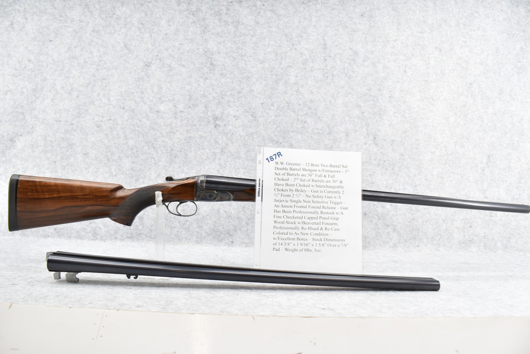 187R. W.W. Greener – 12 Bore Two-Barrel Set Double Barrel Shotgun w/Extractors – 1st Set of Barrels are 30” Full & Full Choked – 2nd Set of Barrels are 30” & Have Been Choked w/Interchangeable Chokes by Briley – Gun is Currently 2 ¾” From 2 ½” – No Safety Gun w/A Jurjevic Single Non Selective Trigger – An Anson Frontal Forend Release – Gun Has Been Professionally Restock w/A Fine Checkered Capped Pistol Grip Wood Stock w/Beavertail Forearm, Professionally Re-Blued & Re-Case Colored to As New Condition – w/Excellent Bores – Stock Dimensions of 14 3/8” x 1 9/16” x 1 5/8” Over a 7/8” Pad – Weight of 8lbs. 5oz
