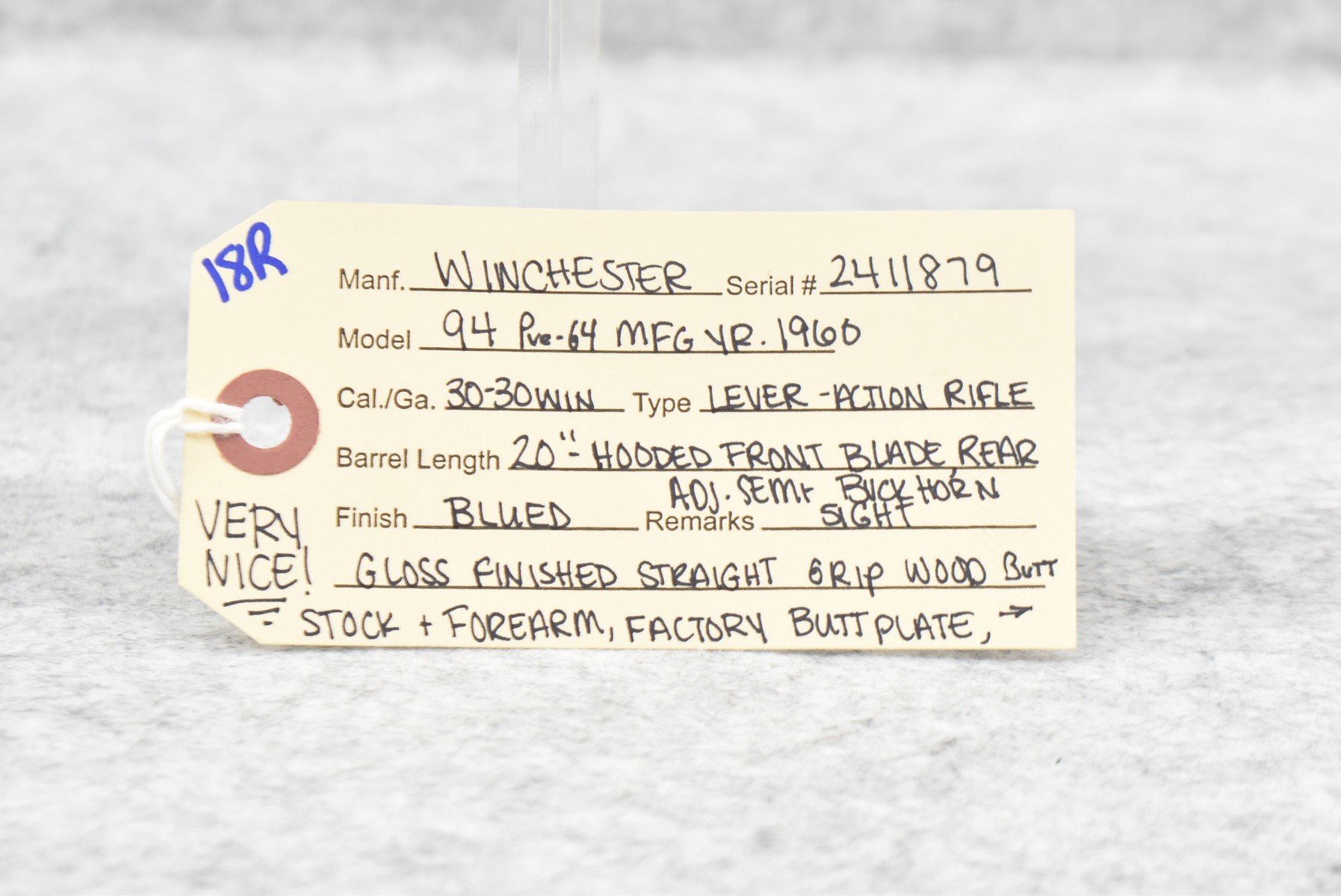 18R. Winchester – Mod. 94 (Pre-64) – 30-30 Win. Cal. Lever Action Rifle – w/20” Barrel w/Hooded Front Blade & Rear Adj. Semi-Buckhorn Sights – Blued Finish – w/Gloss Finished Straight Grip Wood Butt Stocks w/Factory Butt Plate – w/Full Length Tubular Magazine – Mfg. 1960 – Possibly Unfired!