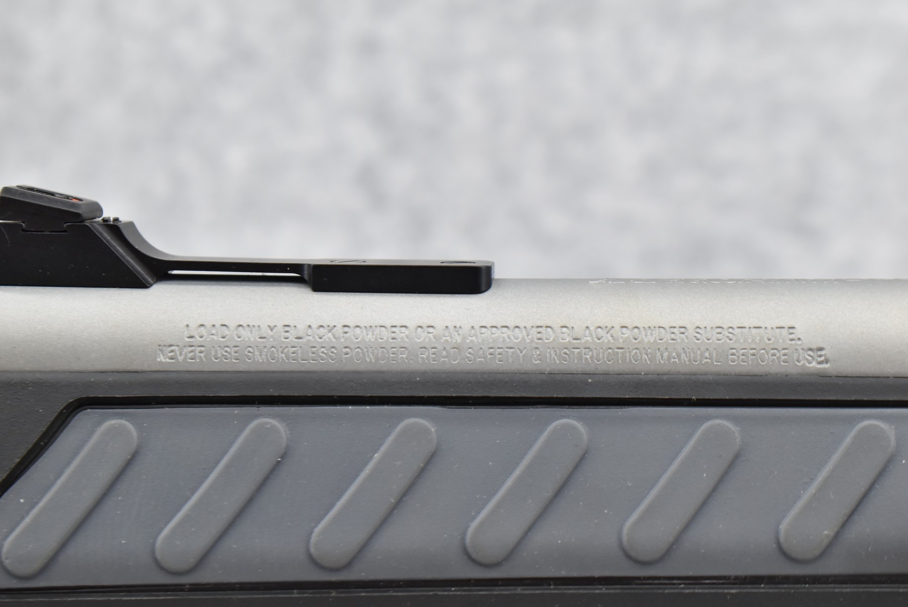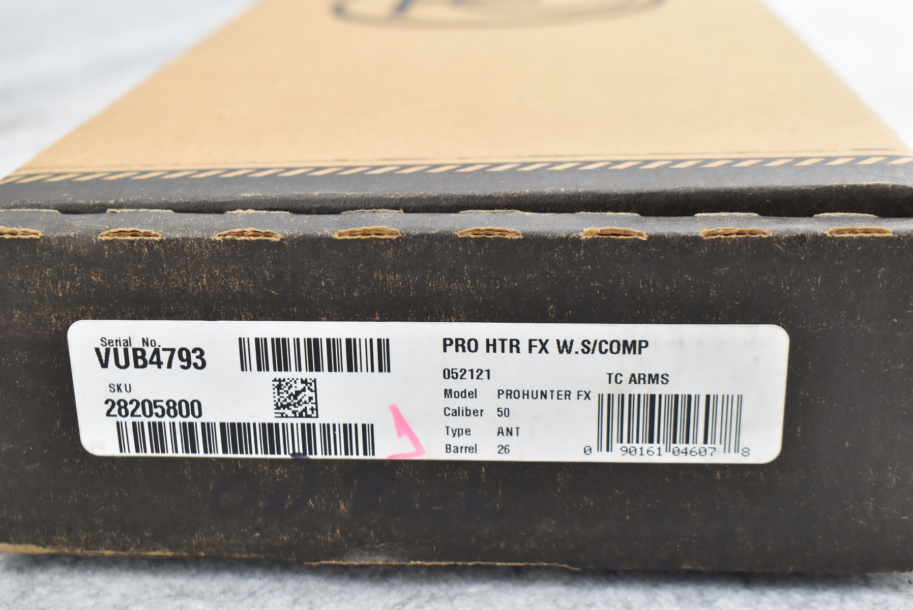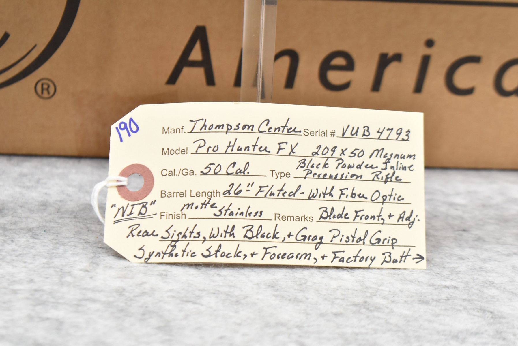 190. Thompson Center – Mod. Pro Hunter FX – 50 Cal. 209×50 Magnum Black Powder Inline Percussion Rifle – w/26” Fluted Barrel w/Fiber Optic Blade Front & Adj. Rear Sights – Matte Stainless Finish – w/Black & Gray Pistol Grip Synthetic Stocks w/Factory Butt Pad – New w/Factory Box, Manual & Accessories – Note: Gun is Black Powder Only, No Registration Required