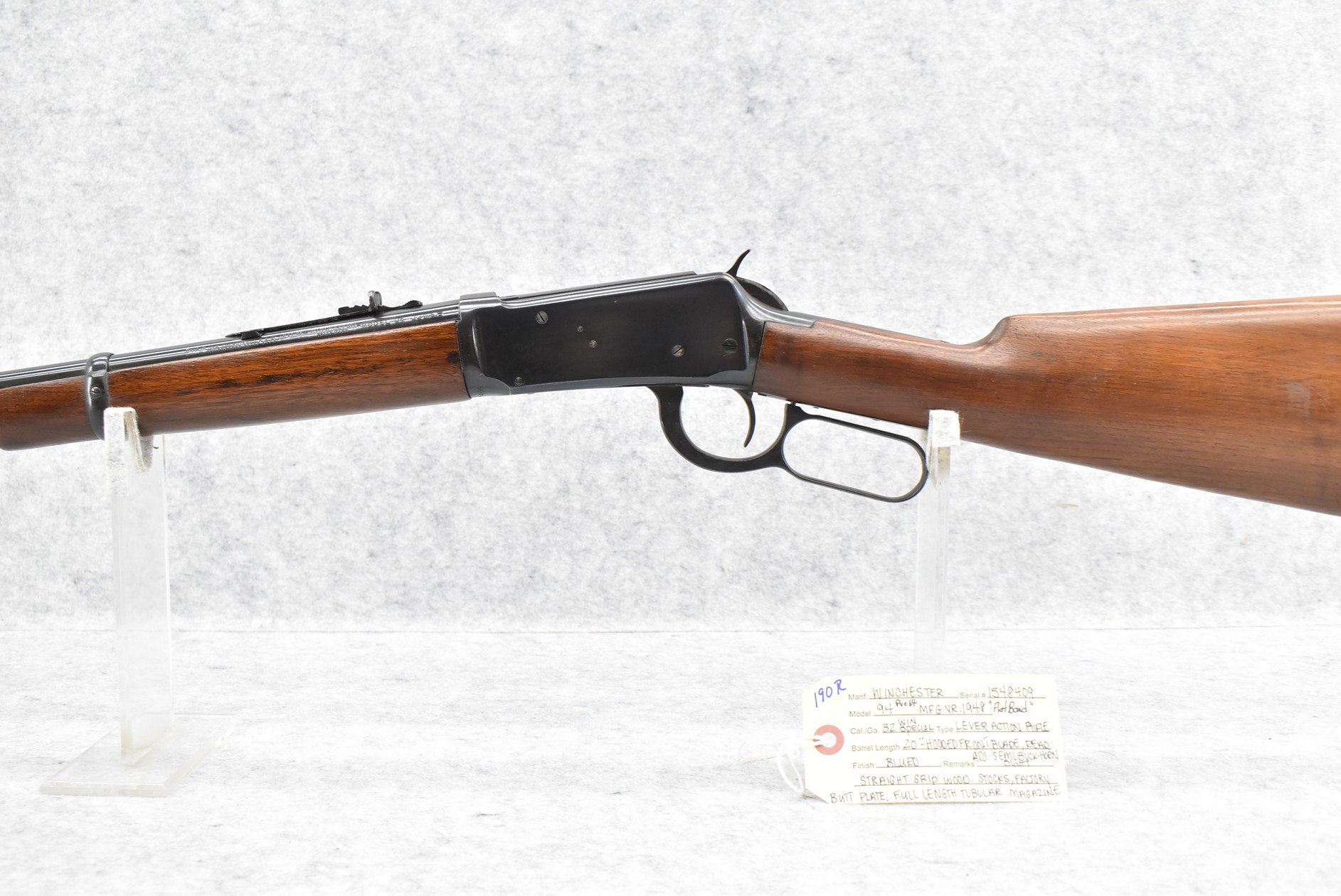 190R. Winchester – Mod. 94 (Pre-64) “Flat Band” – 32 Win. Spl. Cal. Lever Action Rifle – w/20” Barrel w/Hooded Front Blade & Rear Adj. Semi-Buckhorn Sights w/Full Length Tubular Magazine – Blued Finish – w/Straight Grip Wood Stocks w/Factory Butt Plate – Mfg. 1948