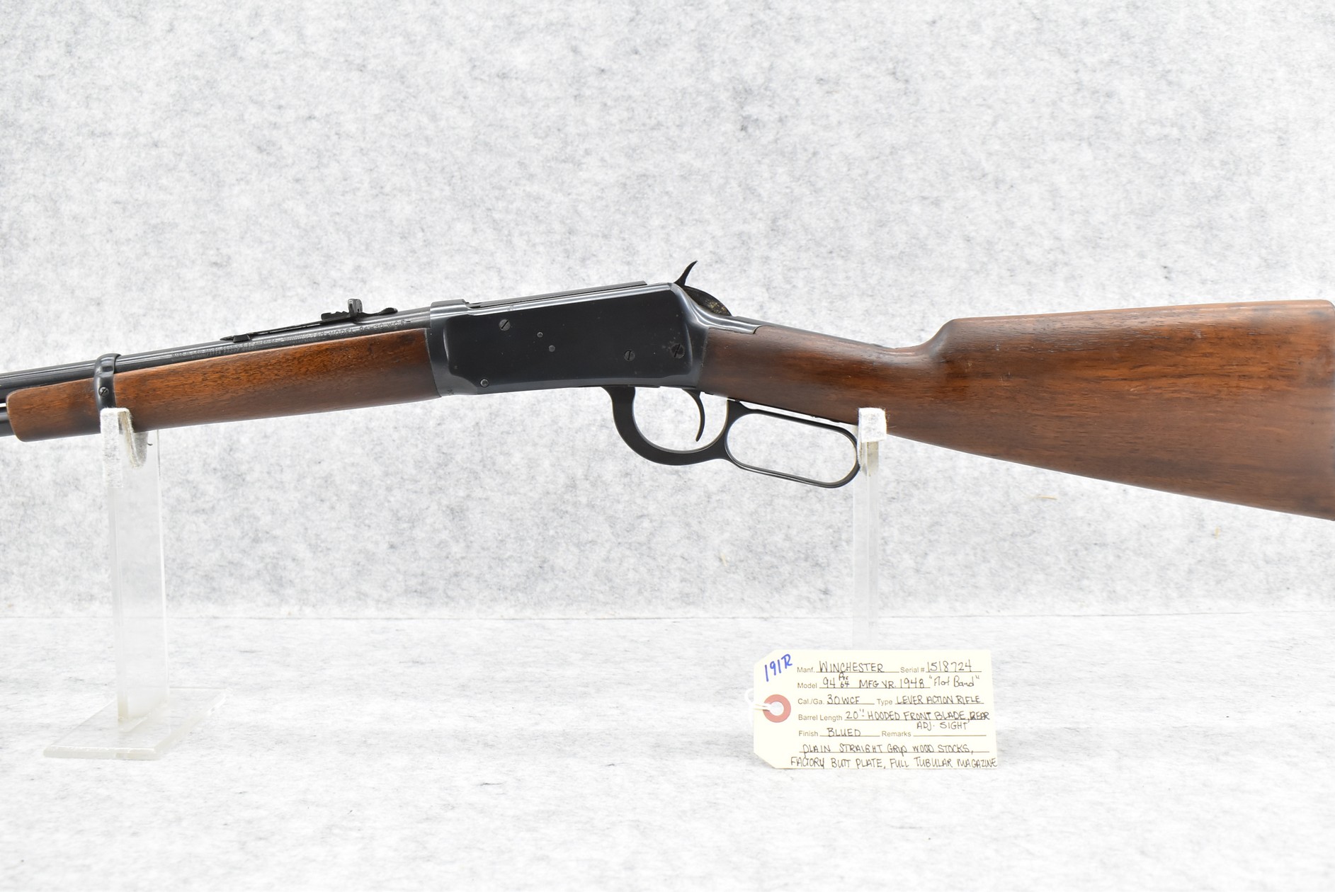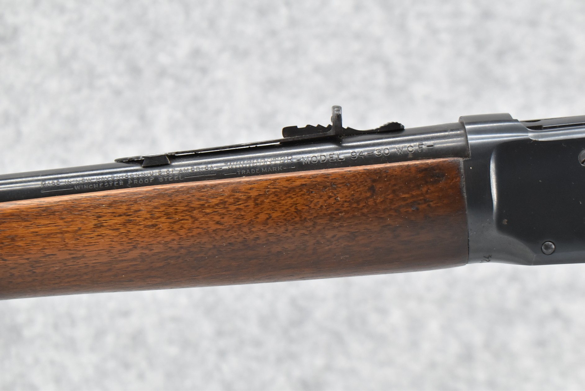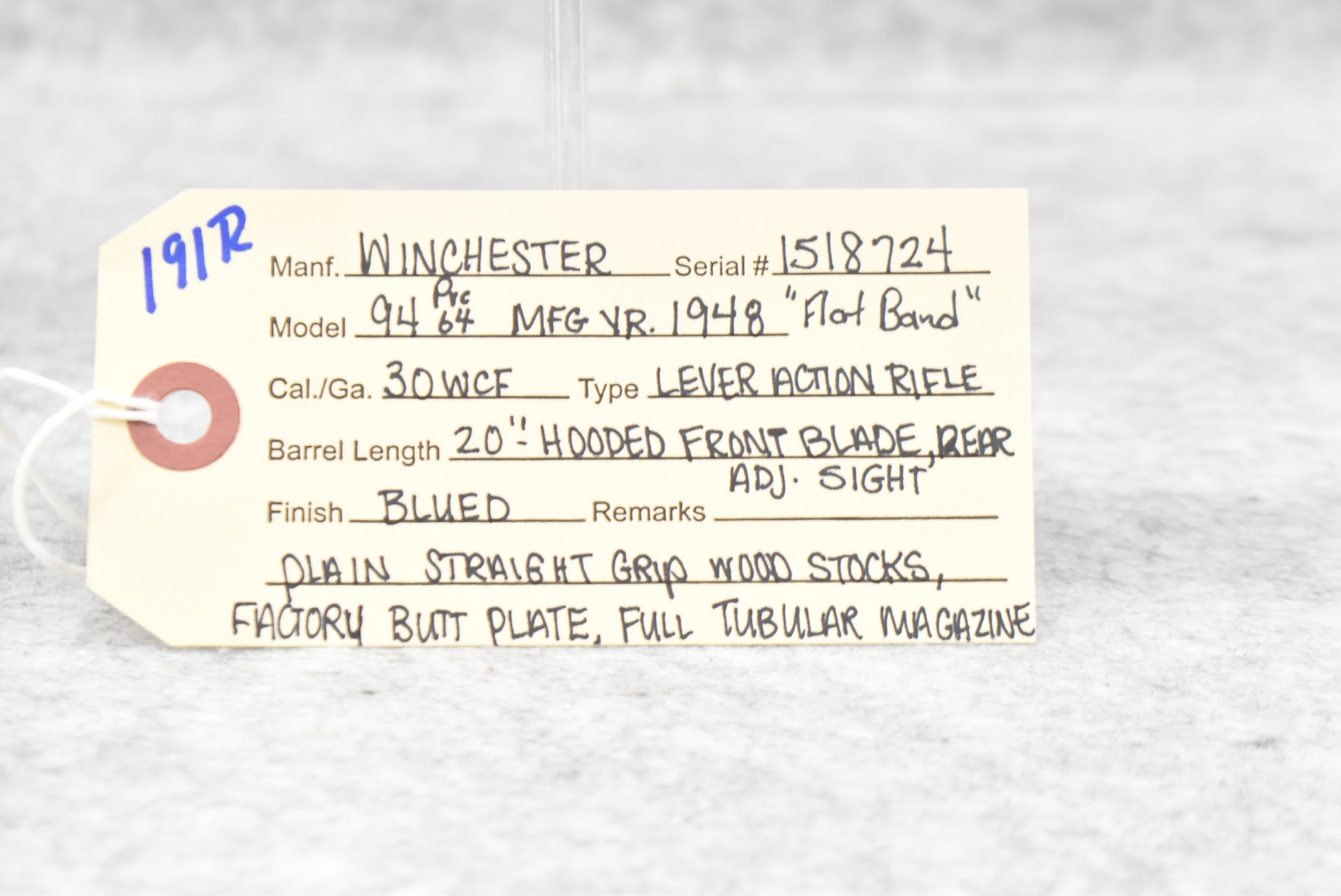 191R. Winchester – Mod. 94 (Pre-64) “Flat Band” – 30 WCF Cal. Lever Action Rifle – w/20” Barrel w/Hooded Front Blade & Rear Adj. Sights w/Full Length Tubular Magazine – Blued Finish – w/Plain Straight Grip Wood Stocks w/Factory Butt Plate – Mfg. 1948