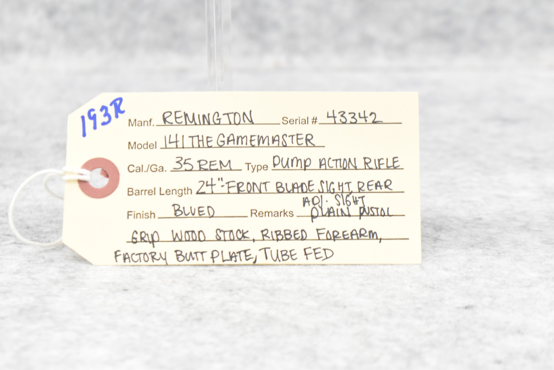 193R. Remington – Mod. 141 The Gamemaster – 35 Rem. Cal. Pump Action Rifle – w/24” Barrel w/Front Blade Sight & Rear Adj. Sight – Blued Finish – w/Plain Pistol Grip Wood Stock & Ribbed Forearm w/Factory Butt Plate – Tube Fed