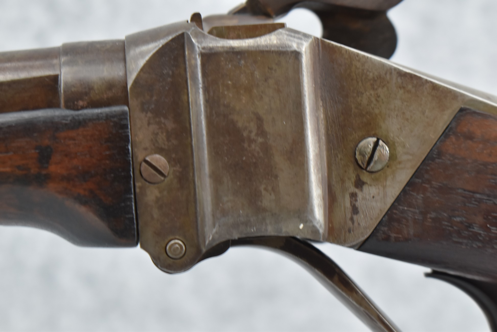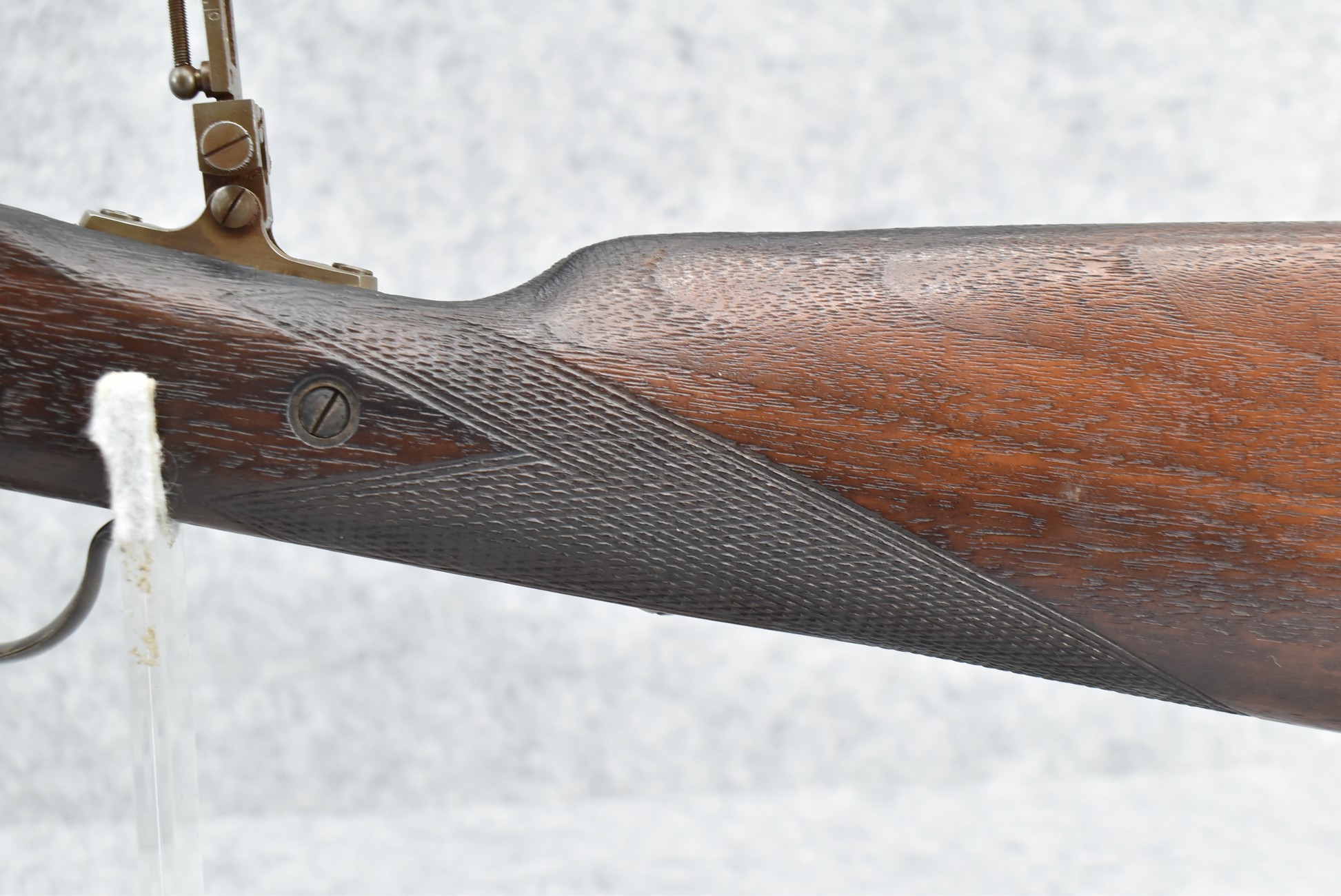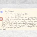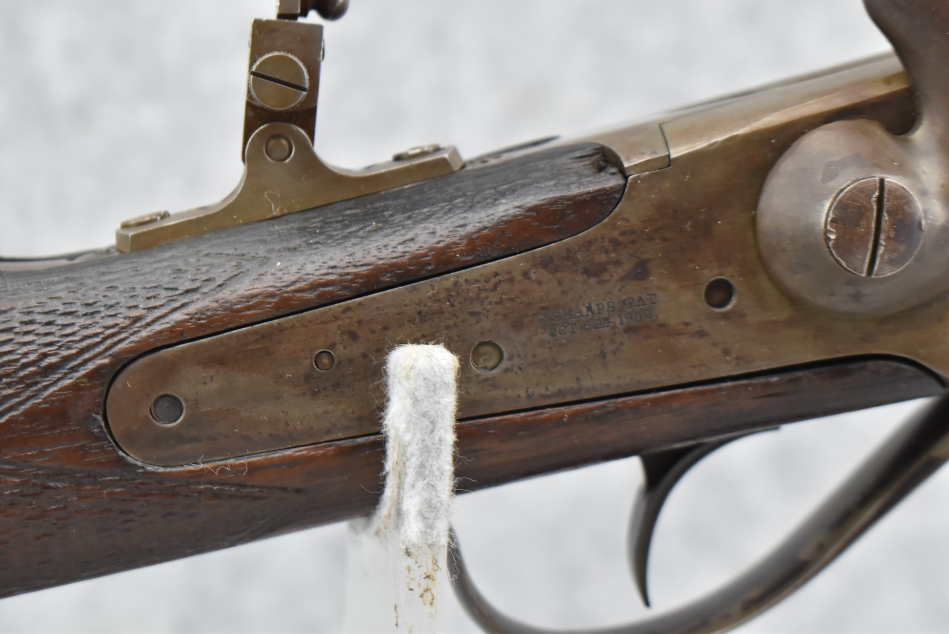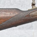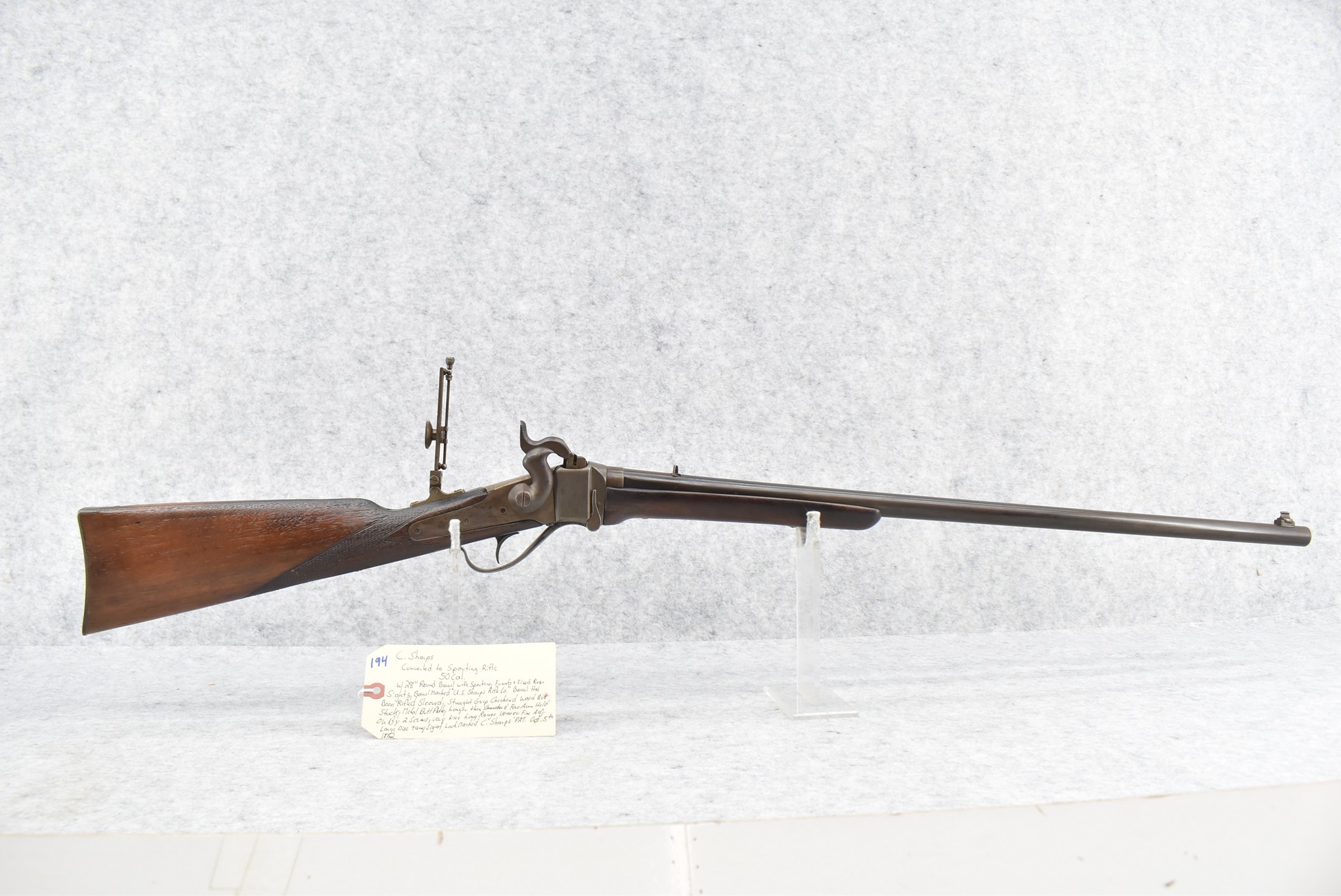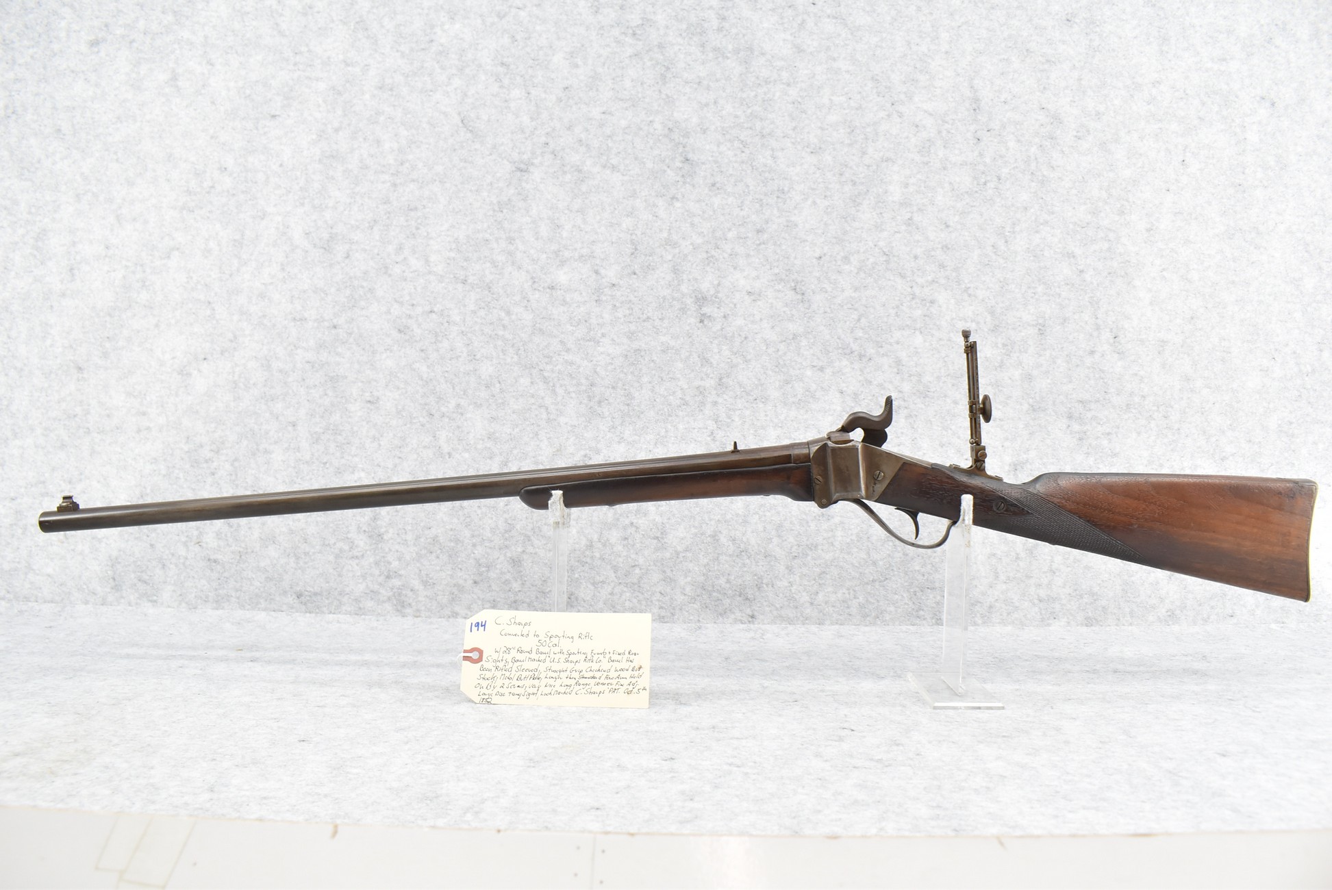 194. C. Sharps – Converted to Sporting Rifle – 50 Cal. – w/28” Round Barrel w/Sporting Front & Fixed Rear Sights – Barrel is Marked “U.S. Sharps Rifle Co.” & Has Been Rifled Sleeved – w/Straight Grip Checkered Wood Butt Stock w/Metal Butt Plate & Longer Then Standard Wood Forearm Held on by 2 Screw – w/Very Nice Long Range Veneer Fine Adj. Large Disc Tang Sight – Lock Marked “C. Sharps” “PAT Oct. 5th 1852”