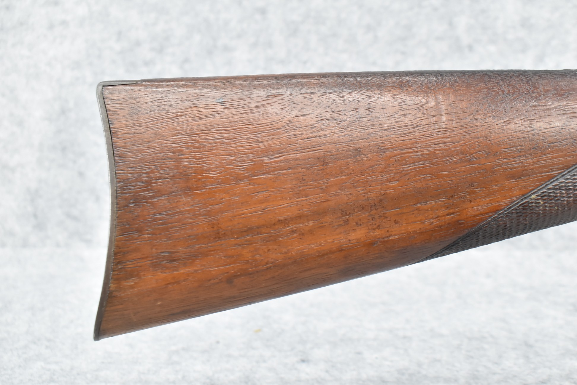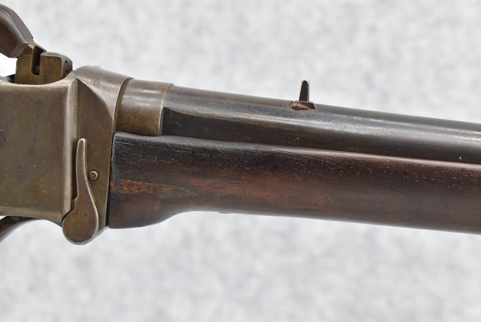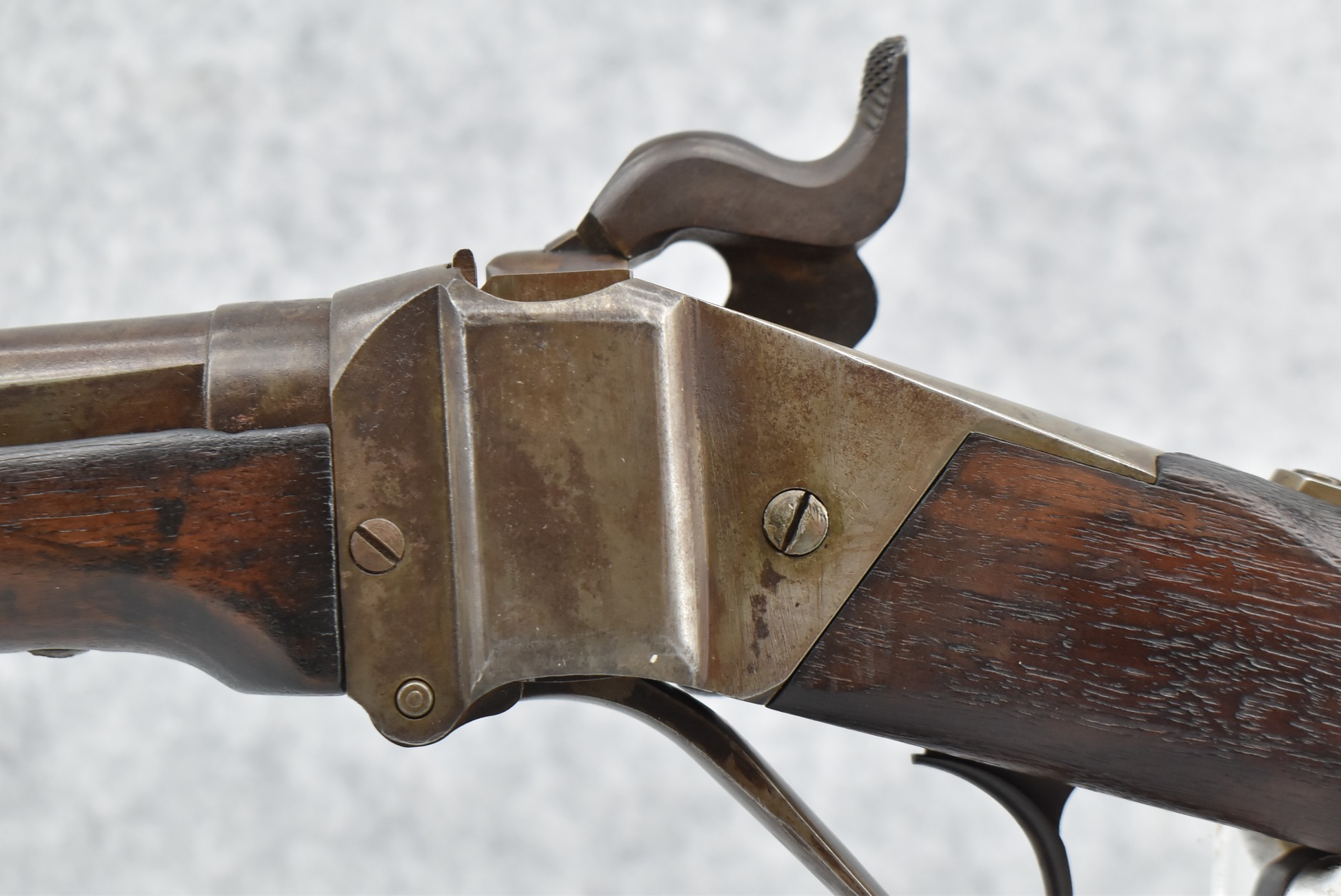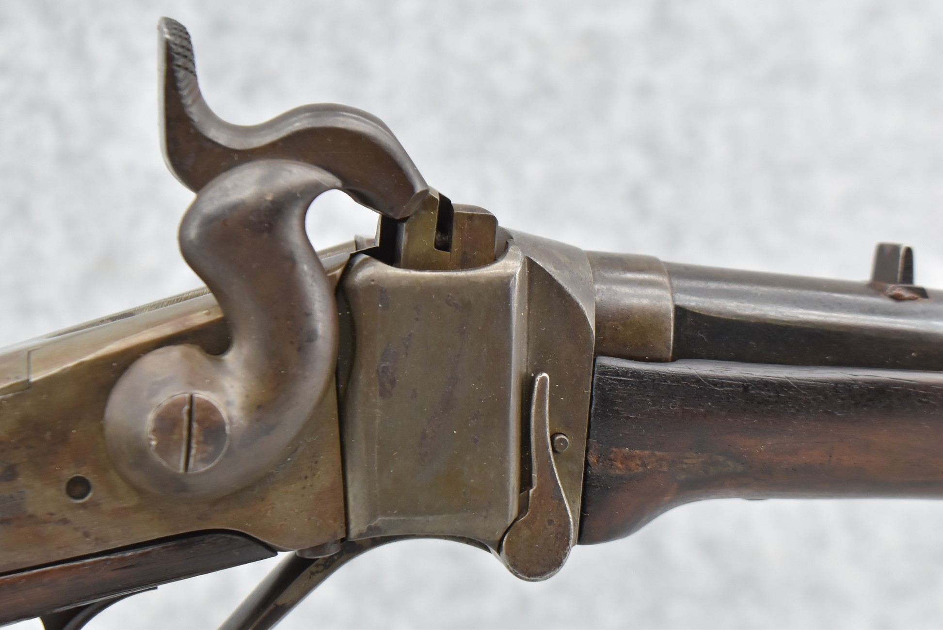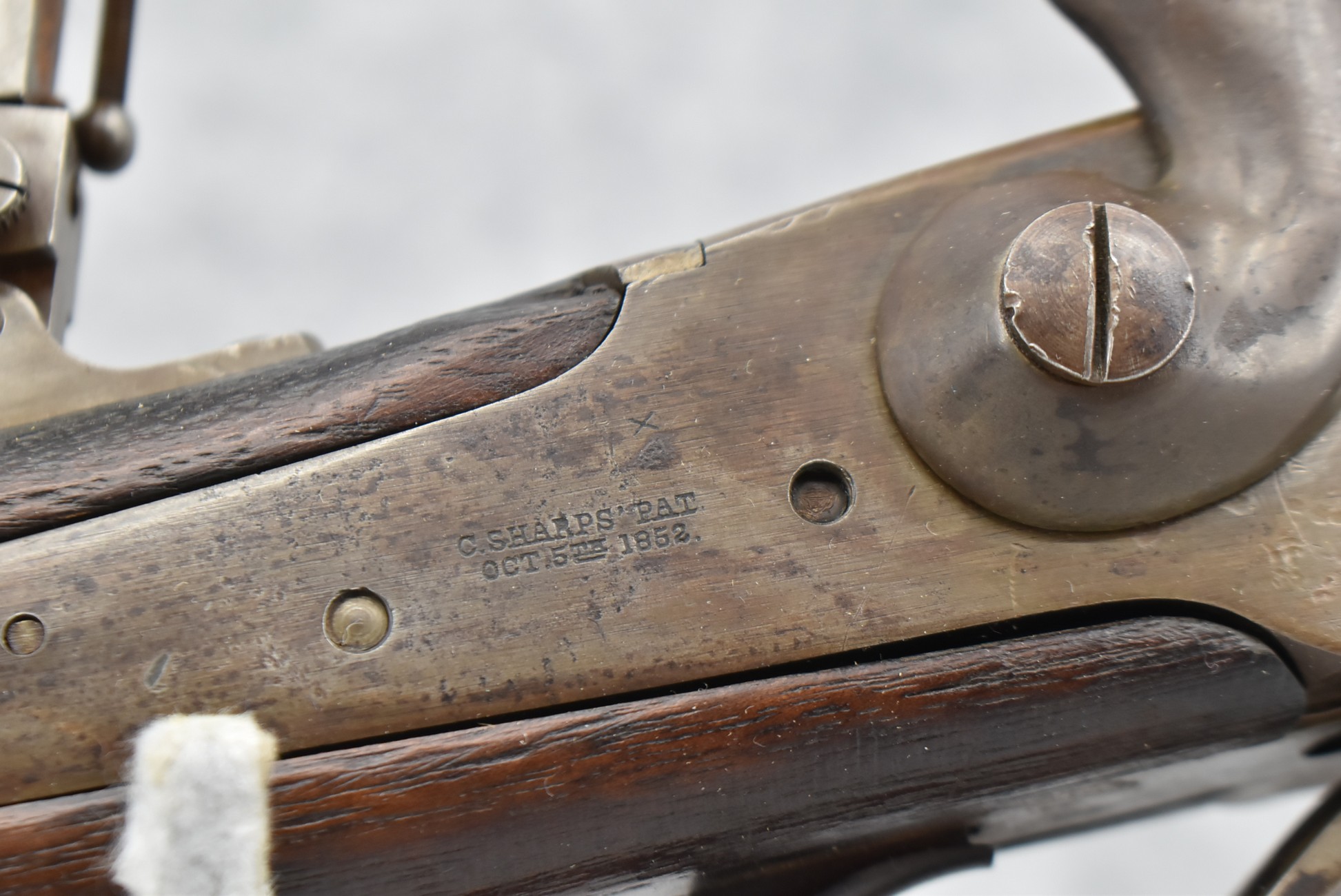 194. C. Sharps – Converted to Sporting Rifle – 50 Cal. – w/28” Round Barrel w/Sporting Front & Fixed Rear Sights – Barrel is Marked “U.S. Sharps Rifle Co.” & Has Been Rifled Sleeved – w/Straight Grip Checkered Wood Butt Stock w/Metal Butt Plate & Longer Then Standard Wood Forearm Held on by 2 Screw – w/Very Nice Long Range Veneer Fine Adj. Large Disc Tang Sight – Lock Marked “C. Sharps” “PAT Oct. 5th 1852”
