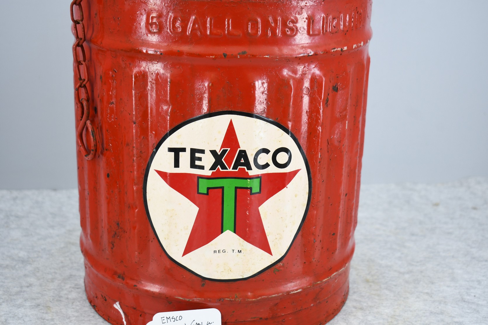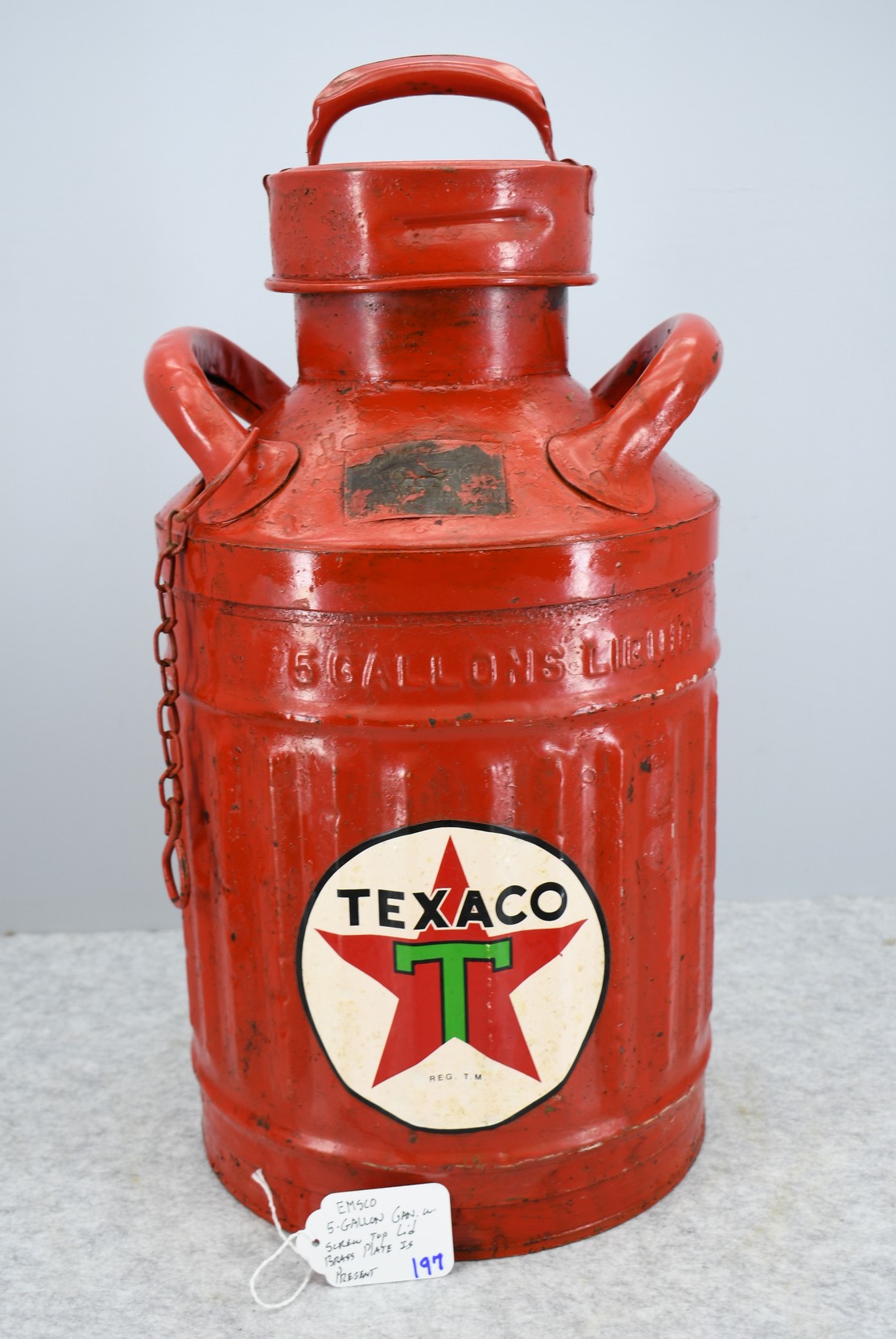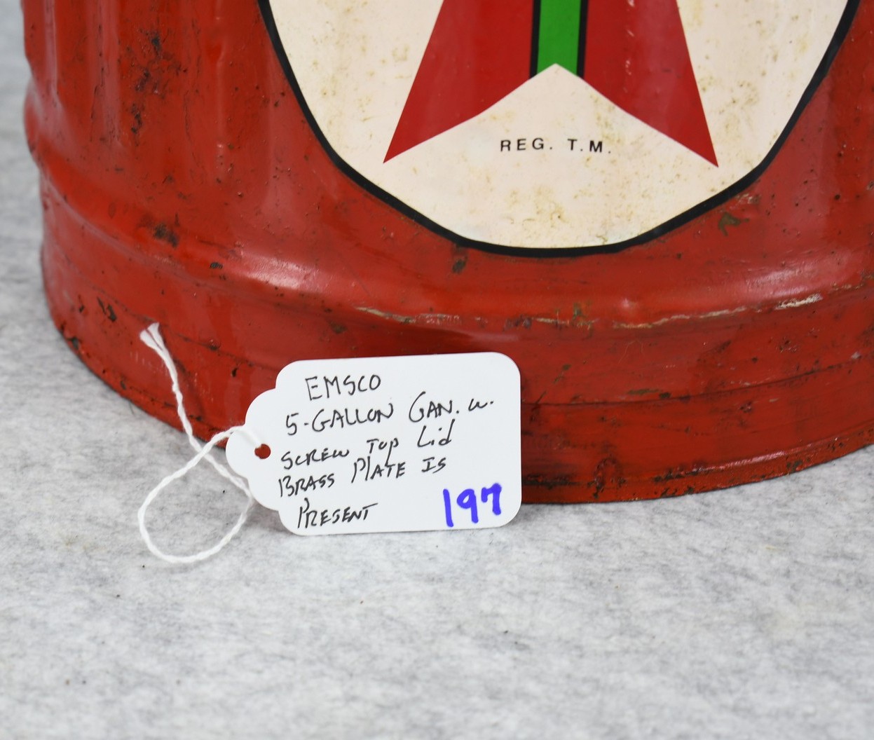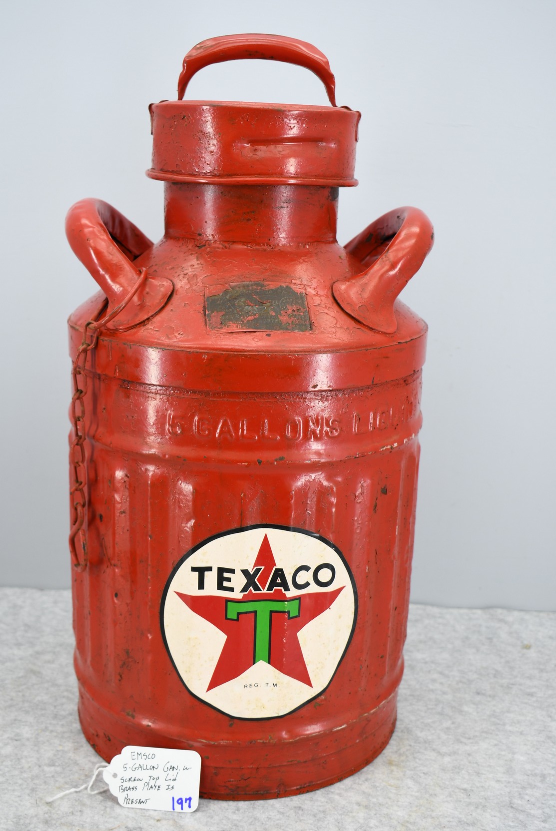 197. EMSCO 5-Gallon Liquid Tin w/Screw Top Lid – Tin has a Texaco Sticker on It – Brass Plate is Present