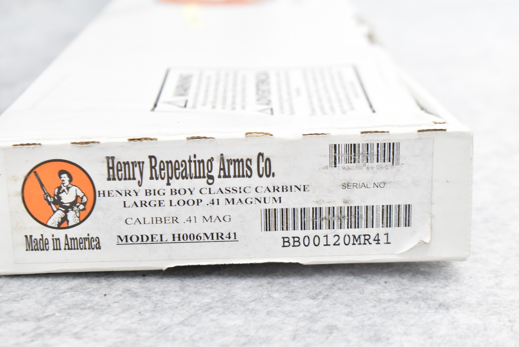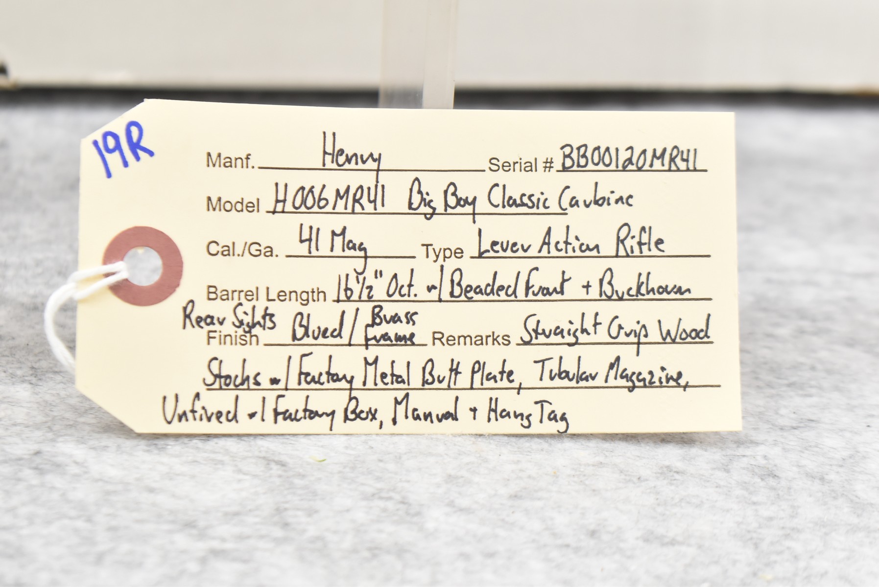19R. Henry – Mod. H006MR41 “Big Boy Classic Carbine” – 41 Mag. Cal. Lever Action Rifle – w/16½” Octagon Barrel w/Beaded Front and Buckhorn Rear Sights – Blued Finish w/Brass Frame – w/Straight Grip Wood Stocks w/Factory Metal Butt Plate – w/Tubular Magazine – Unfired w/Factory Box, Manual, and Hang Tag