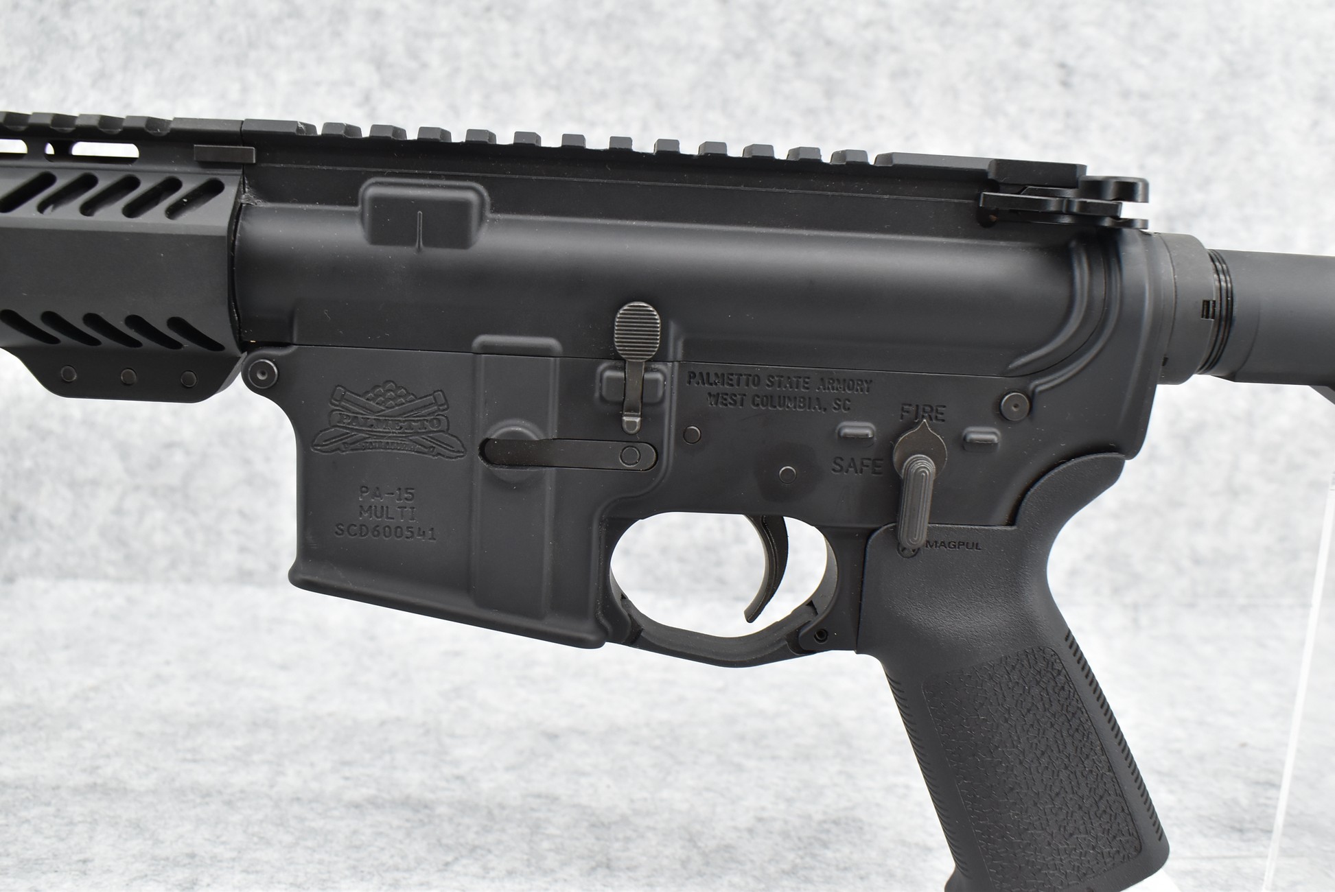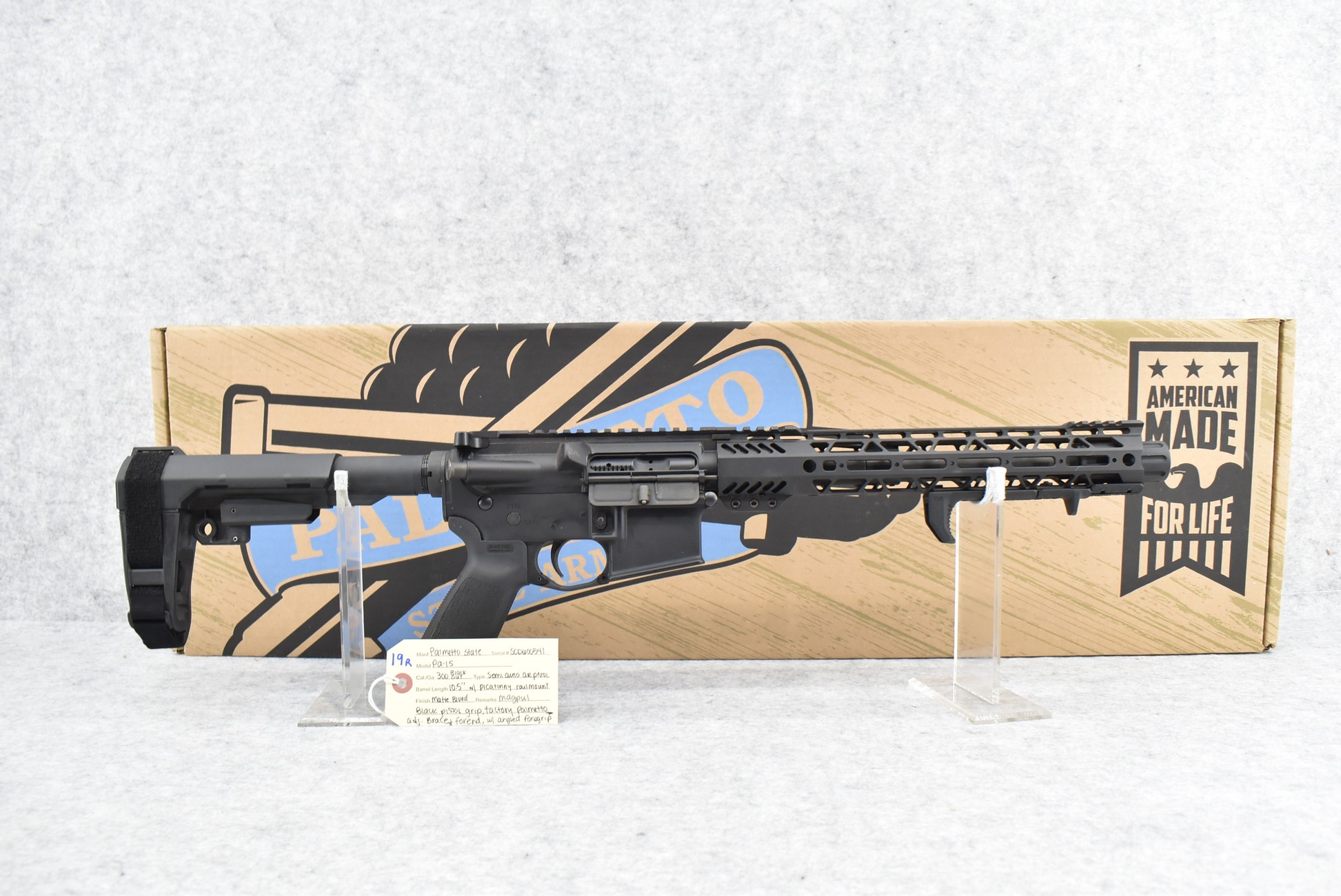 19R. Palmetto State – Mod. PA-15 – 300 Blackout Cal. Semi-Auto AR Pistol – w/10.5” Barrel – Matte Blued Finish – w/MagPul Black Pistol Grip, Factory Palmetto Adj. Brace & Forend w/Angled Foregrip – w/Picatinny Rail Mount – w/Factory Box, Manual & 3 MagPul Mags (Maryland Compliant)