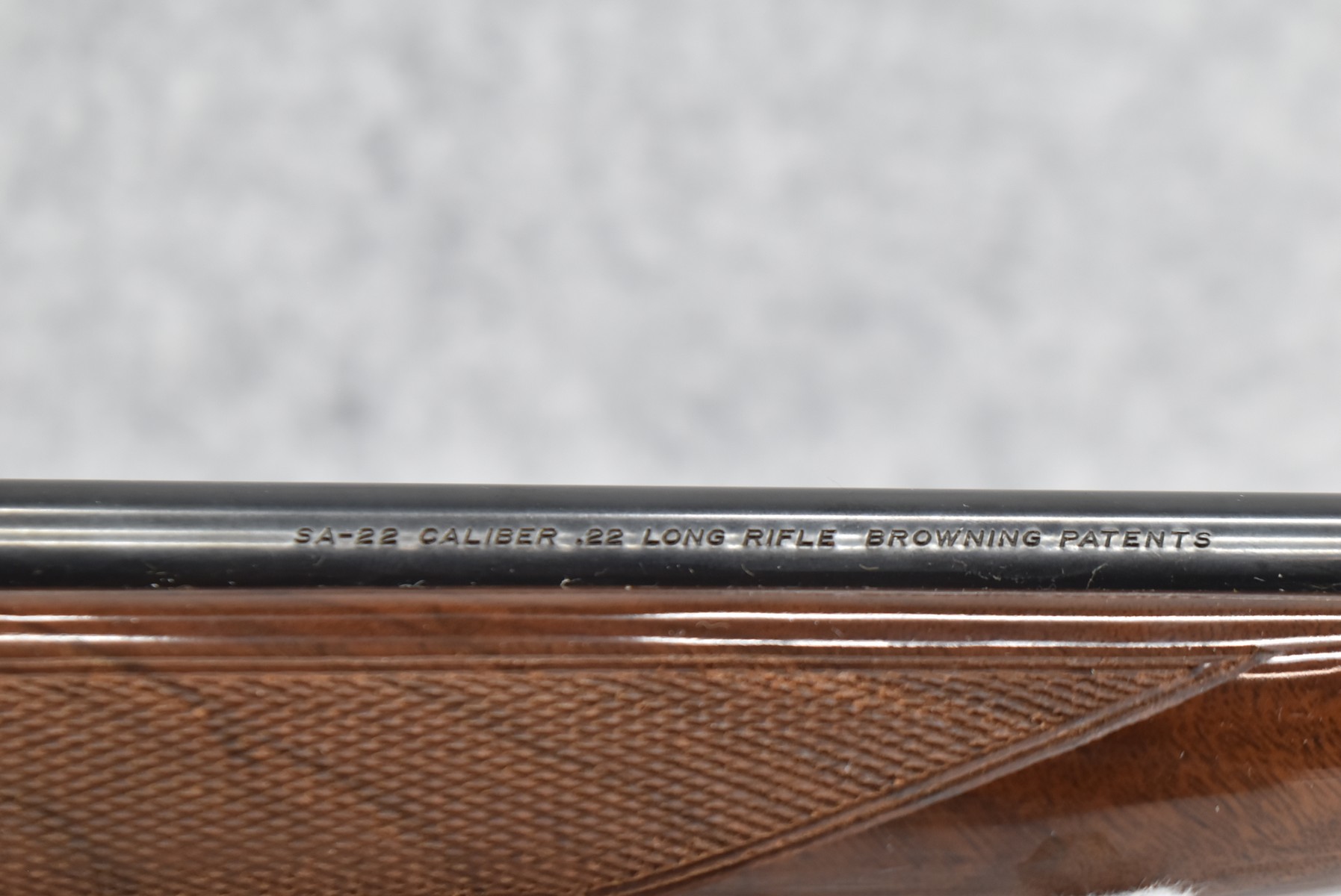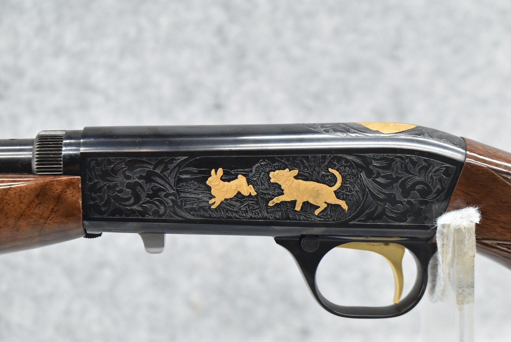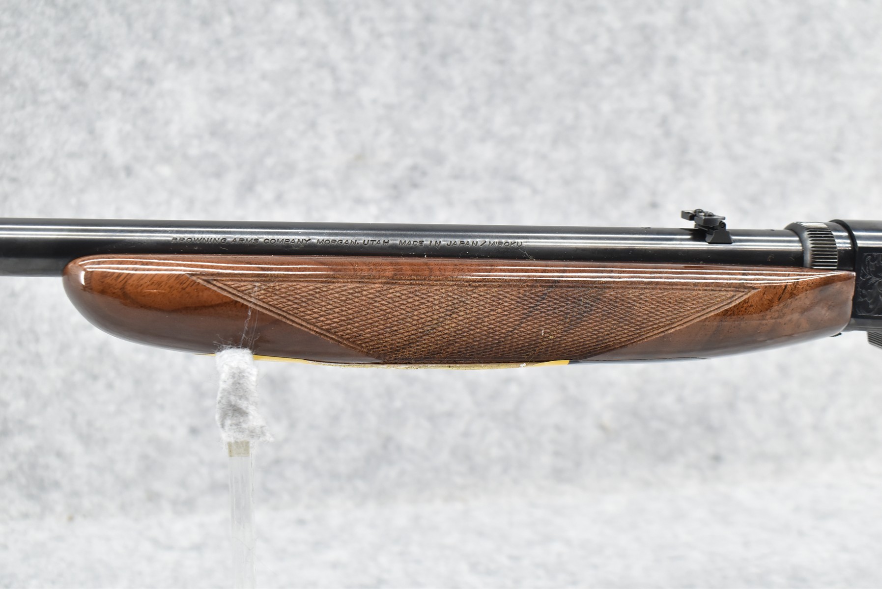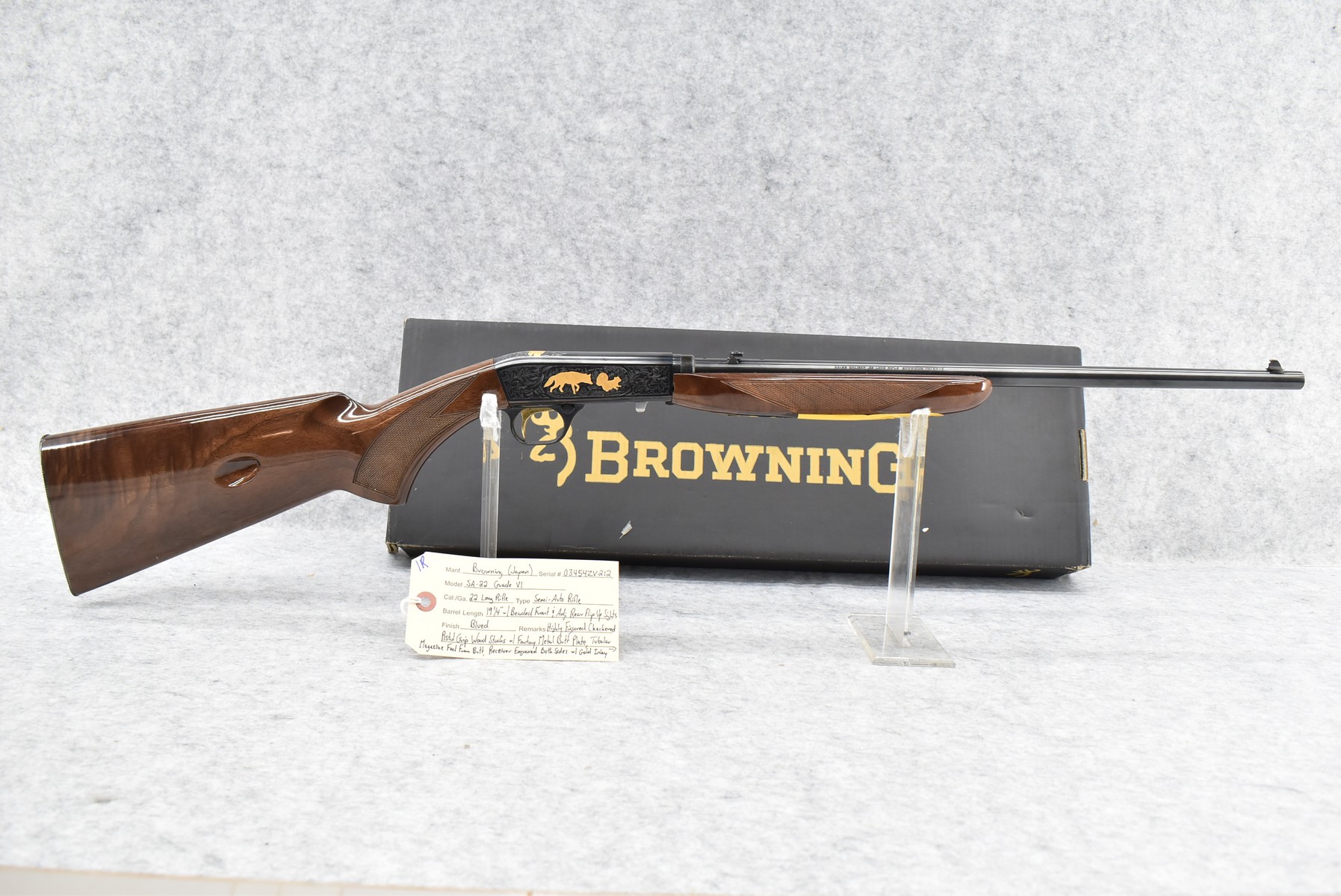 1R. Browning (Japan) – Mod. SA-22 Grade VI – 22LR Cal. Semi-Auto Rifle – w/19¼” Barrel w/Beaded Front and Adjustable Rear Flip-Up Sights – Blued Finish – w/Highly Figured Checkered Pistol Grip Wood Stocks w/Factory Metal Butt Plate – w/Tubular Magazine Fed from Butt Stock – Receiver Engraved on Both Sides w/Gold Inlay of Fox, Squirrel, Game Birds, and Bird Dog Scenes – Unfired w/Factory Box and Manual – New for 1987!