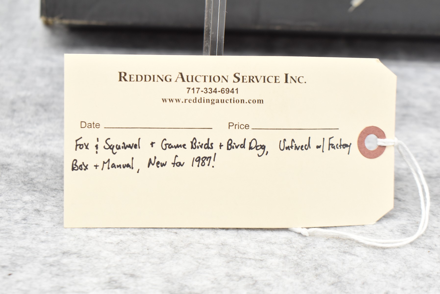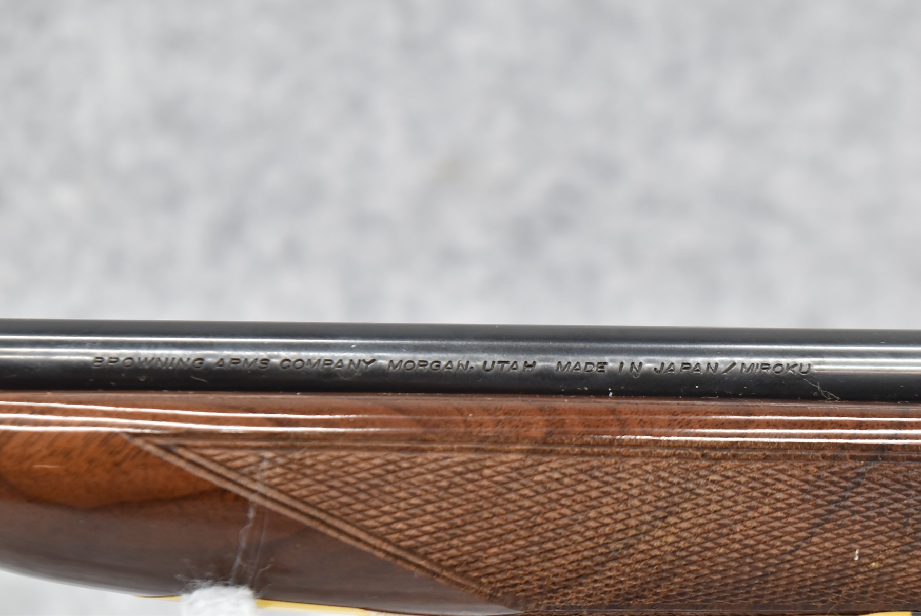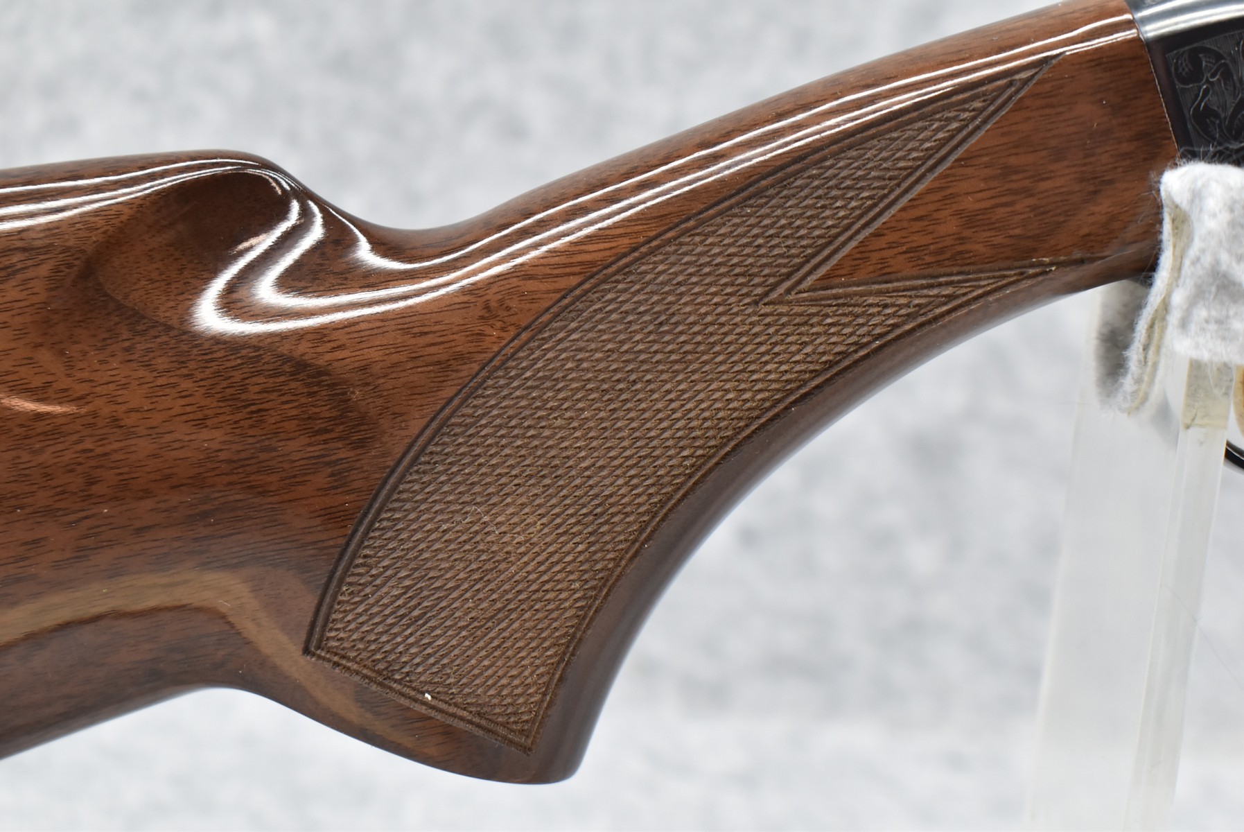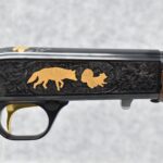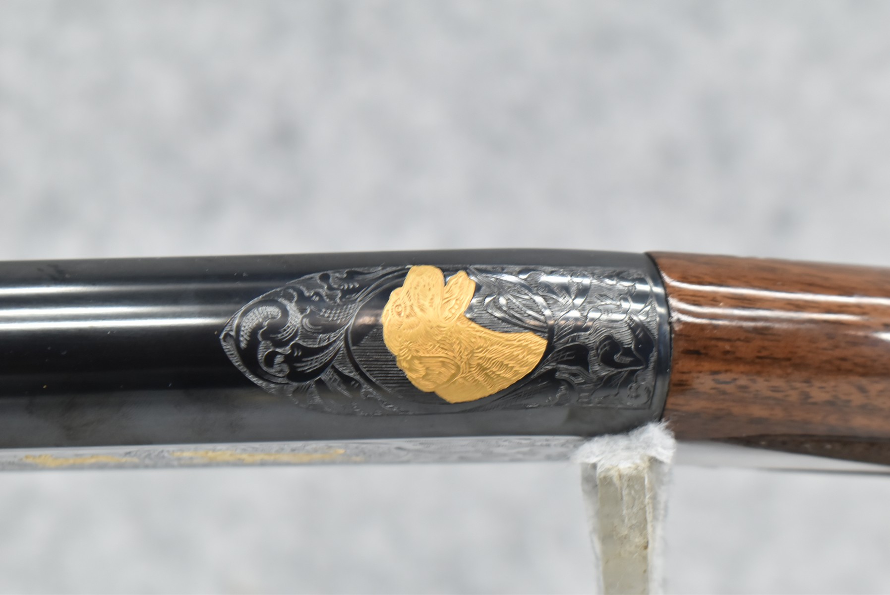 1R. Browning (Japan) – Mod. SA-22 Grade VI – 22LR Cal. Semi-Auto Rifle – w/19¼” Barrel w/Beaded Front and Adjustable Rear Flip-Up Sights – Blued Finish – w/Highly Figured Checkered Pistol Grip Wood Stocks w/Factory Metal Butt Plate – w/Tubular Magazine Fed from Butt Stock – Receiver Engraved on Both Sides w/Gold Inlay of Fox, Squirrel, Game Birds, and Bird Dog Scenes – Unfired w/Factory Box and Manual – New for 1987!