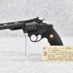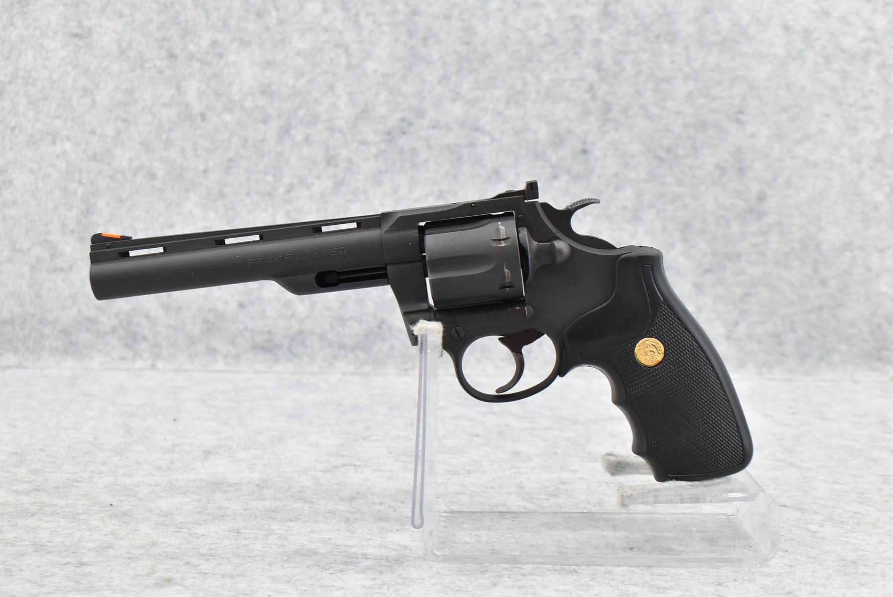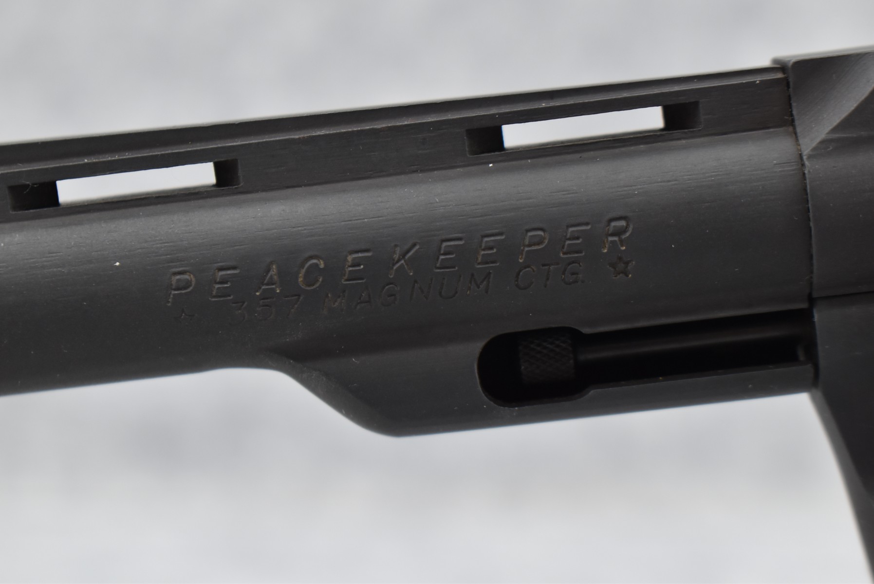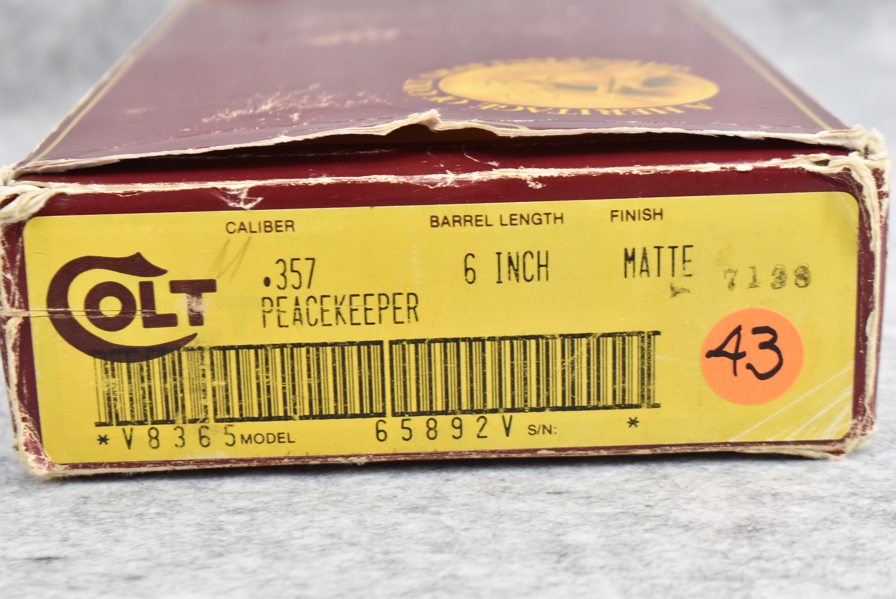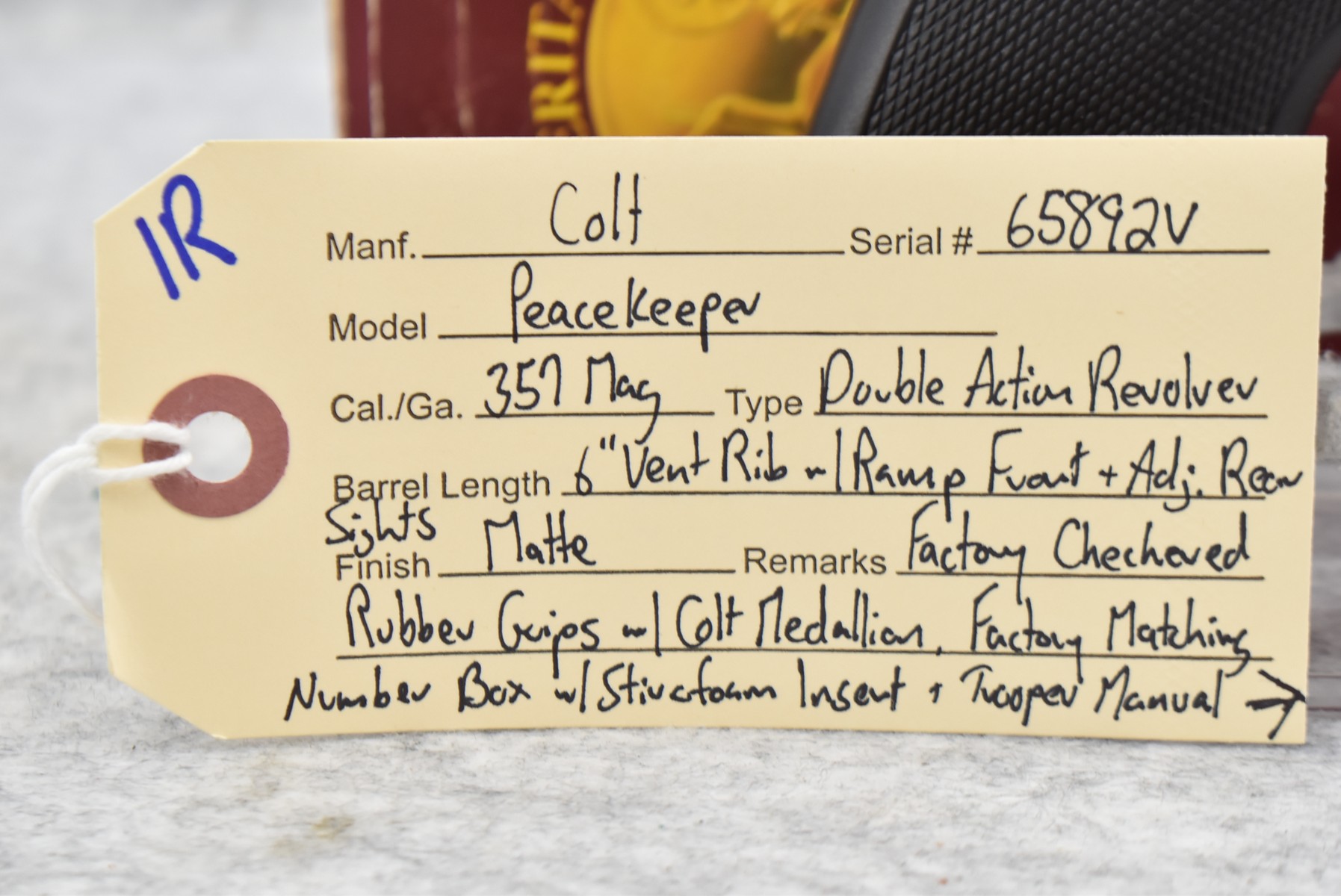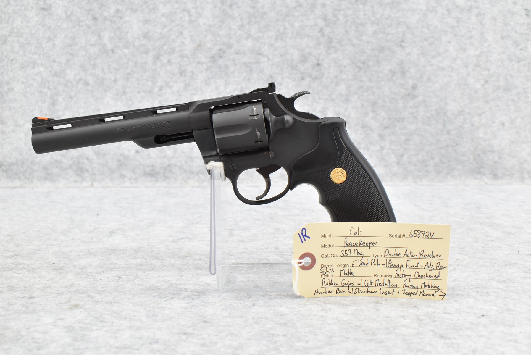 1R.         Colt – Mod. Peacekeeper – 357 Mag. Cal. Double Action Revolver – w/6” Vent Rib Barrel w/Ramp Front and Adjustable Rear Sights – Matte Blued Finish – w/Factory Checkered Rubber Grips w/Colt Medallion – w/Factory Matching Numbered Box w/Styrofoam Insert and Trooper Manual – These Revolver were Only Manufactured from 1985-1989!