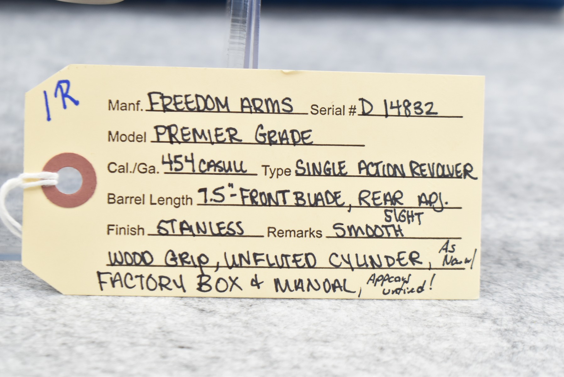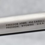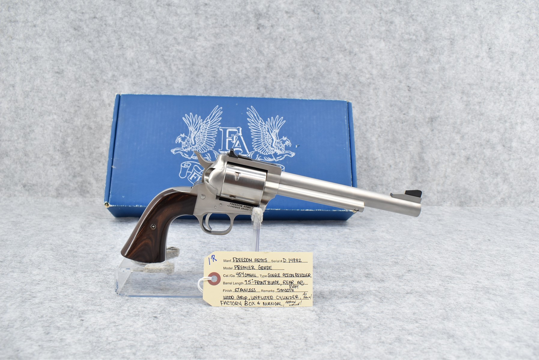 1R. Freedom Arms – Mod. Premier Grade – 454 Casull Cal. Single Action Revolver – w/7.5” Barrel w/Front Blade & Rear Adj. Sights – Stainless Finish – w/Smooth Wood Grip – w/Unfluted Cylinder – Appears Unfired, As New w/Factory Box & Manual