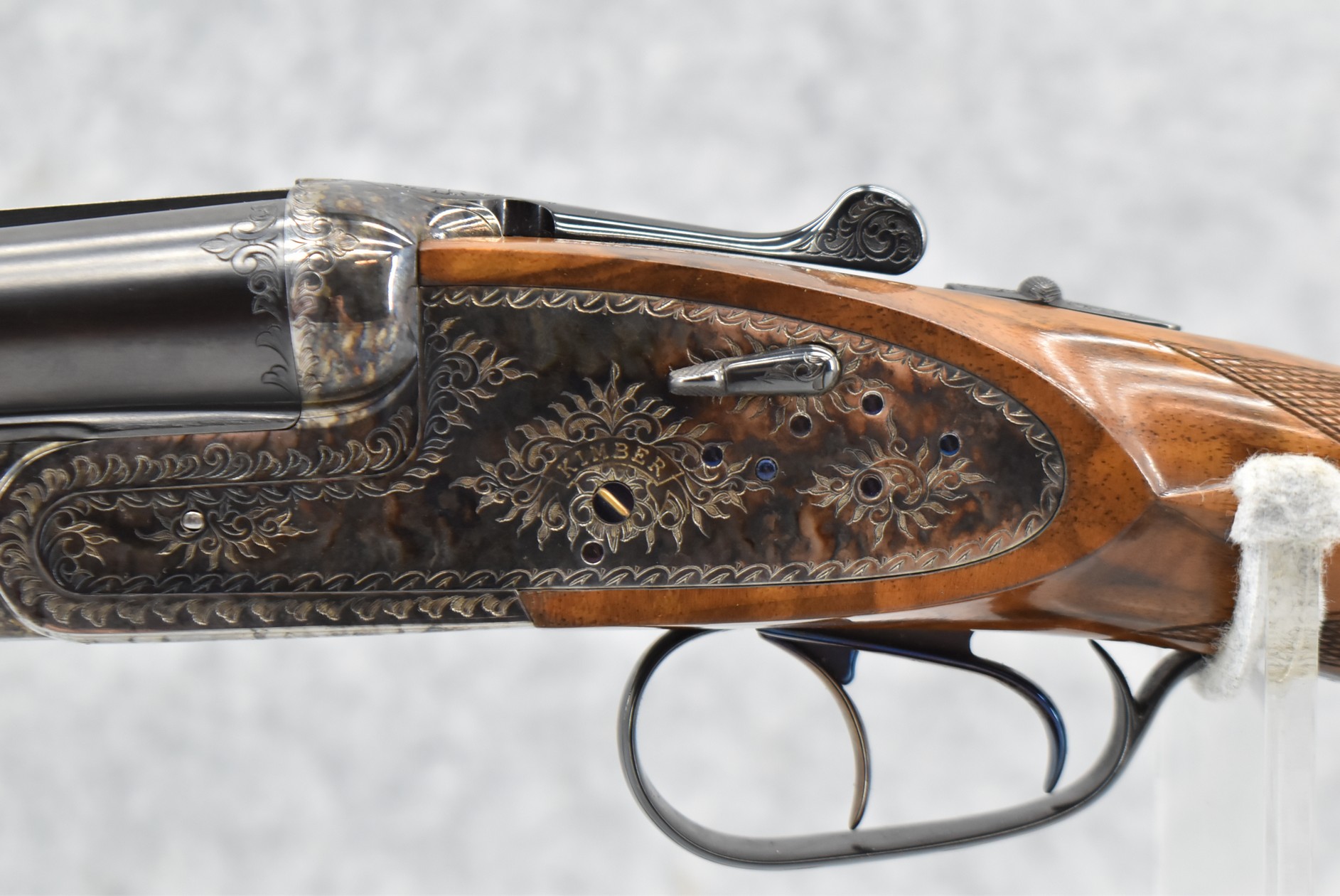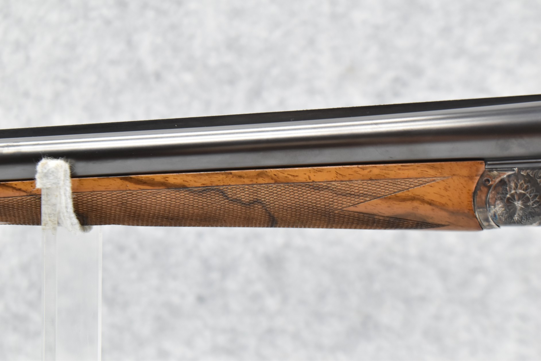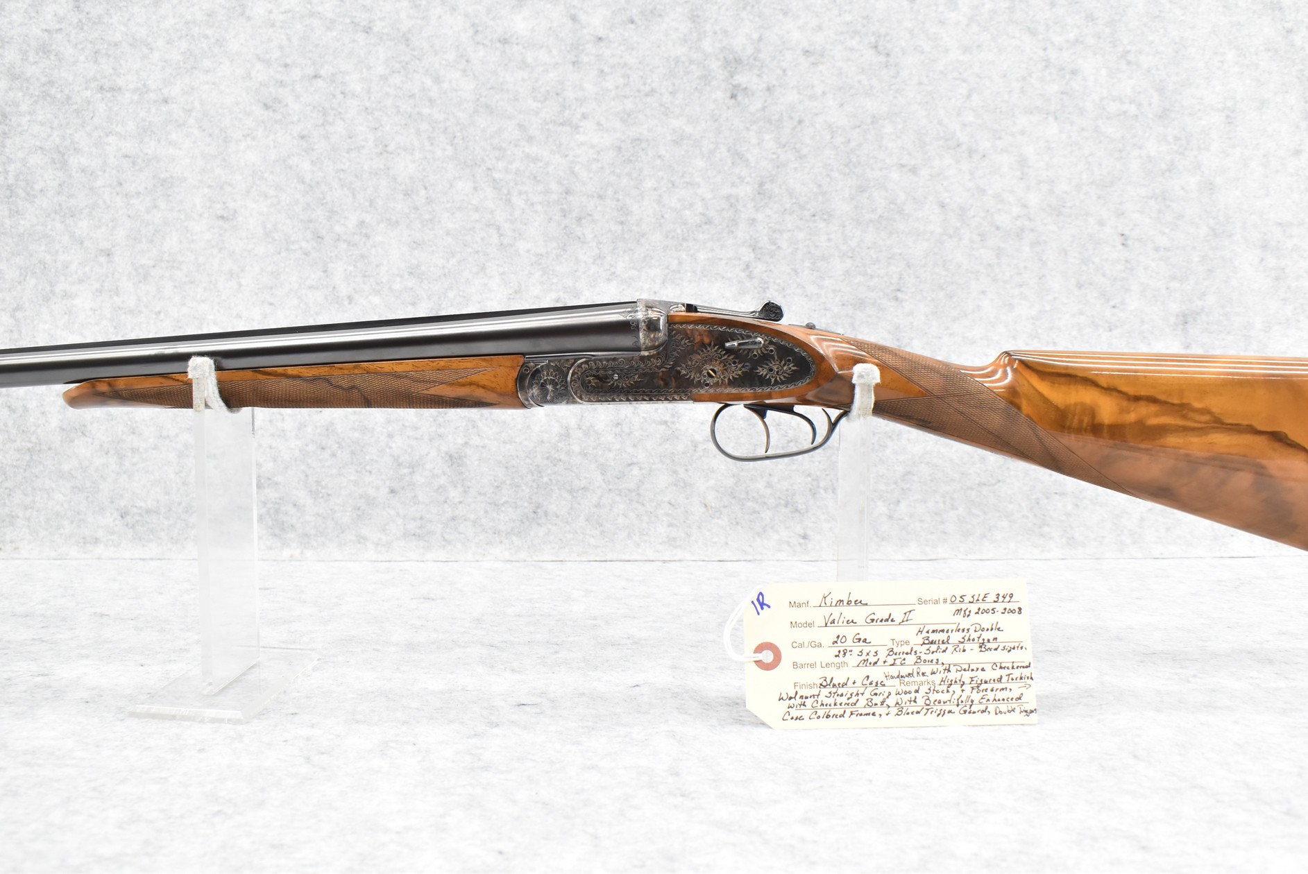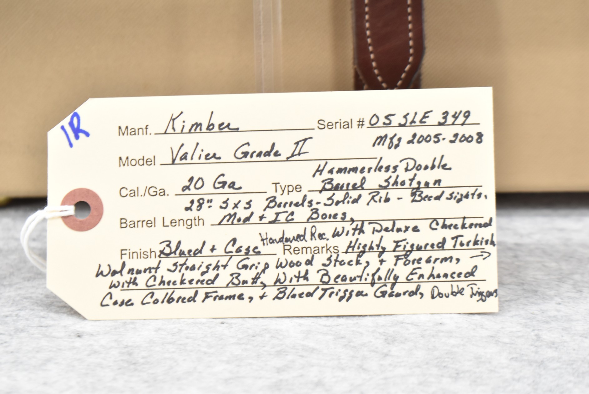 1R. Kimber – Mod. Valier Grade II – 20ga. Hammerless Double Barrel Shotgun – w/28” Mod. & IC Choked, Solid Rib Barrels w/Front Bead Sight – Blued Finish w/Beautifully Engraved Case Hardened Receiver – w/Deluxe Checkered Highly Figured Turkish Walnut Straight Grip Wood Stocks w/Checkered Wood Butt Plate – w/Double Triggers – w/Factory Kimber Canvas/Leather Takedown Case – Mfg. 2005-2008