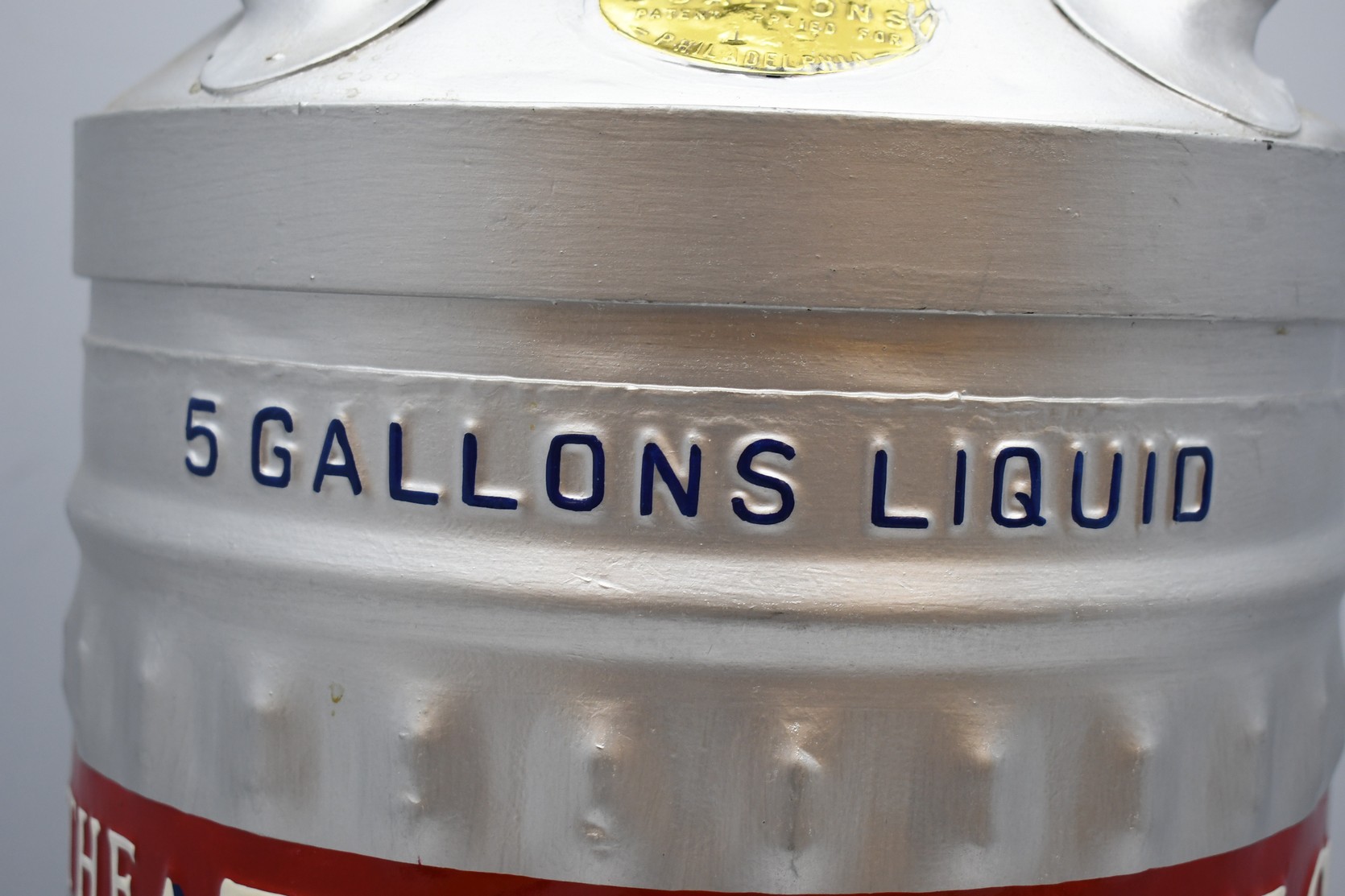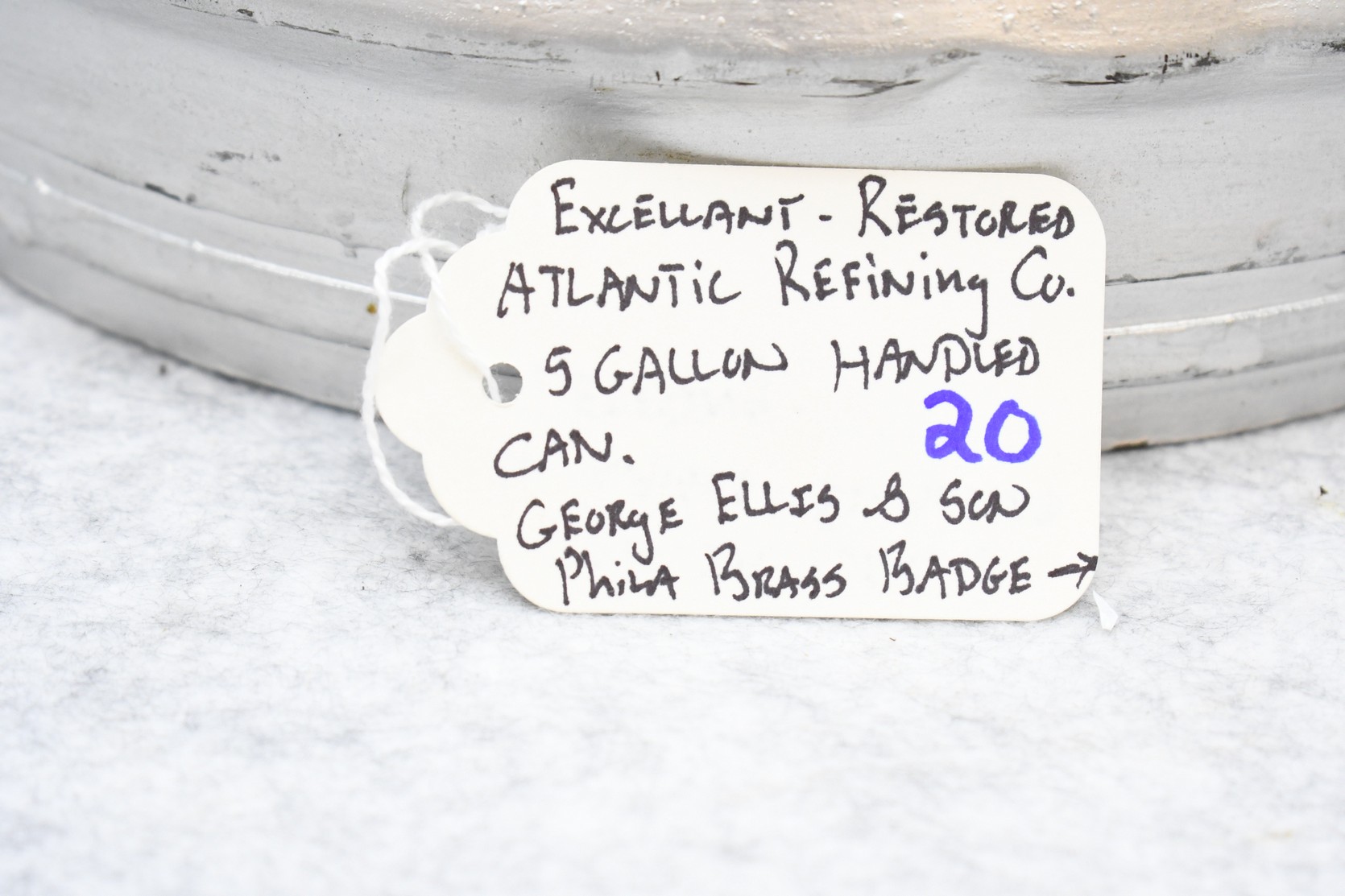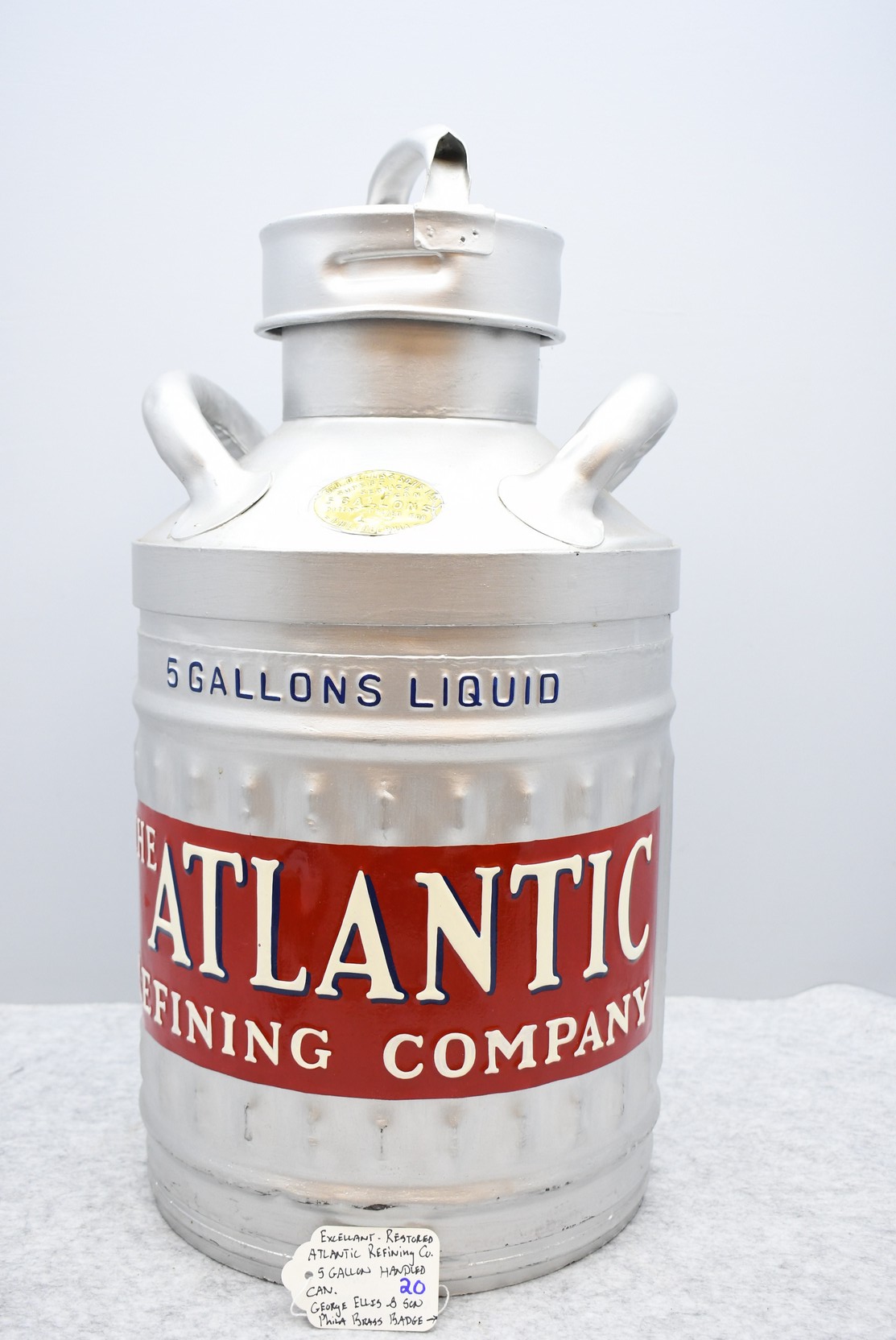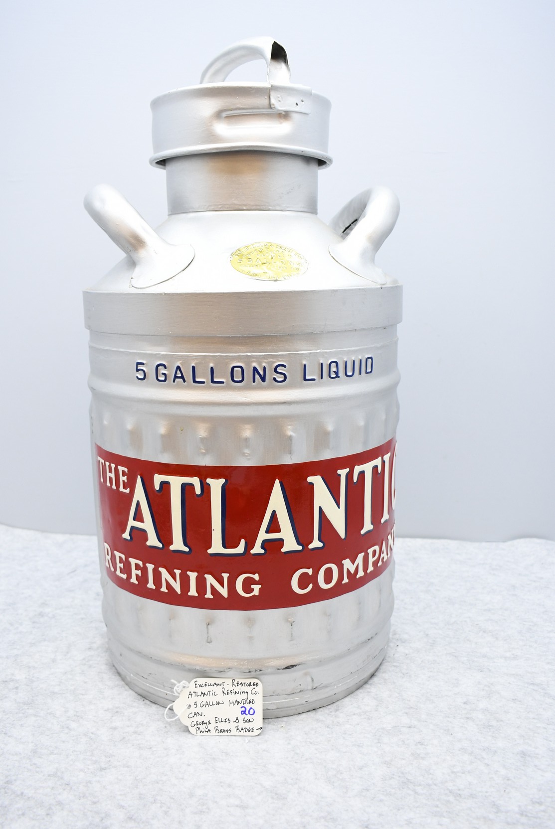 20.      Professionally Restored Atlantic Refining Co. 5-Gallon Can – Brass Badge Reads “George Ellis & Sons, Phila.” – Can is Correct w/Raised and Embossed Lettering – 22” High x 10” Wide