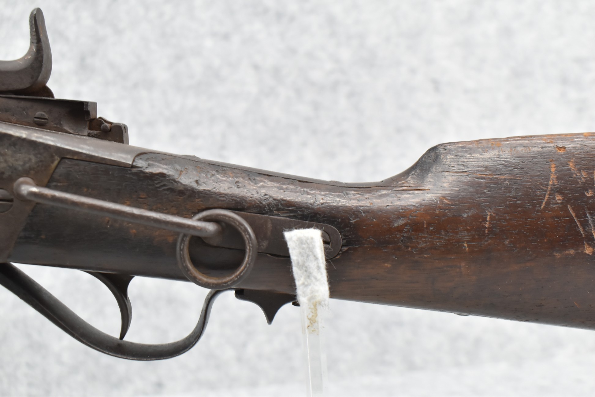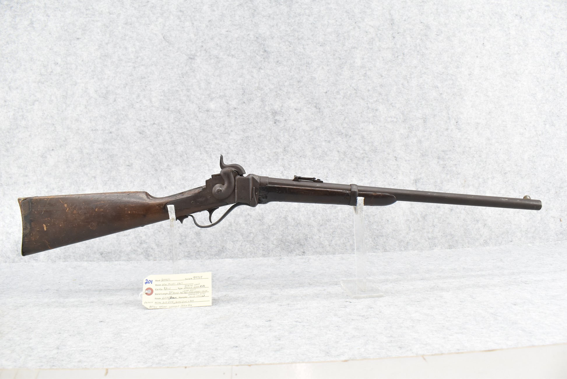 201. C. Sharps – New Model 1863 – 52 Cal. Single Shot Falling Block Rifle – w/22” Round Barrel w/Blade Front & Adj. Rear Ladder Sights – Brown/Gray Finish – w/Straight Grip Wood Stocks w/Factory Metal Butt Plate – w/Sling Ring & Bar – Approx. 44,000 Mfg. Without Patch Box – Attic Find!