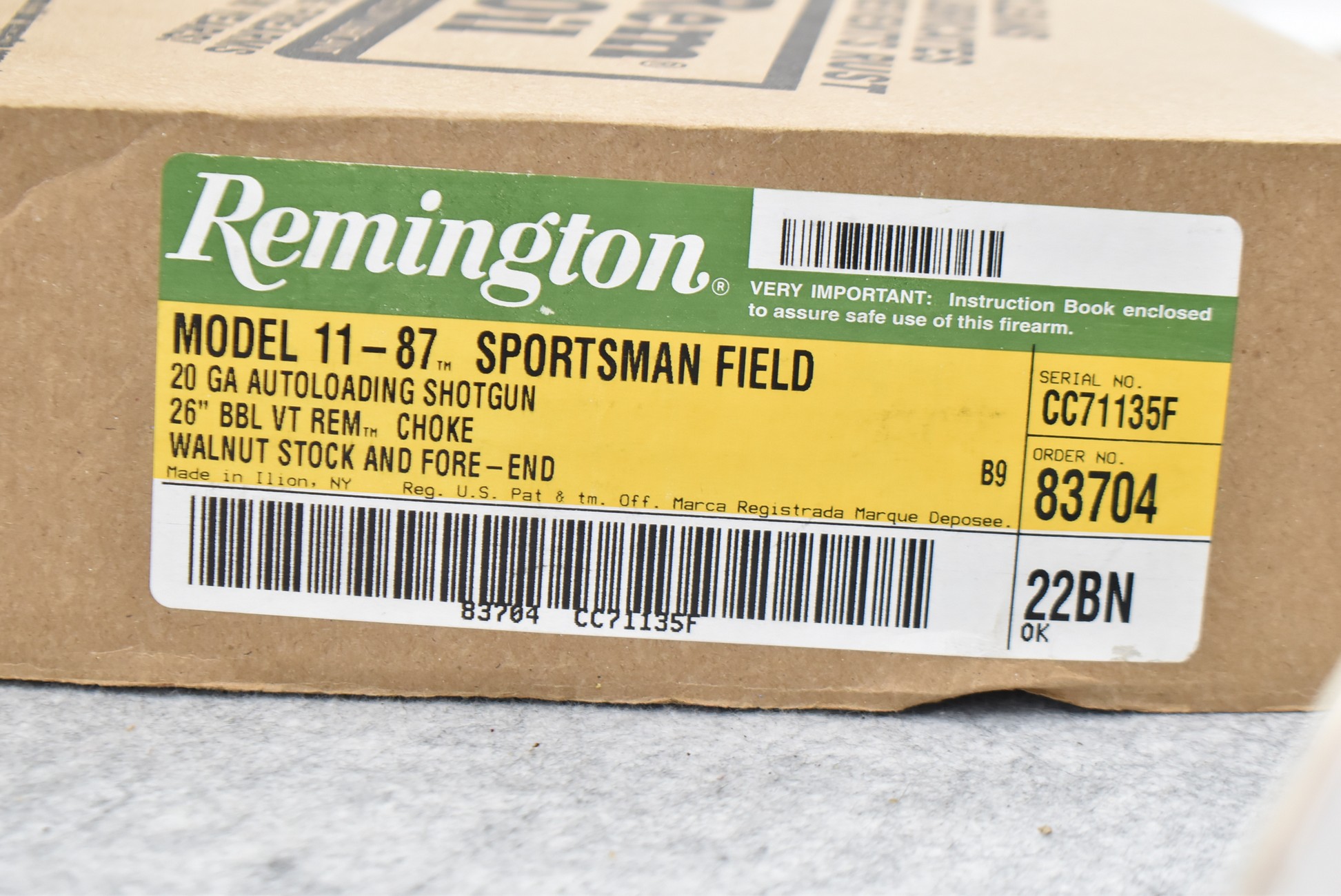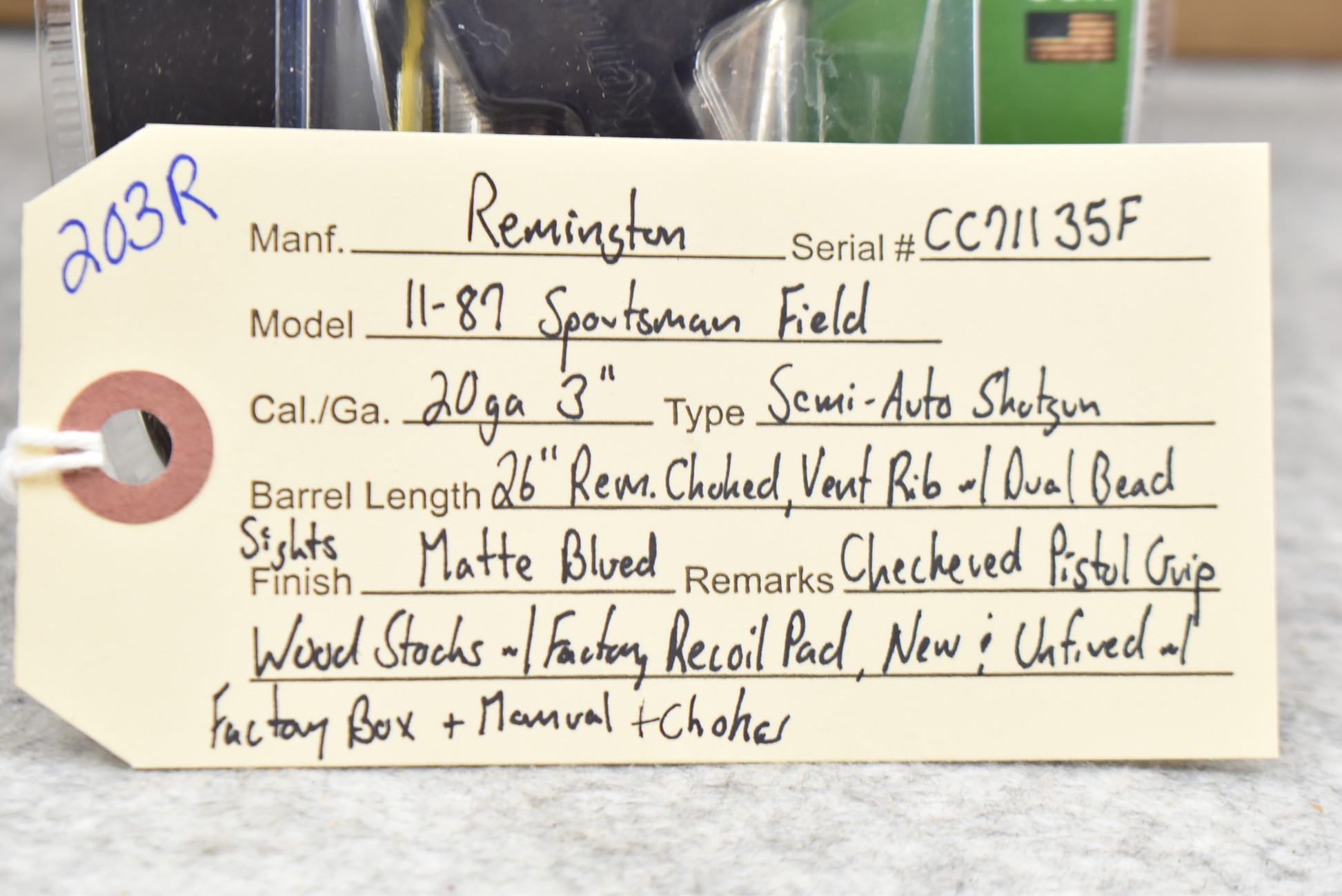 203R. Remington – Mod. 11-87 Sportsman Field – 20ga. 3” Semi-Auto Shotgun – w/26” Rem. Choked, Vent-Rib Barrel w/Dual Bead Sights – Matte Blued Finish – w/Checkered Pistol Grip Wood Stocks w/Factory Recoil Pad – New & Unfired w/Factory Box, Manual & Chokes