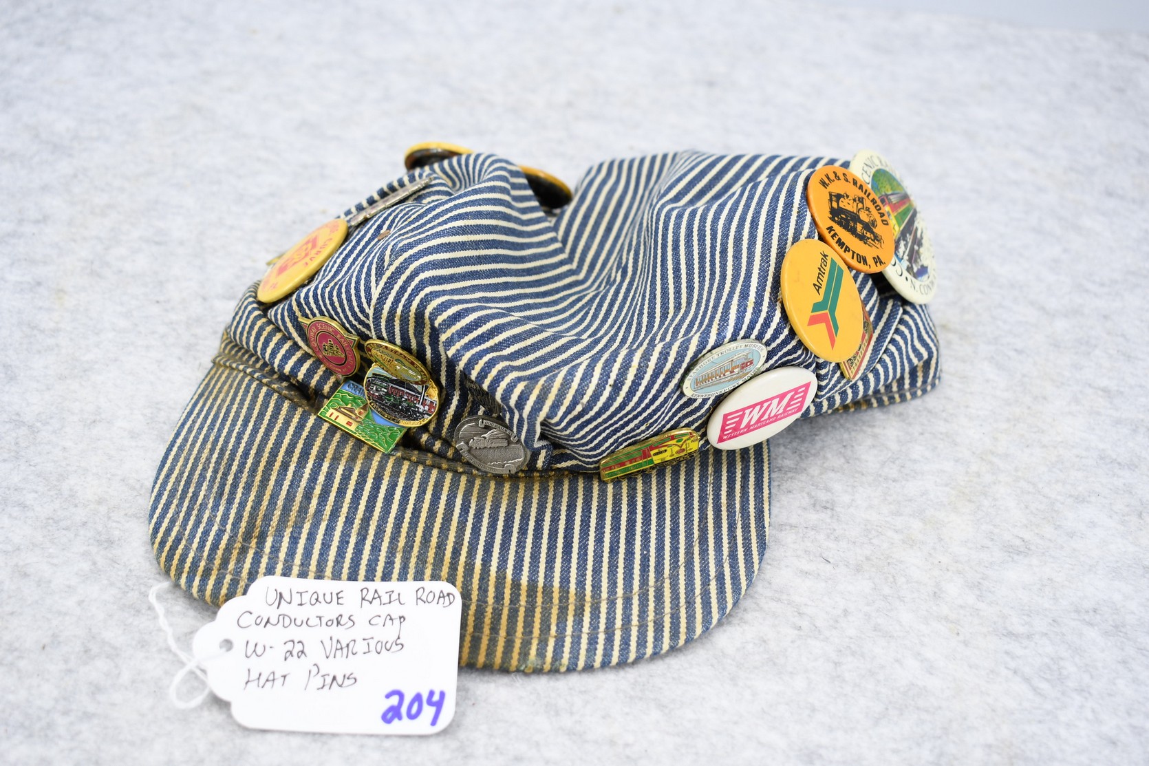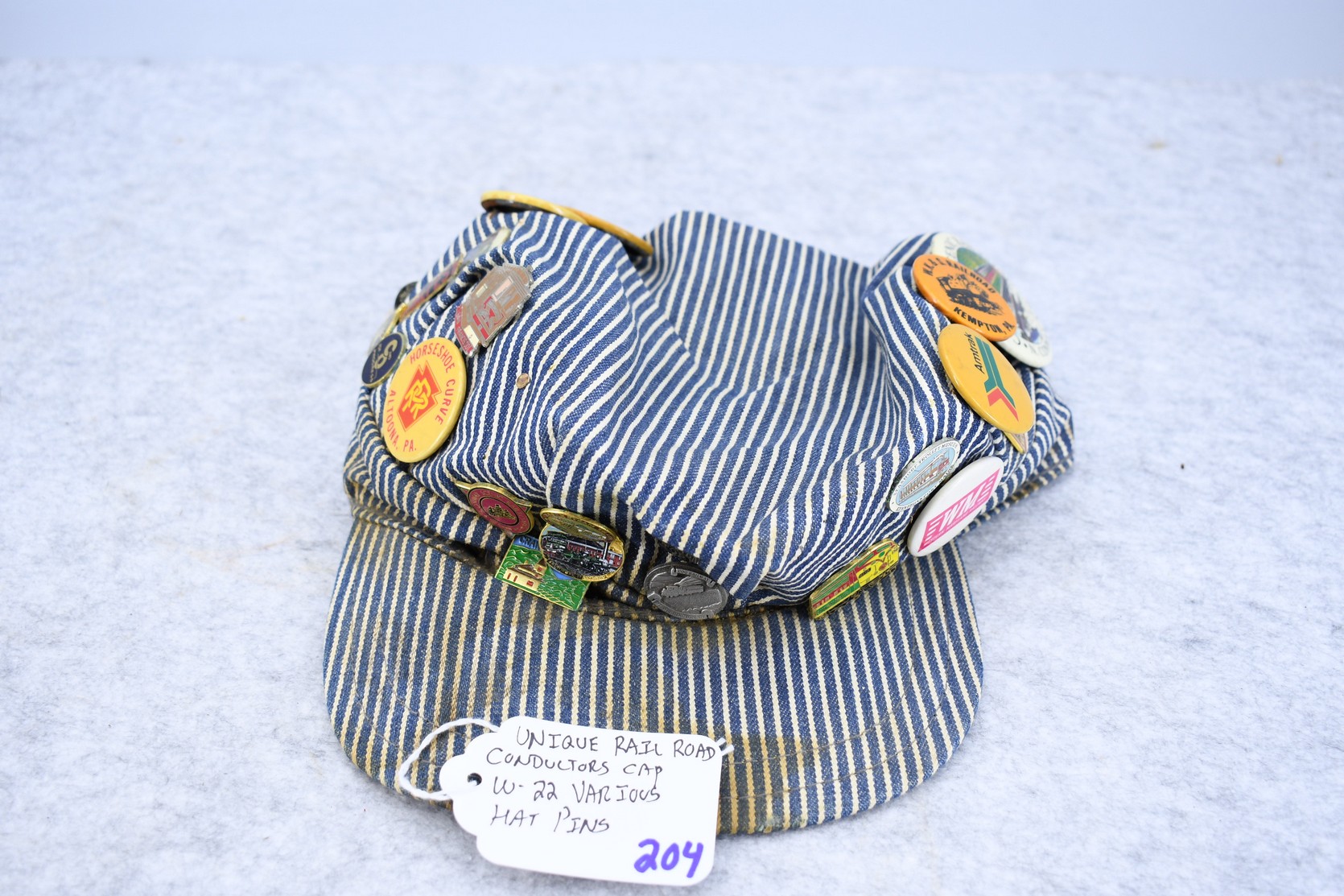 204. Unique Railroad Conductor Cap – Cap has 22 Various Railroading Hat Pins on It