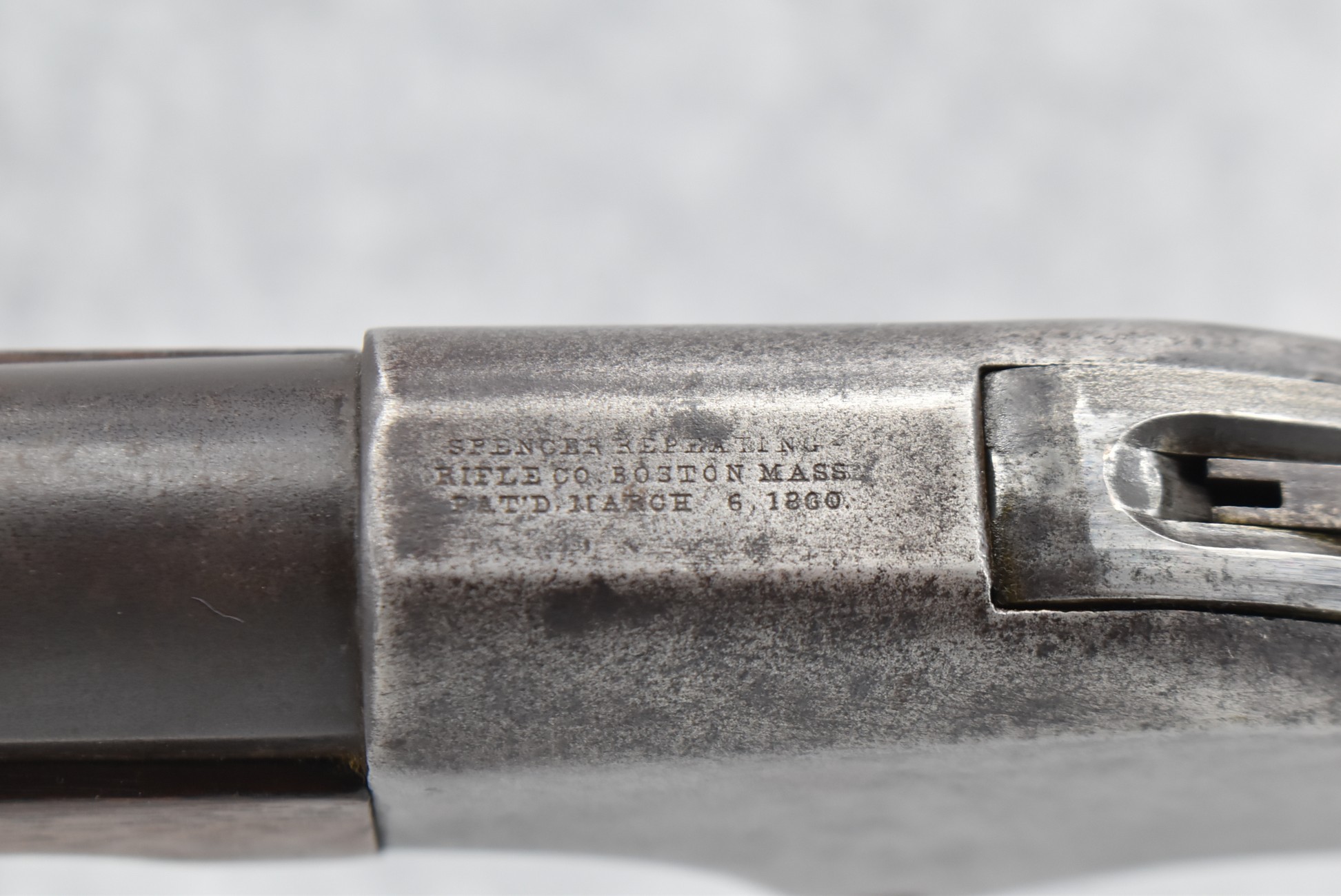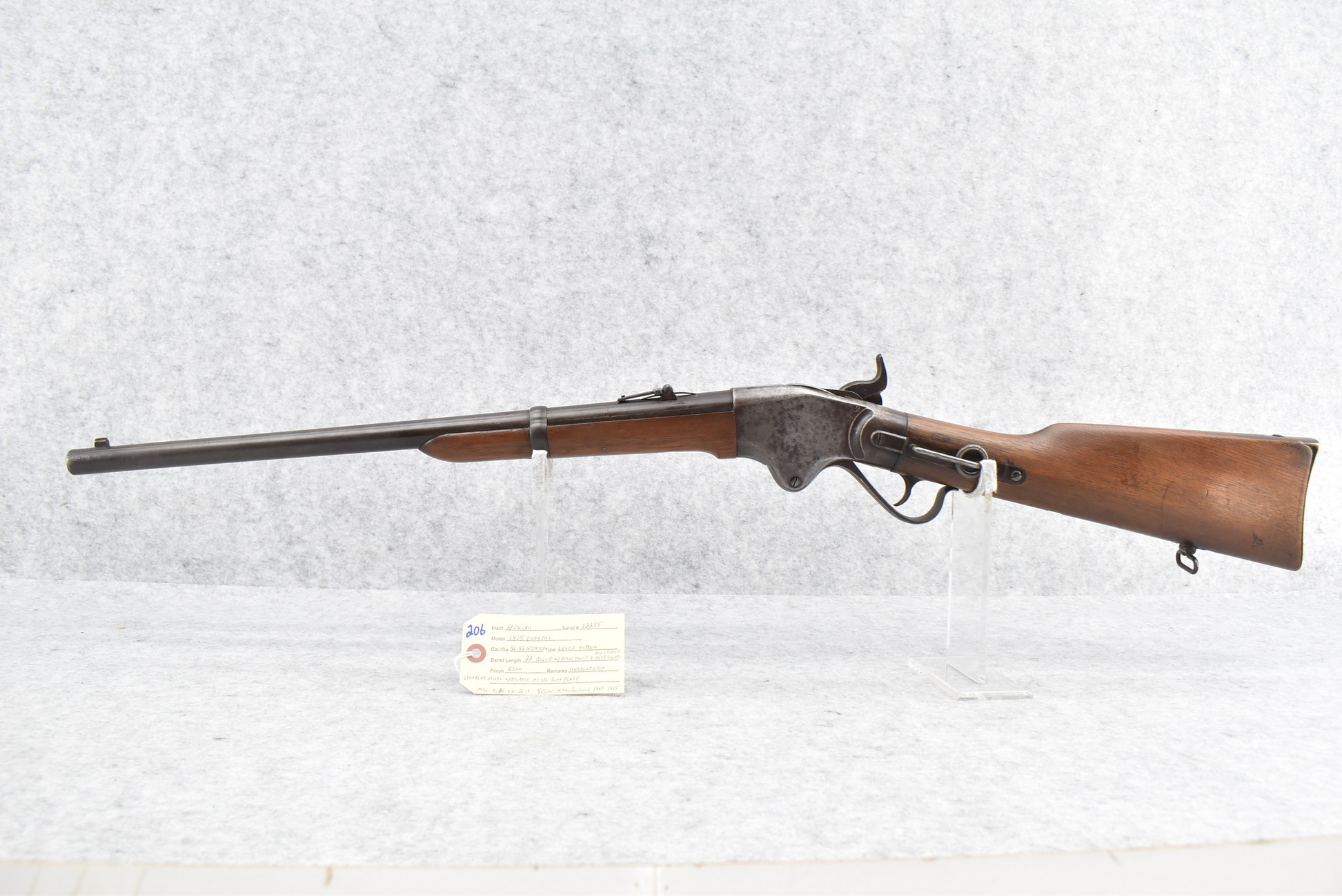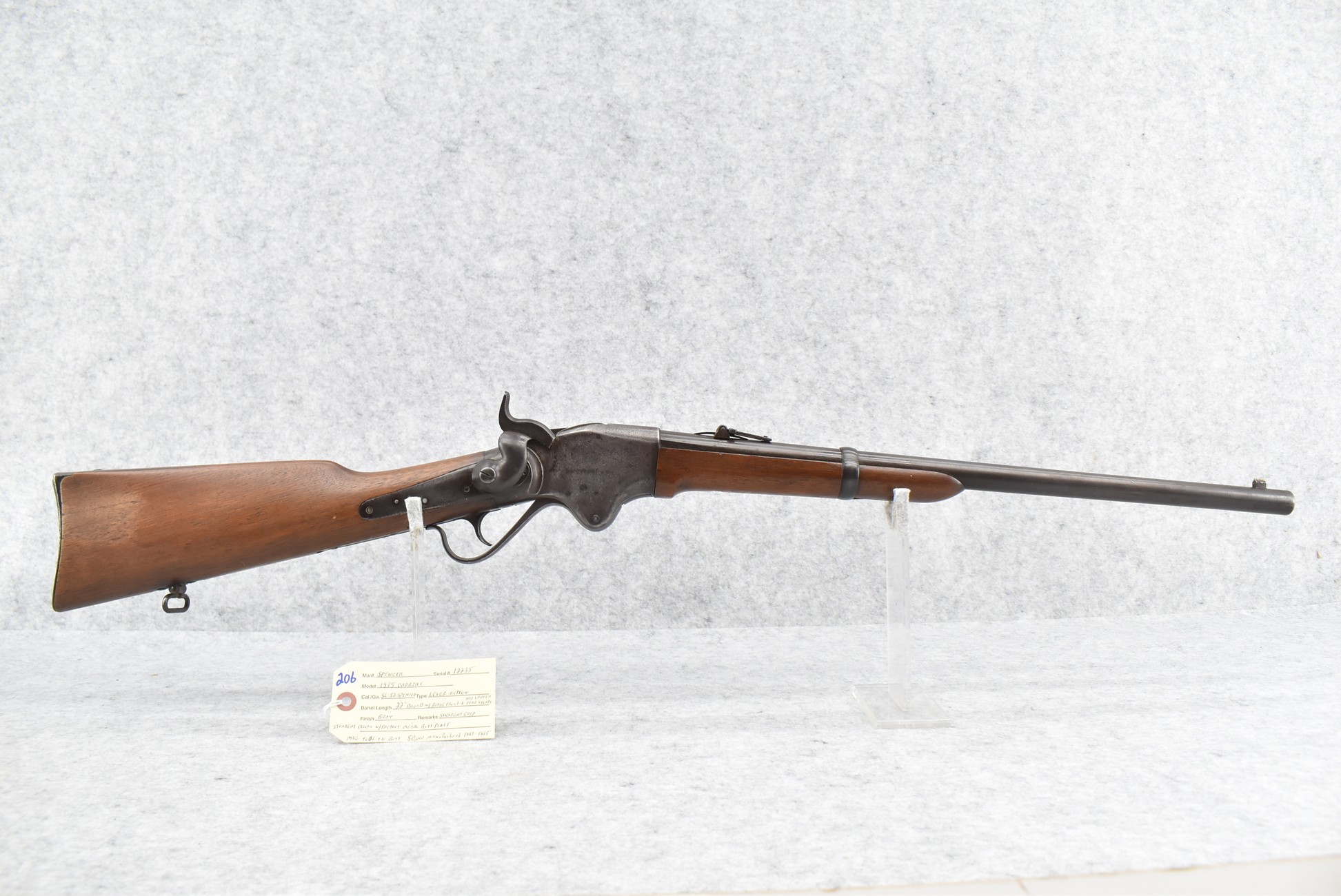 206. Spencer – Mod. 1865 Carbine – 56-56 Spencer Cal. Lever Action Rifle – w/22” Round Barrel w/Blade Front & Adj. Ladder Rear Sights – Gray Finish – w/Straight Grip Wood Stocks w/Factory Metal Butt Plate w/Mag Tube in Butt – 50,000 Mfg. Between 1863-1865