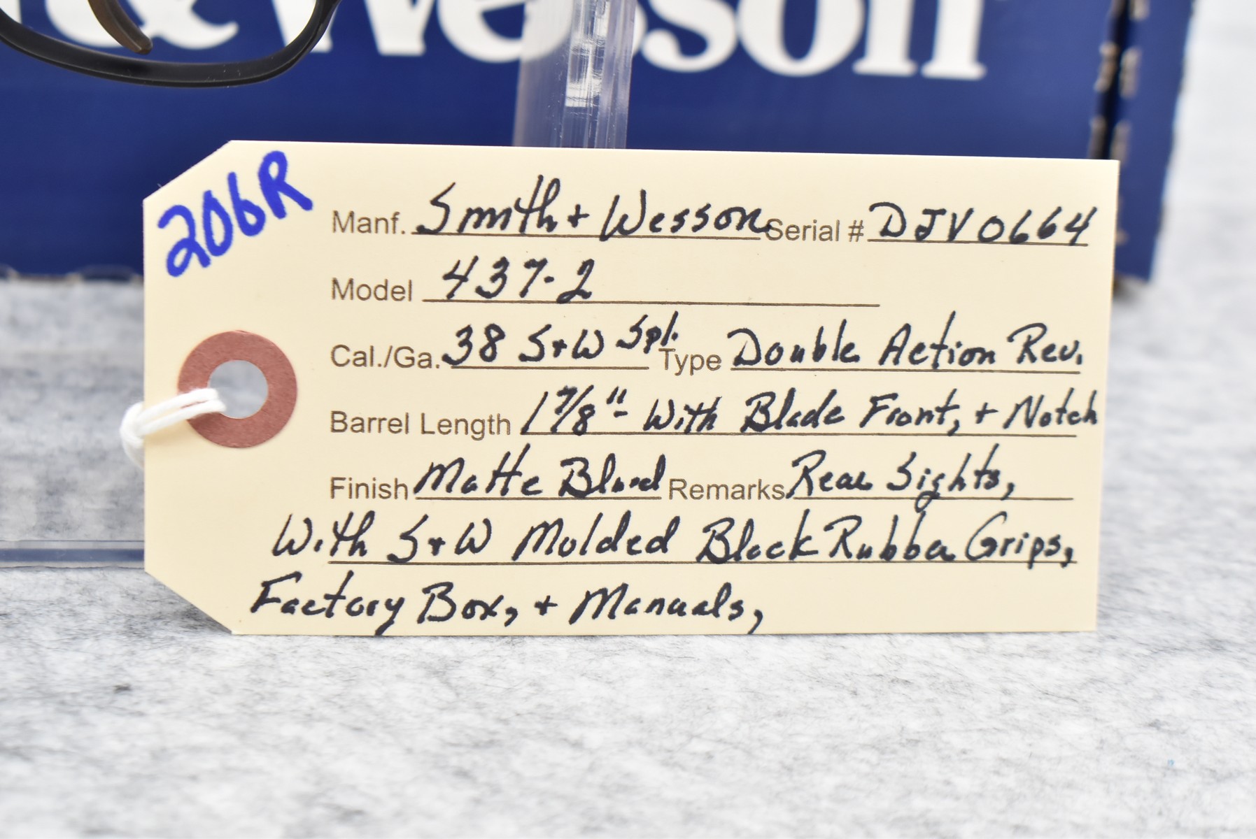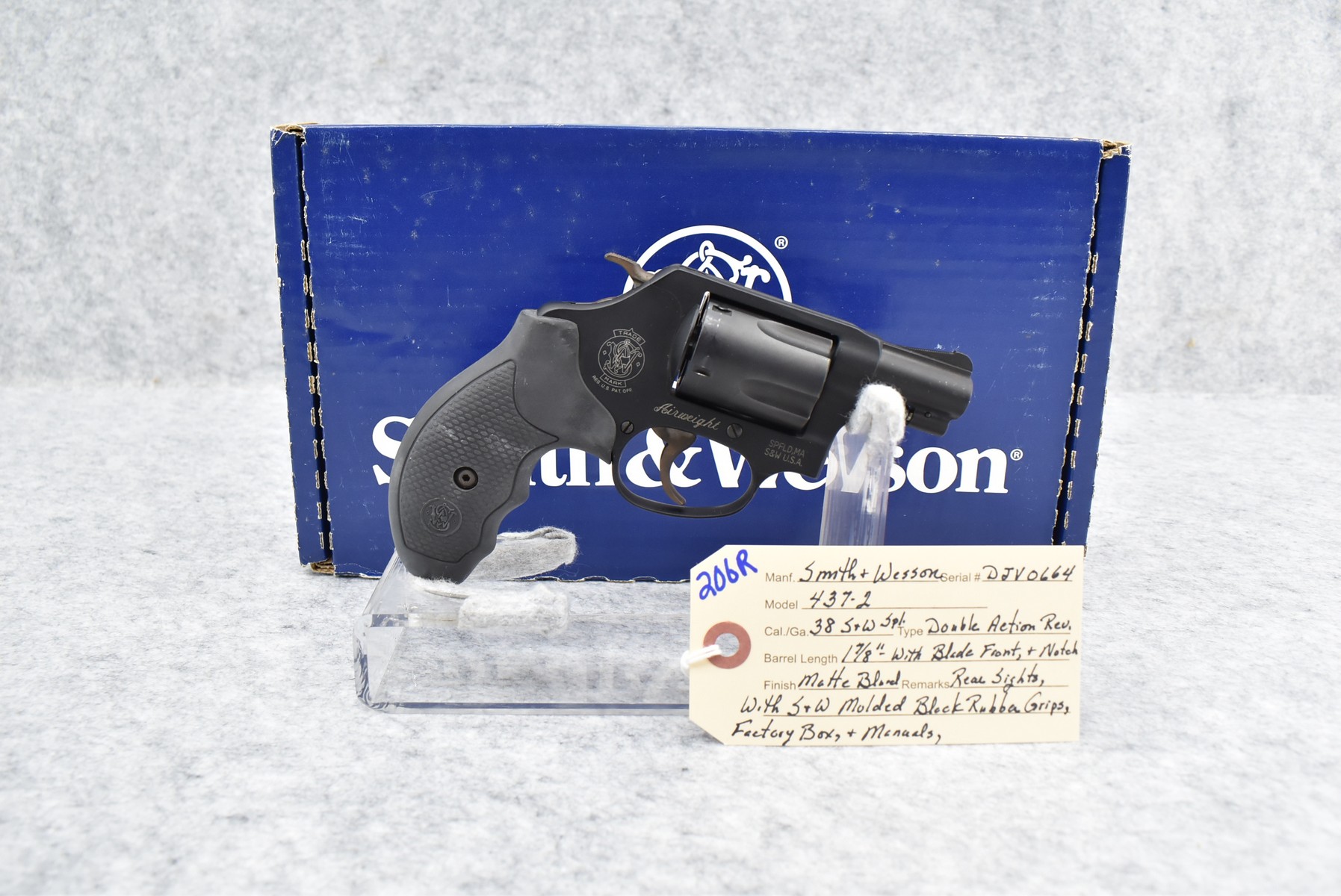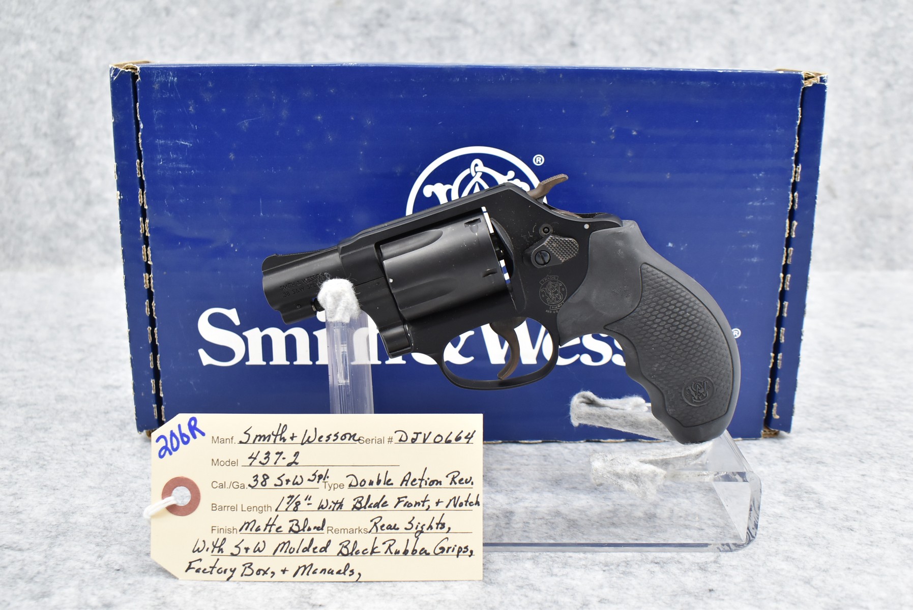 206R. Smith & Wesson – Mod. 437-2 – 38 S&W Spl. Cal. Double Action Revolver – w/1 7/8” Barrel w/Blade Front and Rear Notch Sights – Matte Blued Finish – w/Smith & Wesson Molded Black Rubber Grips – w/Factory Box and Manuals