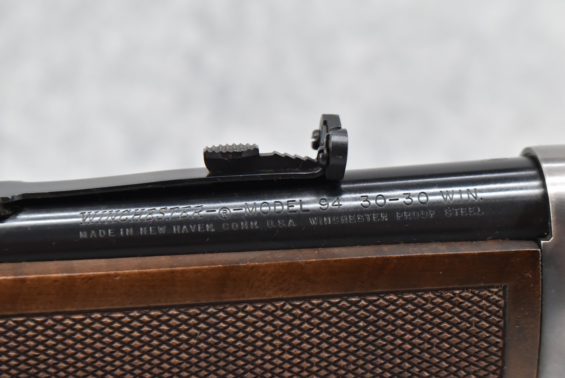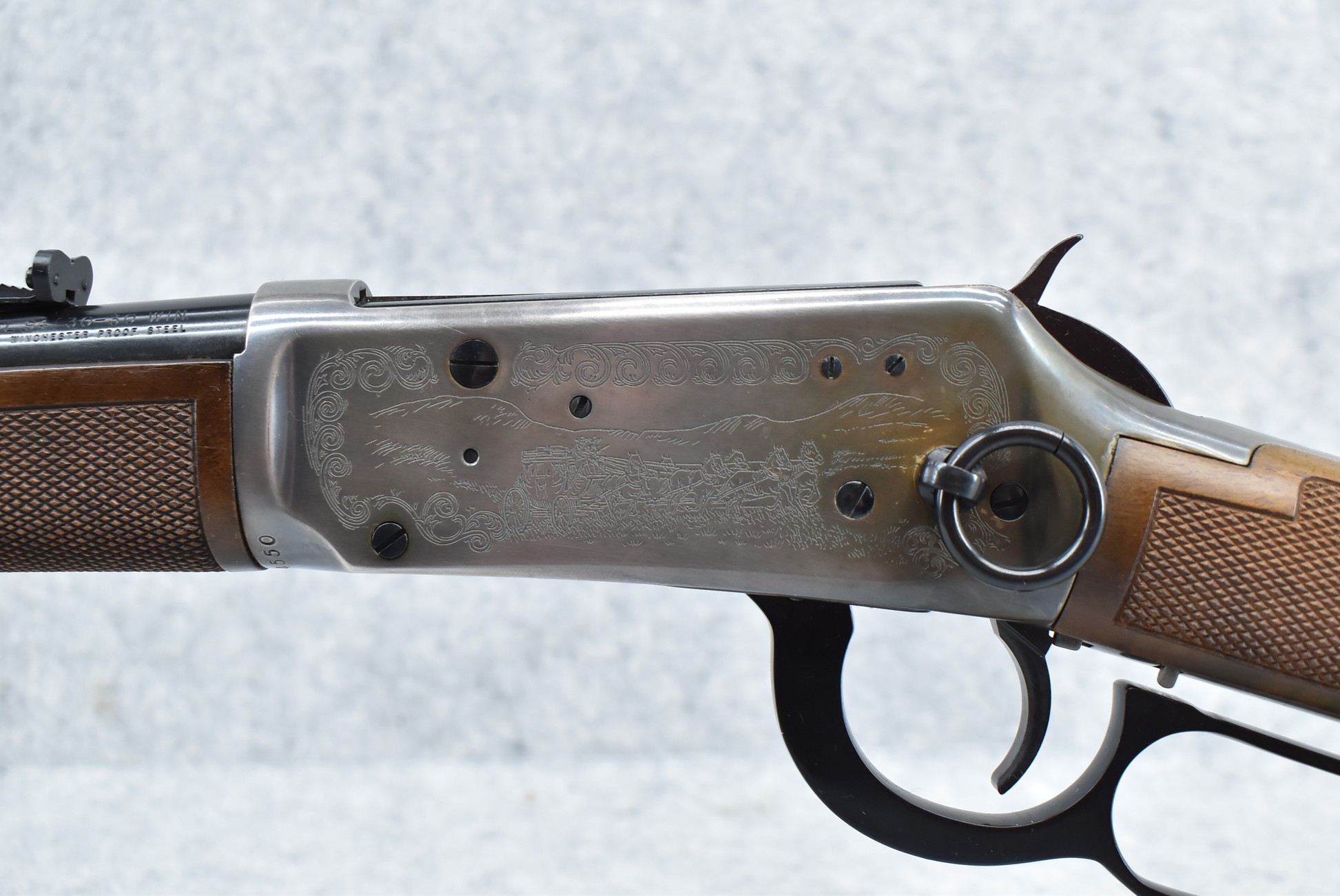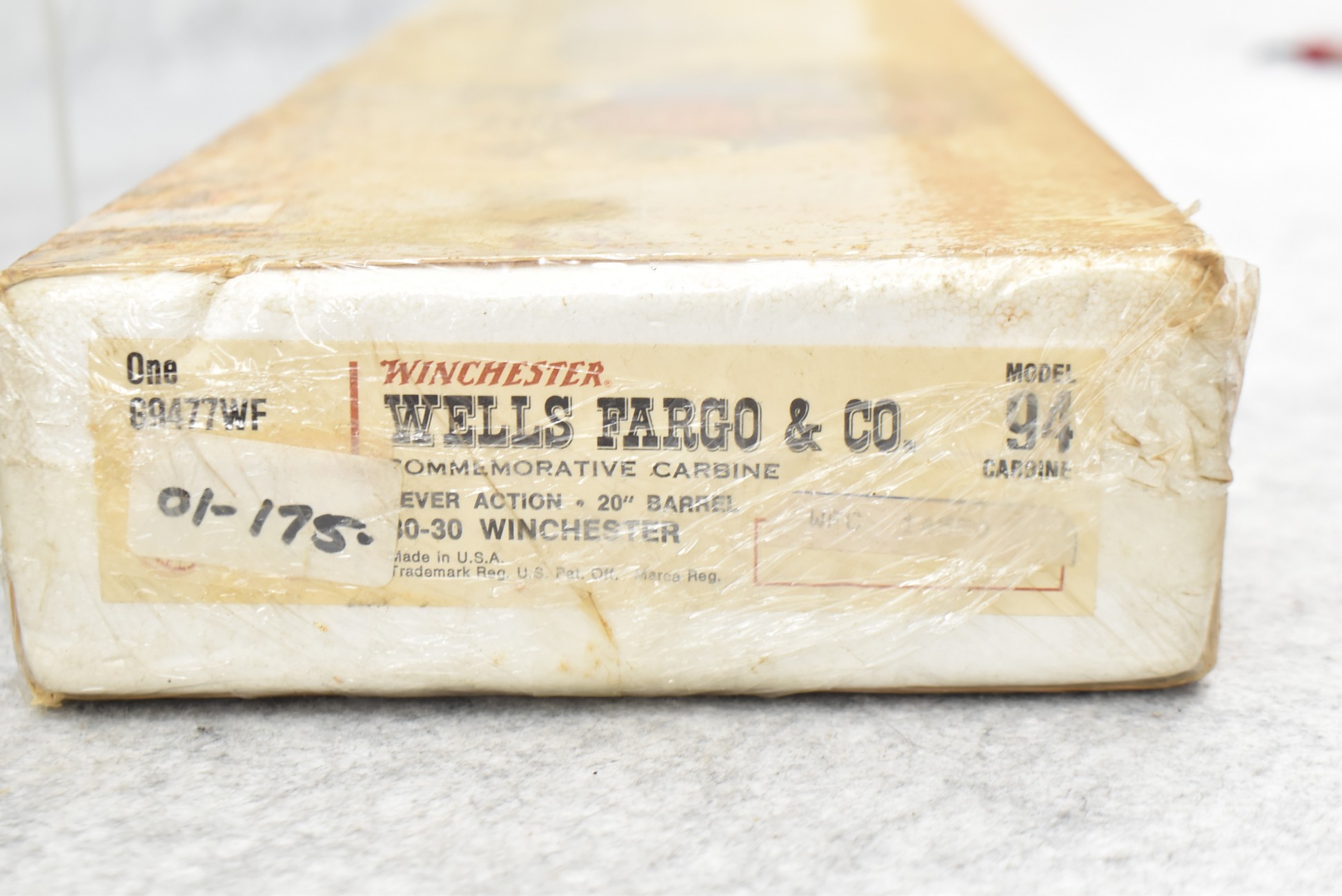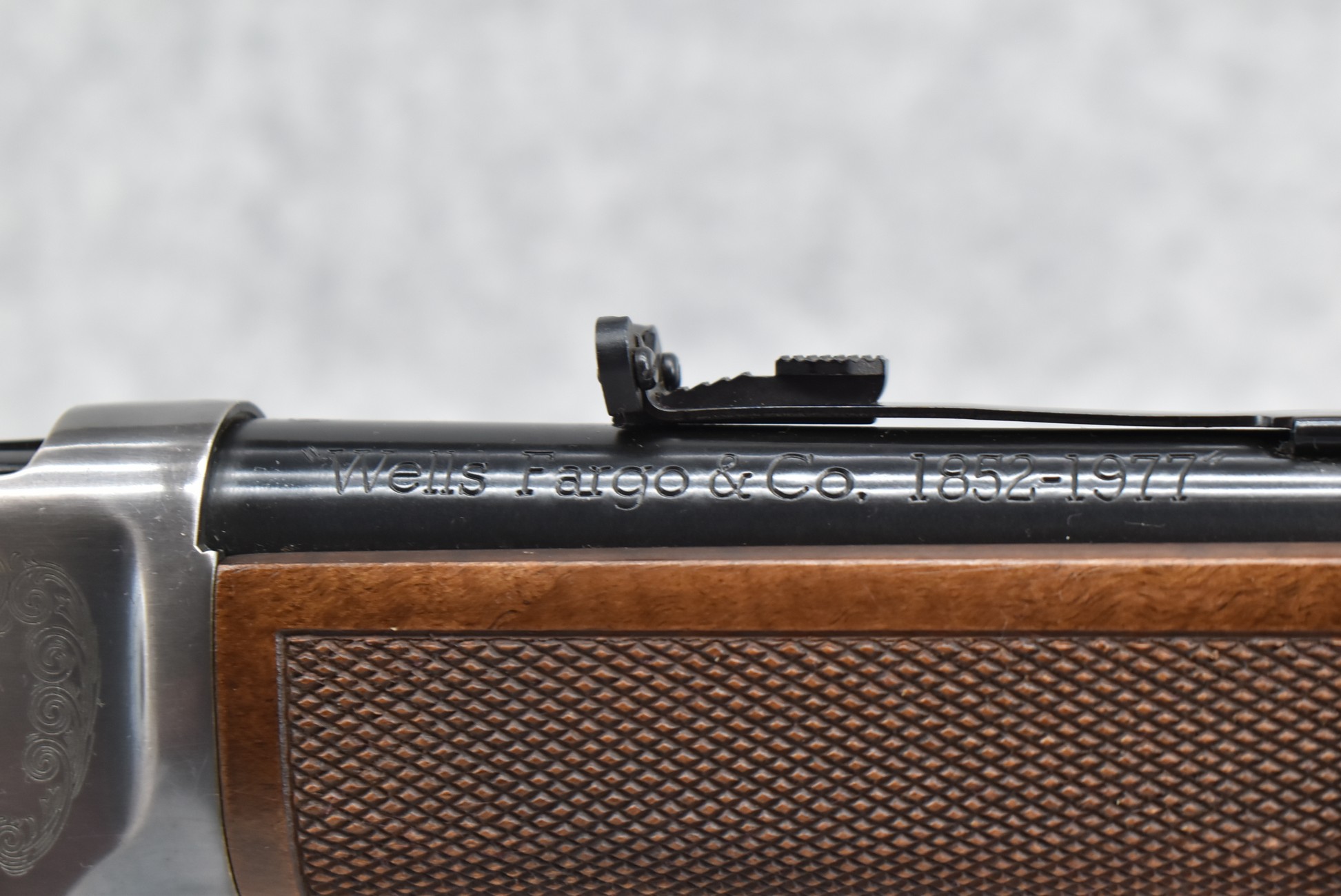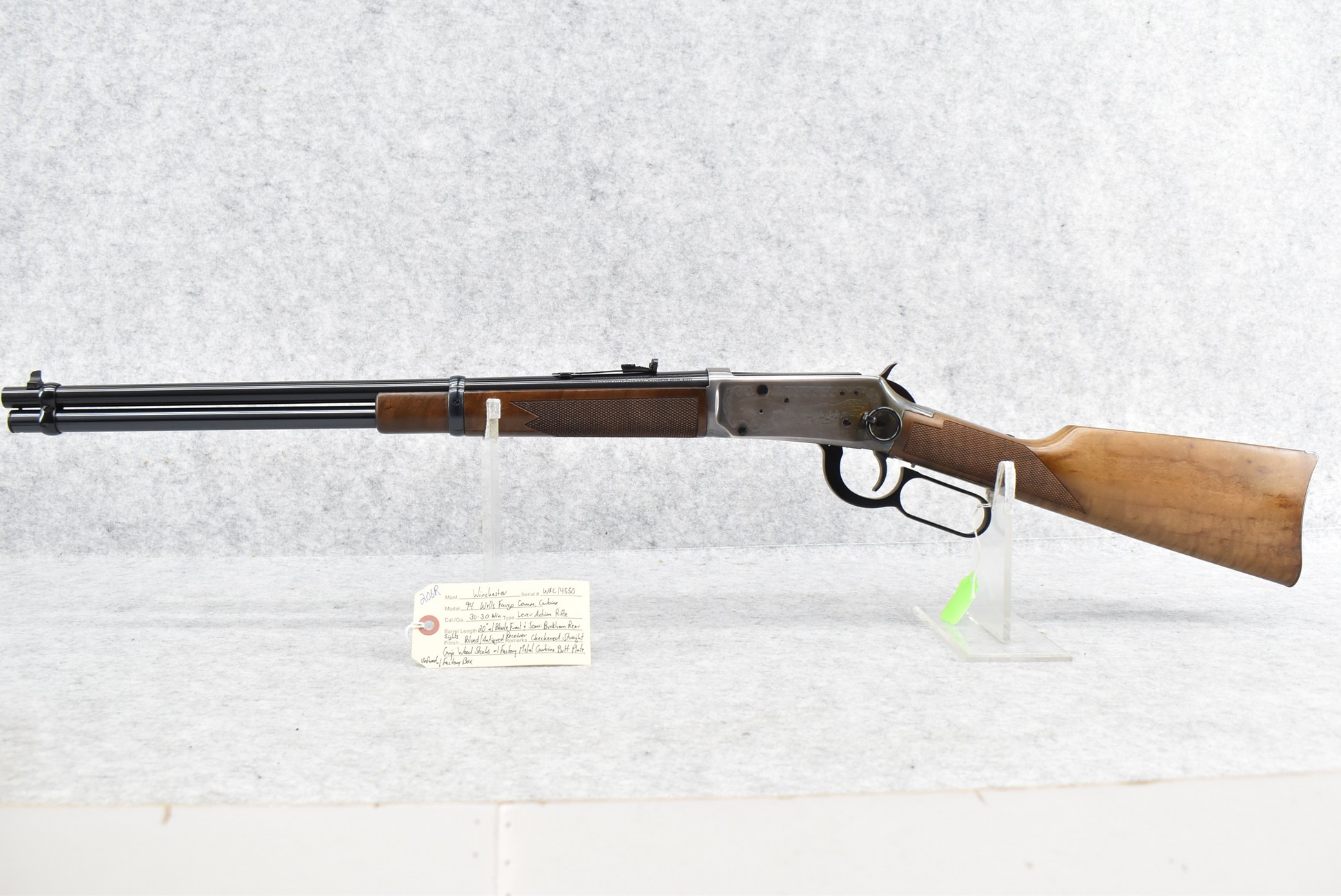 206R. Winchester – Mod. 94 – Wells Fargo Commemorative Carbine – 30-30 Win. Cal. Lever Action Rifle – w/20” Barrel w/Blade Front & Semi-Buckhorn Rear Sights – Blued Finish w/Engraved Receiver – w/Checkered Straight Grip Wood Stocks w/Factory Metal Carbine Butt Plate – Unfired w/Factory Box