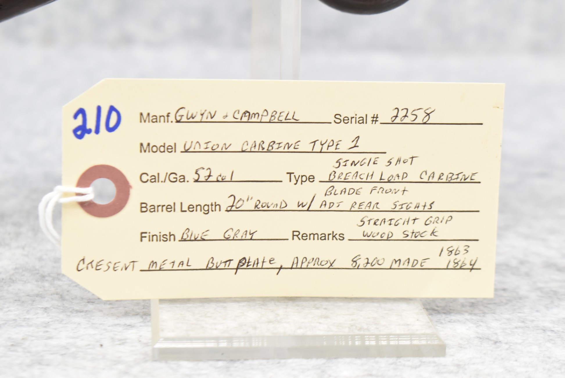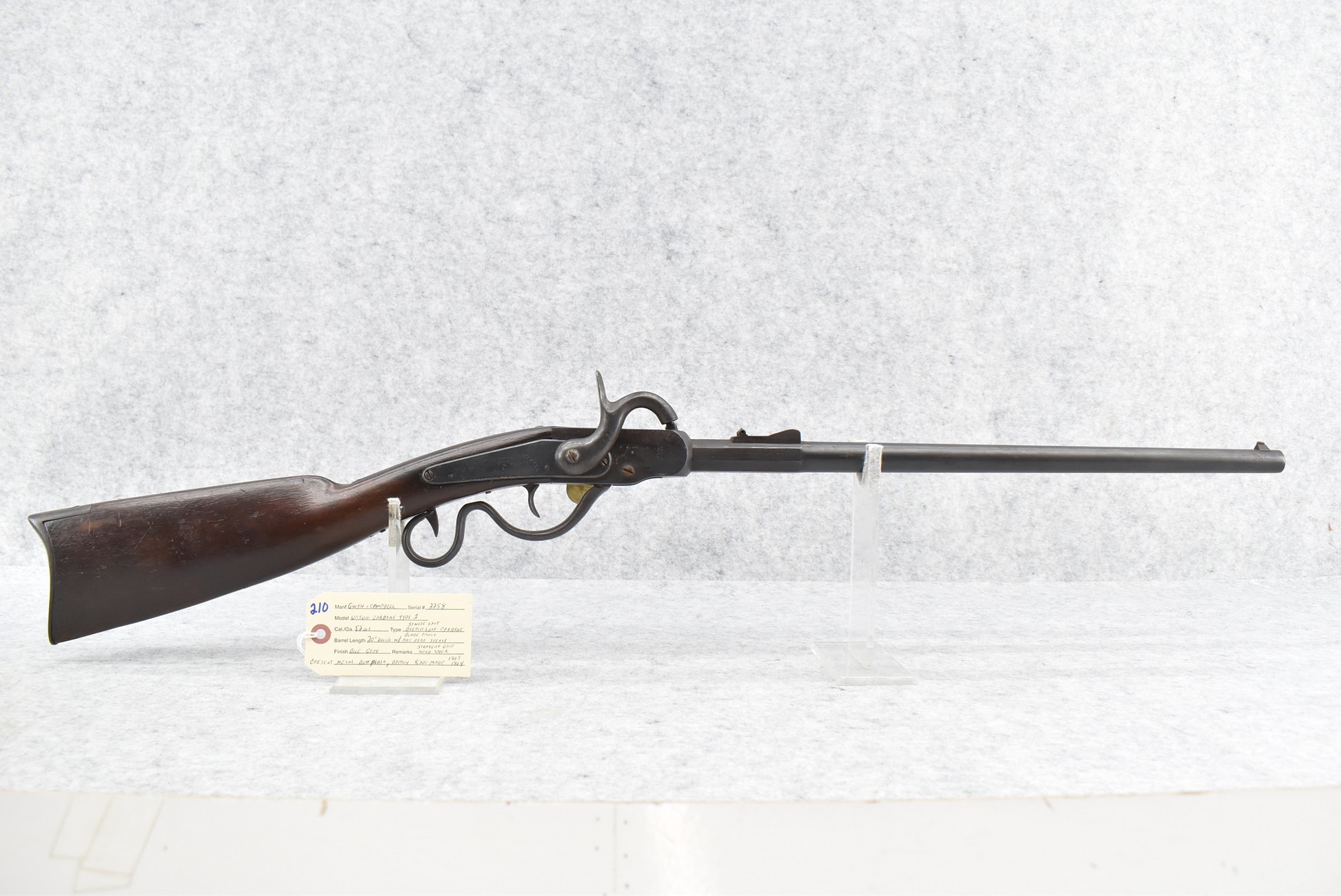 210. Gwyn & Campbell – Mod. Union Carbine Type I – 52 Cal. Single Shot Breech Load Carbine – w/20” Round Barrel w/Blade Front & Adj. Rear Sights – Blued/Gray Finish – w/Straight Grip Wood Stock w/Crescent Metal Butt Plate – Approx. 82,00 Mfg. Between 1863-1864