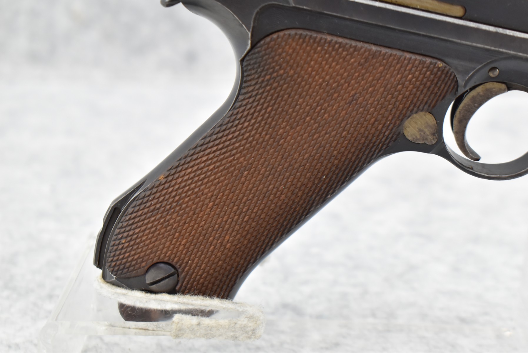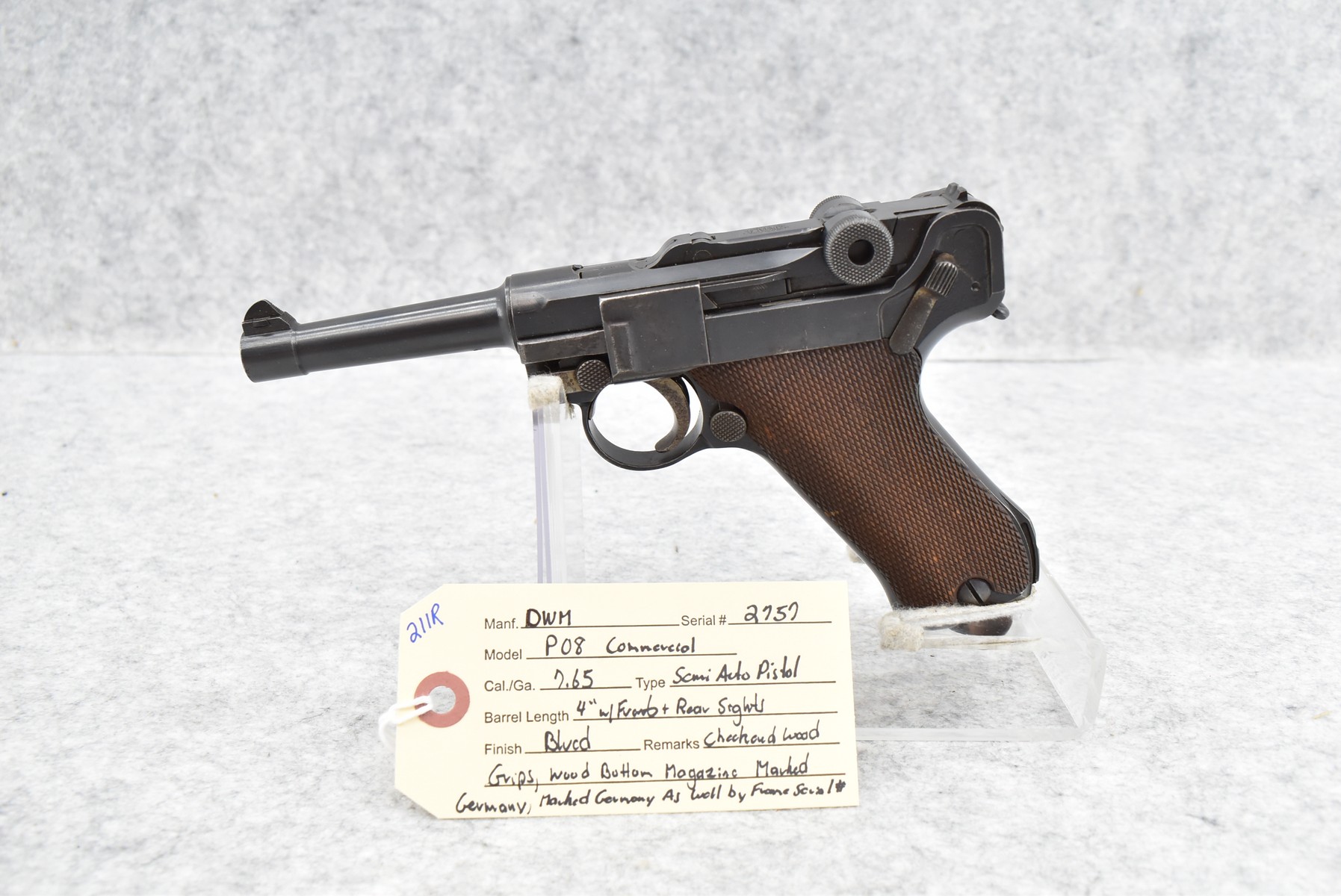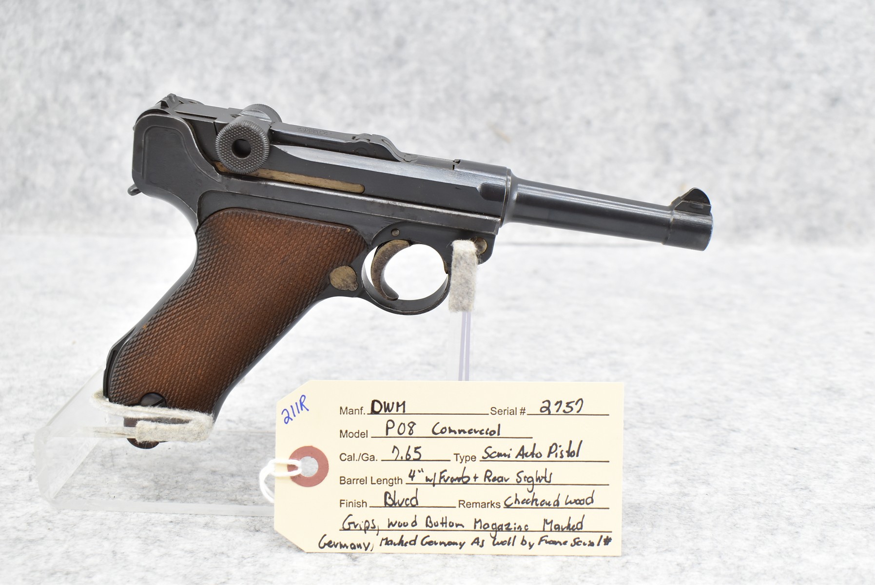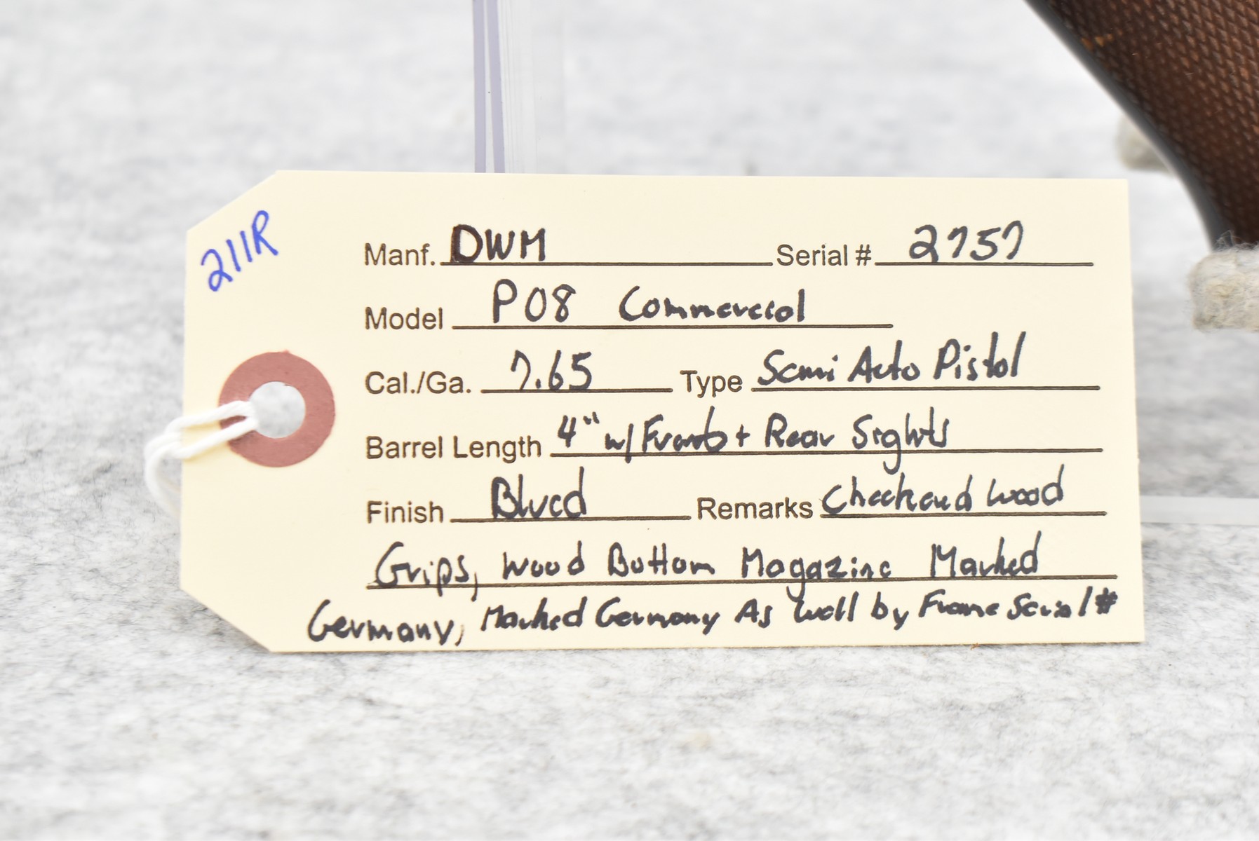 211R. DWM – Mod. P08 Commercial – 7.65 Cal. Semi-Auto Pistol – w/4” Barrel w/Front & Rear Sights – Blued Finish – w/Checkered Wood Grips – w/Wood Button Magazine – Marked “Germany” as Well by Frame Serial #