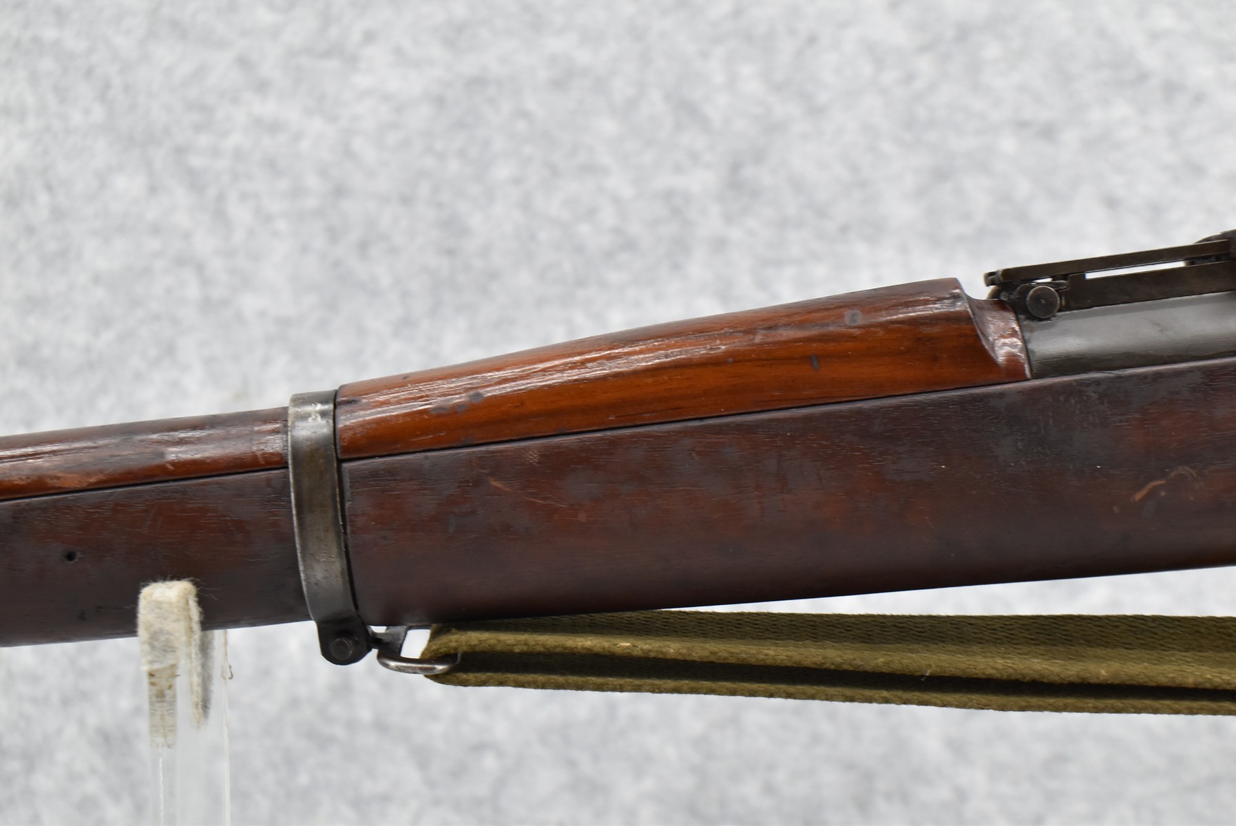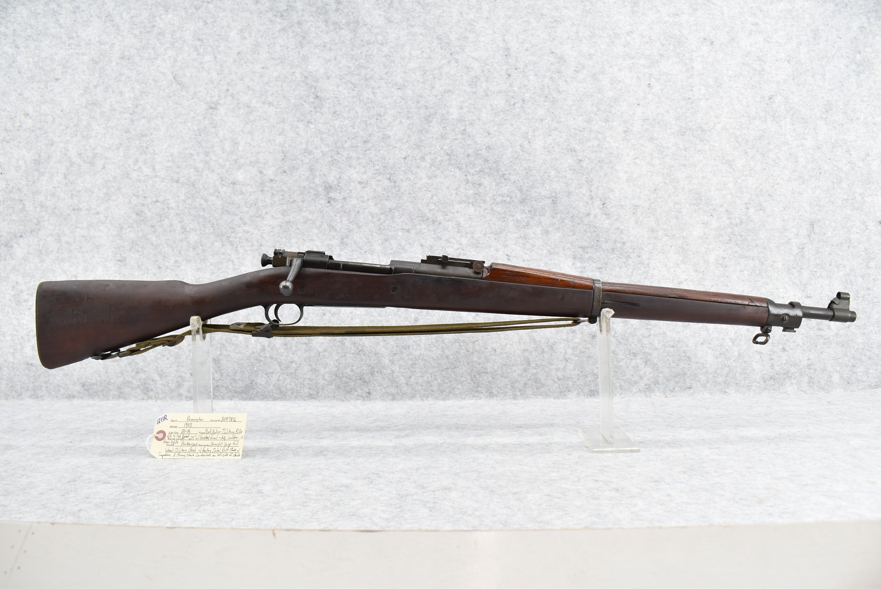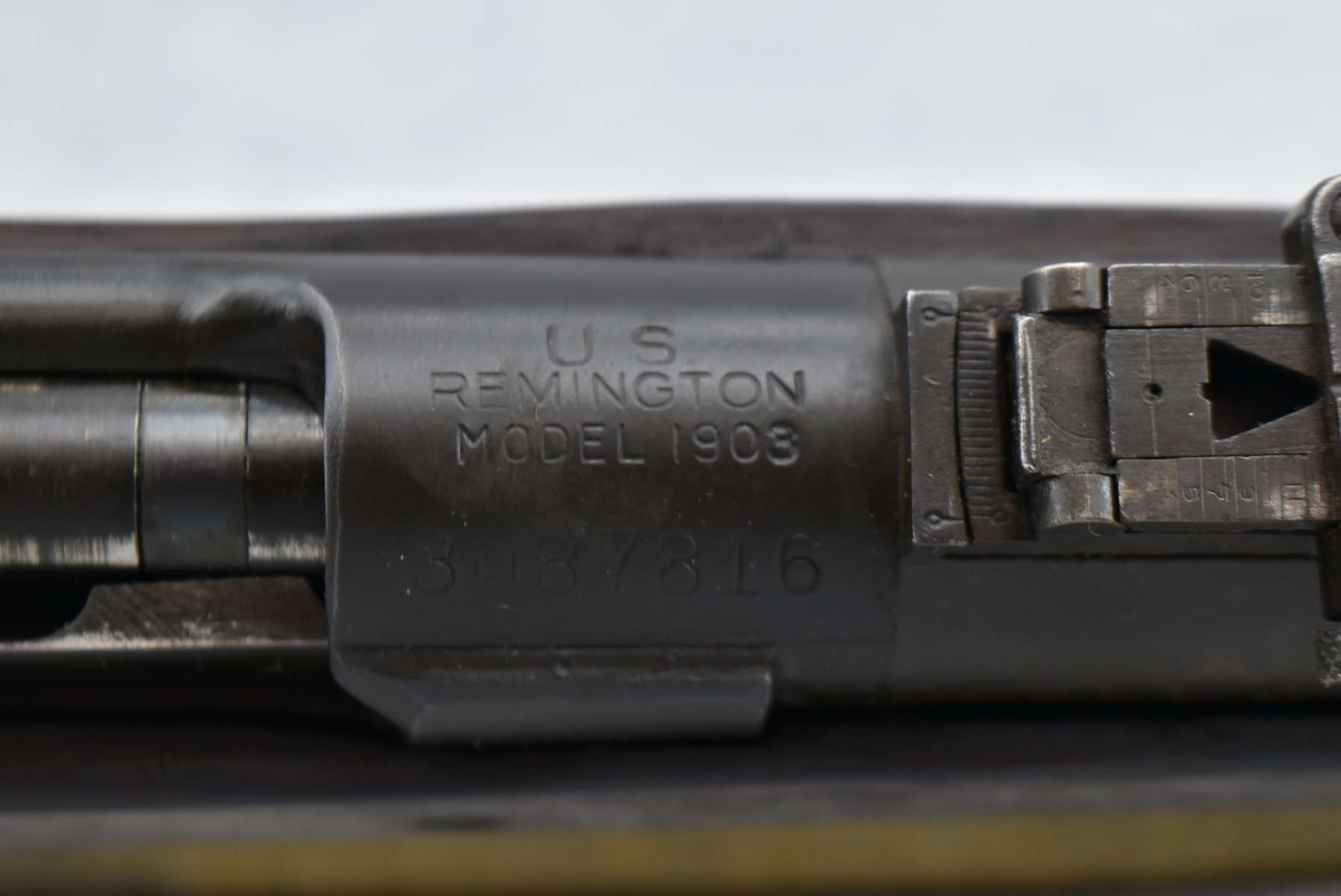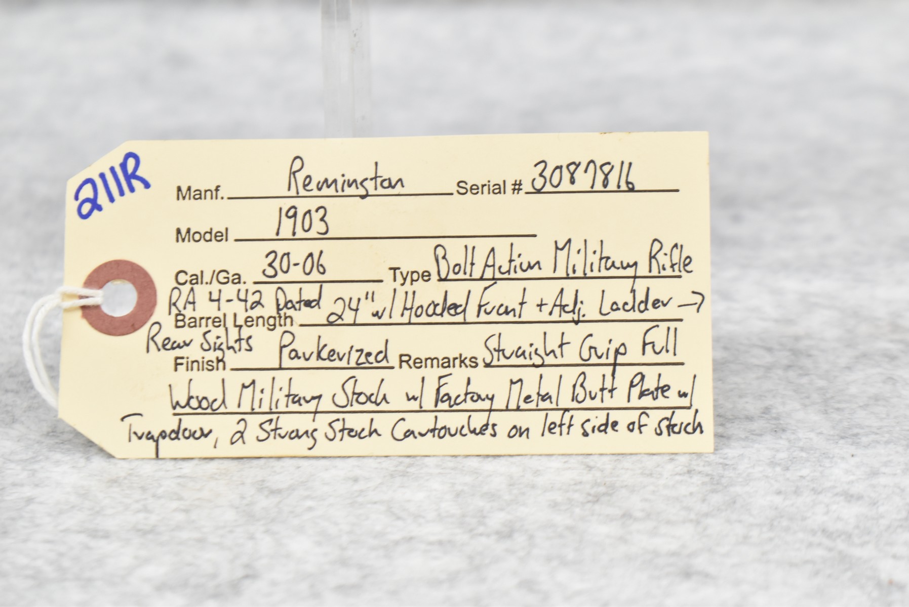 211R. Remington – Mod. 1903 – 30-06 Cal. Bolt Action Military Rifle – w/24” RA 4-42 Dated Barrel w/Hooded Front & Adj. Ladder Rear Sights – Parkerized Finish – w/Straight Grip Full Wood Military Stock w/Factory Metal Butt Plate w/Trapdoor – w/2 Strong Stock Cartouches on Left Side of Stock – w/Military Sling