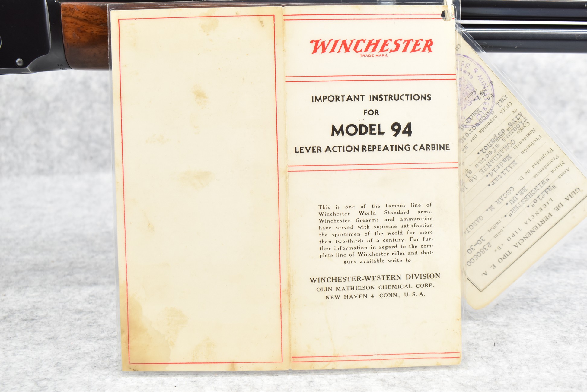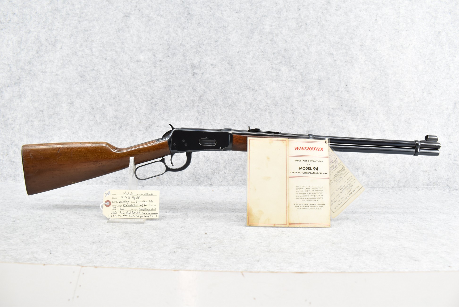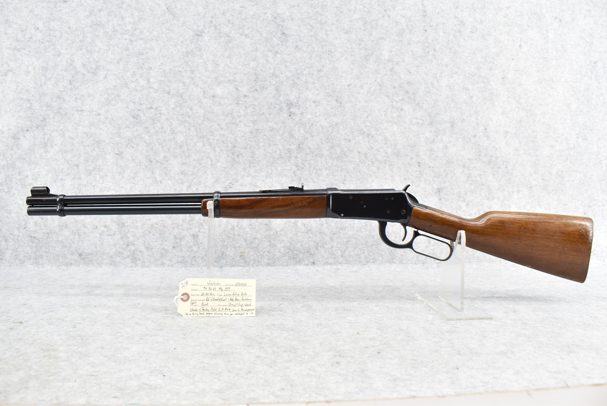 211R. Winchester – Mod. 94 (Pre-64) – 30-30 Win. Cal. Lever Action Rifle – w/20” Barrel w/Hooded Front & Adj. Rear Buckhorn Sights – Blued Finish – w/Straight Grip Wood Stocks w/Factory Metal Butt Plate – Gun is Accompanied by Military Bring Back Paper Showing the Gun Belonged to an Oscar M. Garcia, Who’s Initials “O.M.G.” Are Gold Wired Inlaid on the Underside of the Stock! Bring Back Paper is Dated Dec. 2nd, 1961 & Was Reviewed April 1964 – w/Original Manual – Interesting History For This Gun! – Mfg. 1959