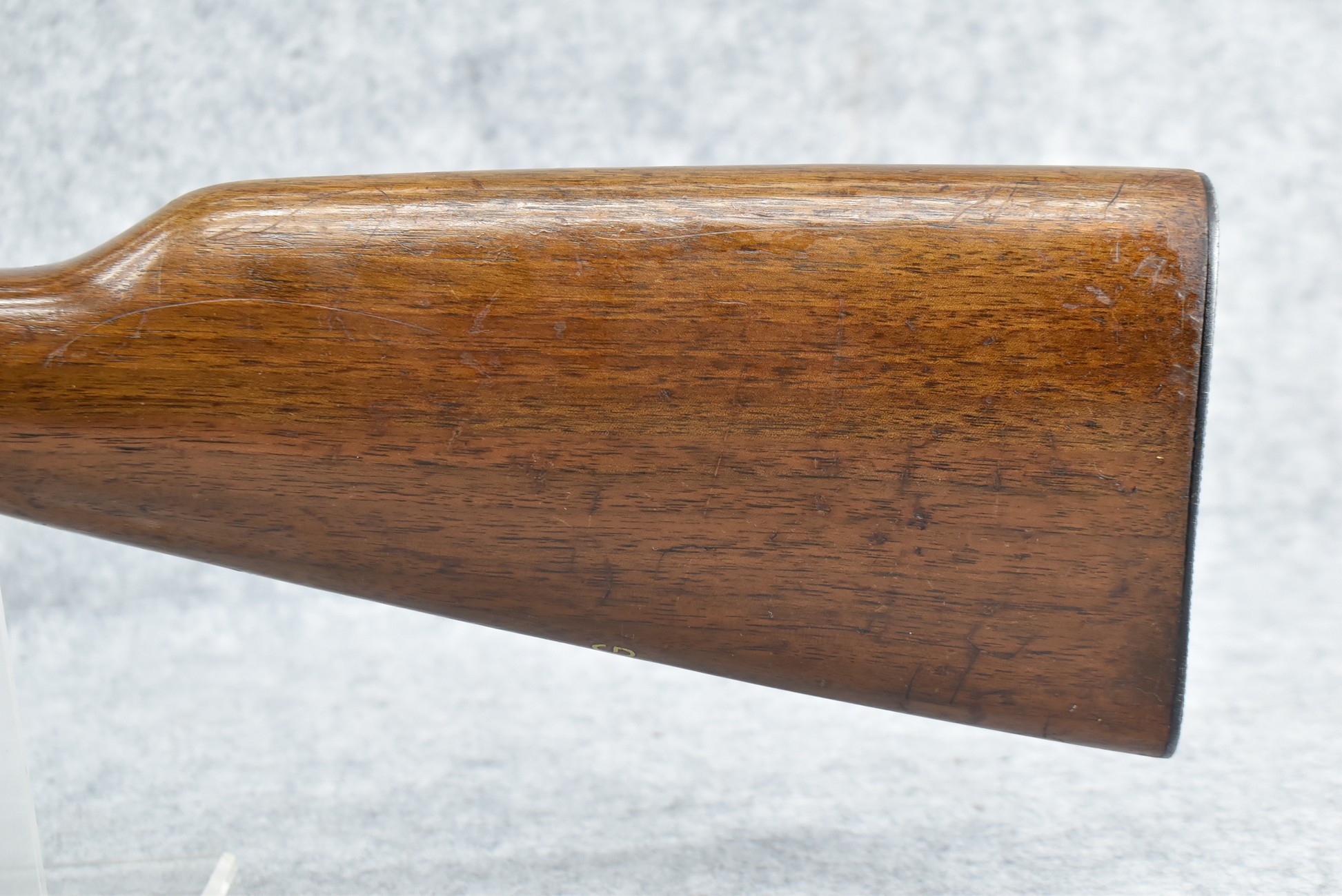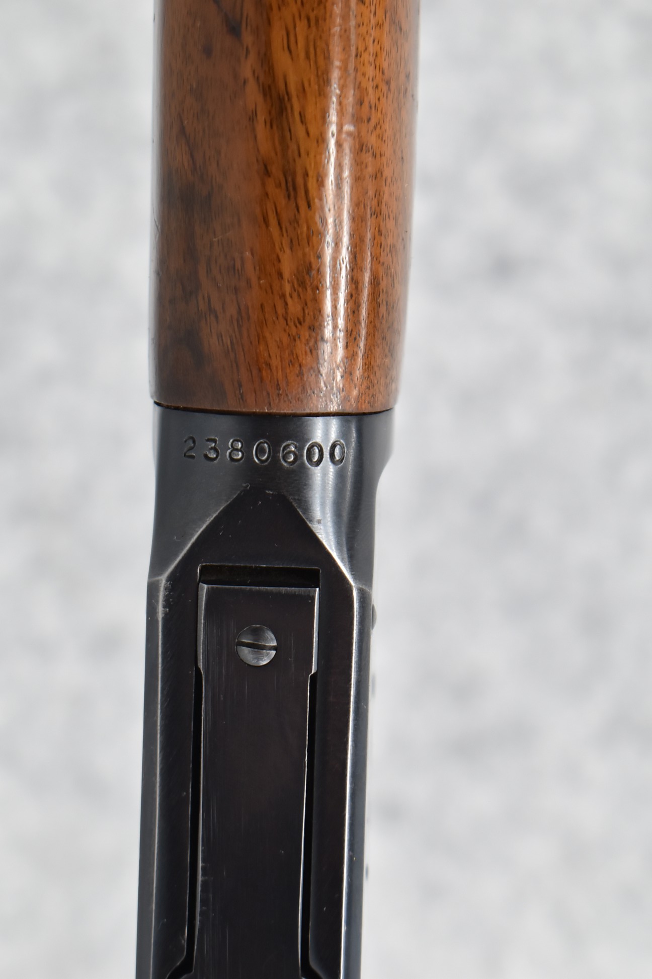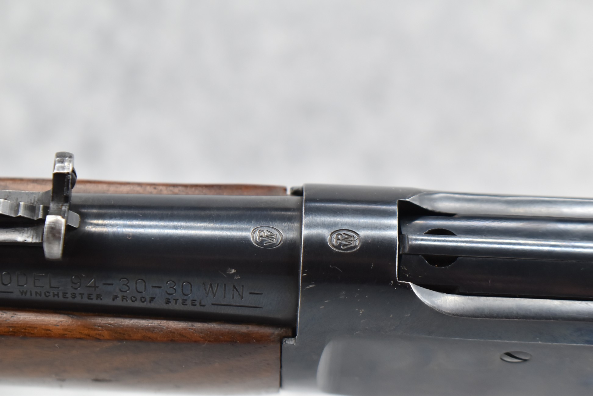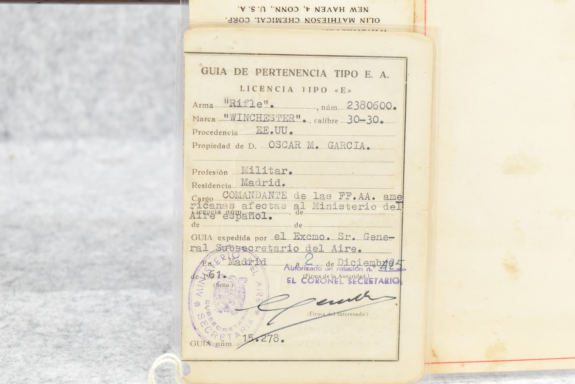 211R. Winchester – Mod. 94 (Pre-64) – 30-30 Win. Cal. Lever Action Rifle – w/20” Barrel w/Hooded Front & Adj. Rear Buckhorn Sights – Blued Finish – w/Straight Grip Wood Stocks w/Factory Metal Butt Plate – Gun is Accompanied by Military Bring Back Paper Showing the Gun Belonged to an Oscar M. Garcia, Who’s Initials “O.M.G.” Are Gold Wired Inlaid on the Underside of the Stock! Bring Back Paper is Dated Dec. 2nd, 1961 & Was Reviewed April 1964 – w/Original Manual – Interesting History For This Gun! – Mfg. 1959