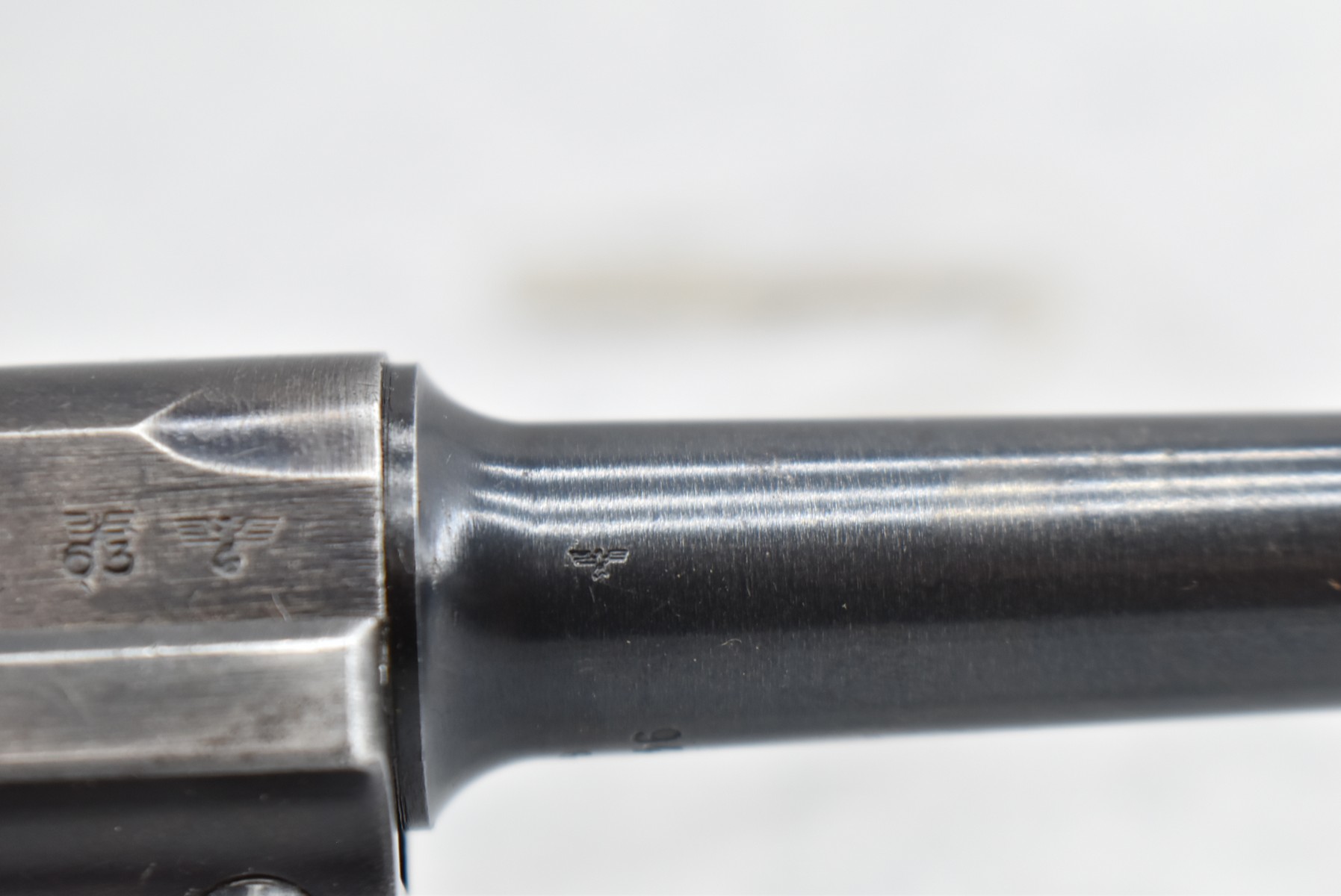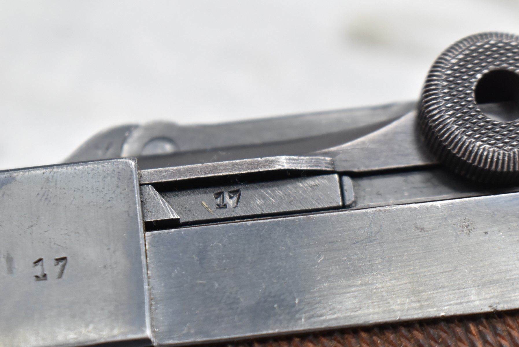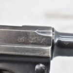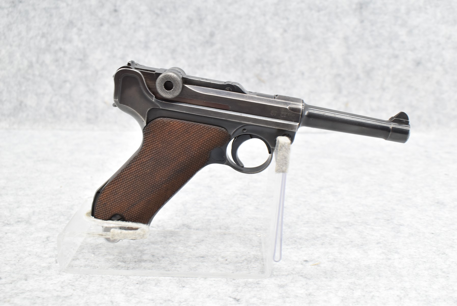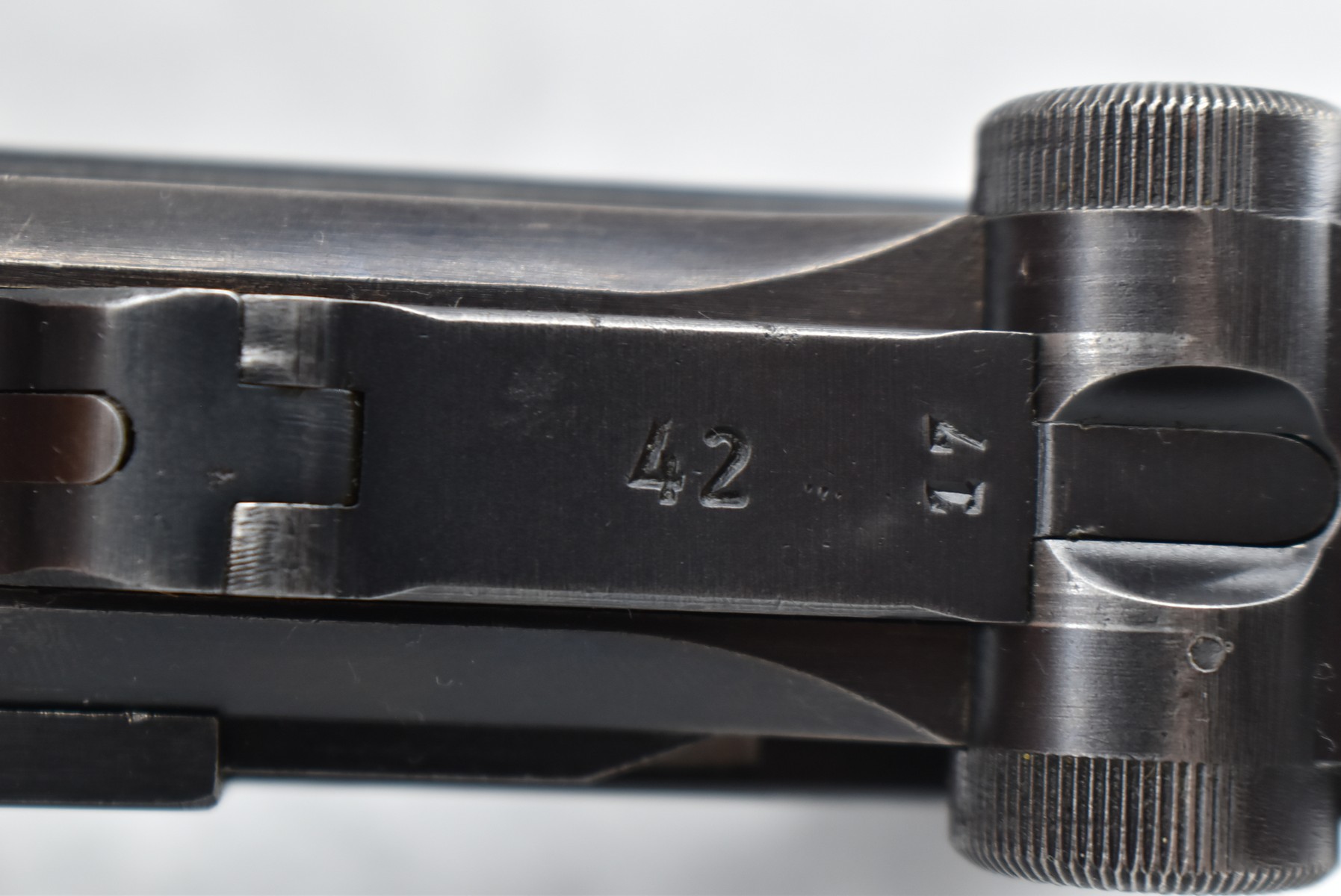 212R. Mauser – Mod. Luger (42) – 9mm Cal. Semi-Auto Pistol – w/4” Barrel w/Front Blade & Rear V-Notch Iron Sights – Factory Original Bluing – w/Checkered Wood Factory Grip – All Numbers Matching Except Magazine – w/Various German Proof Marks – Mfg. 1939