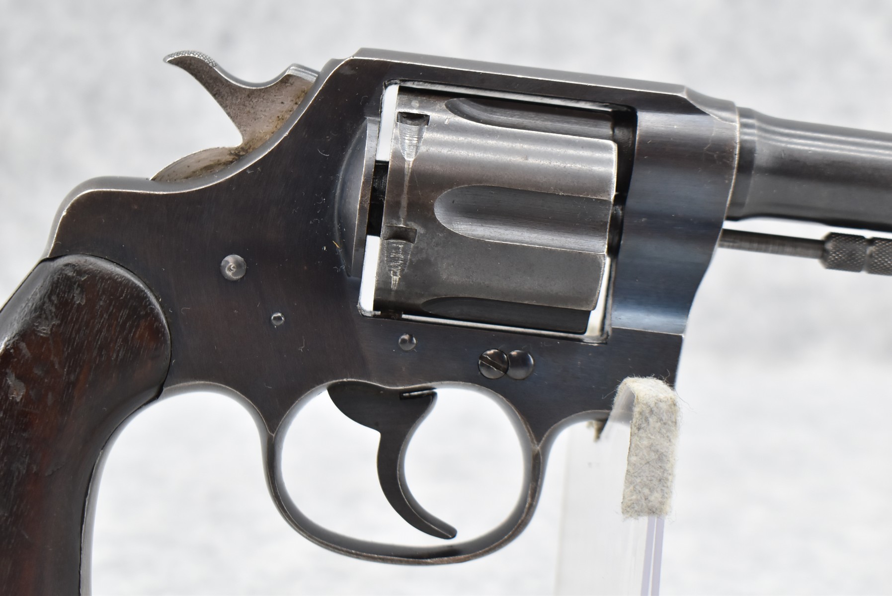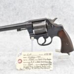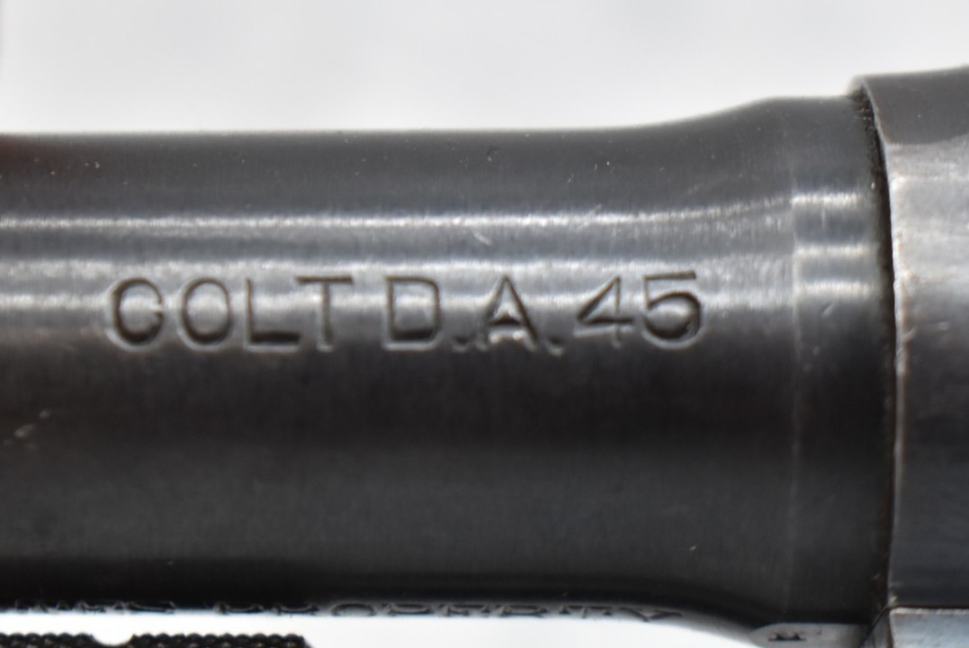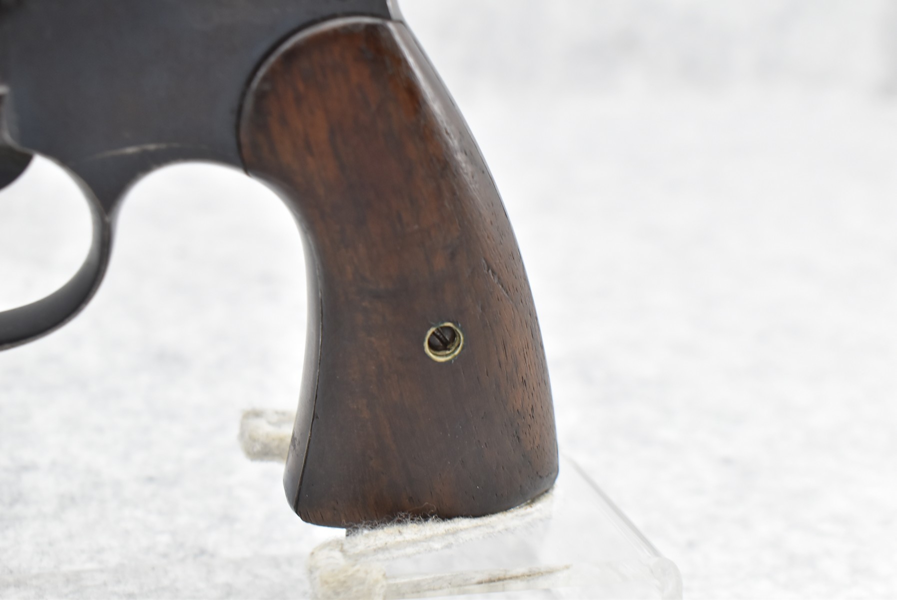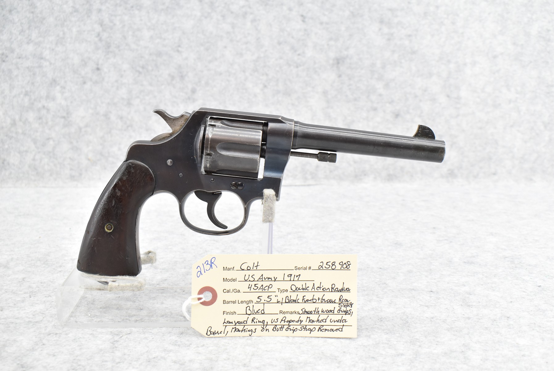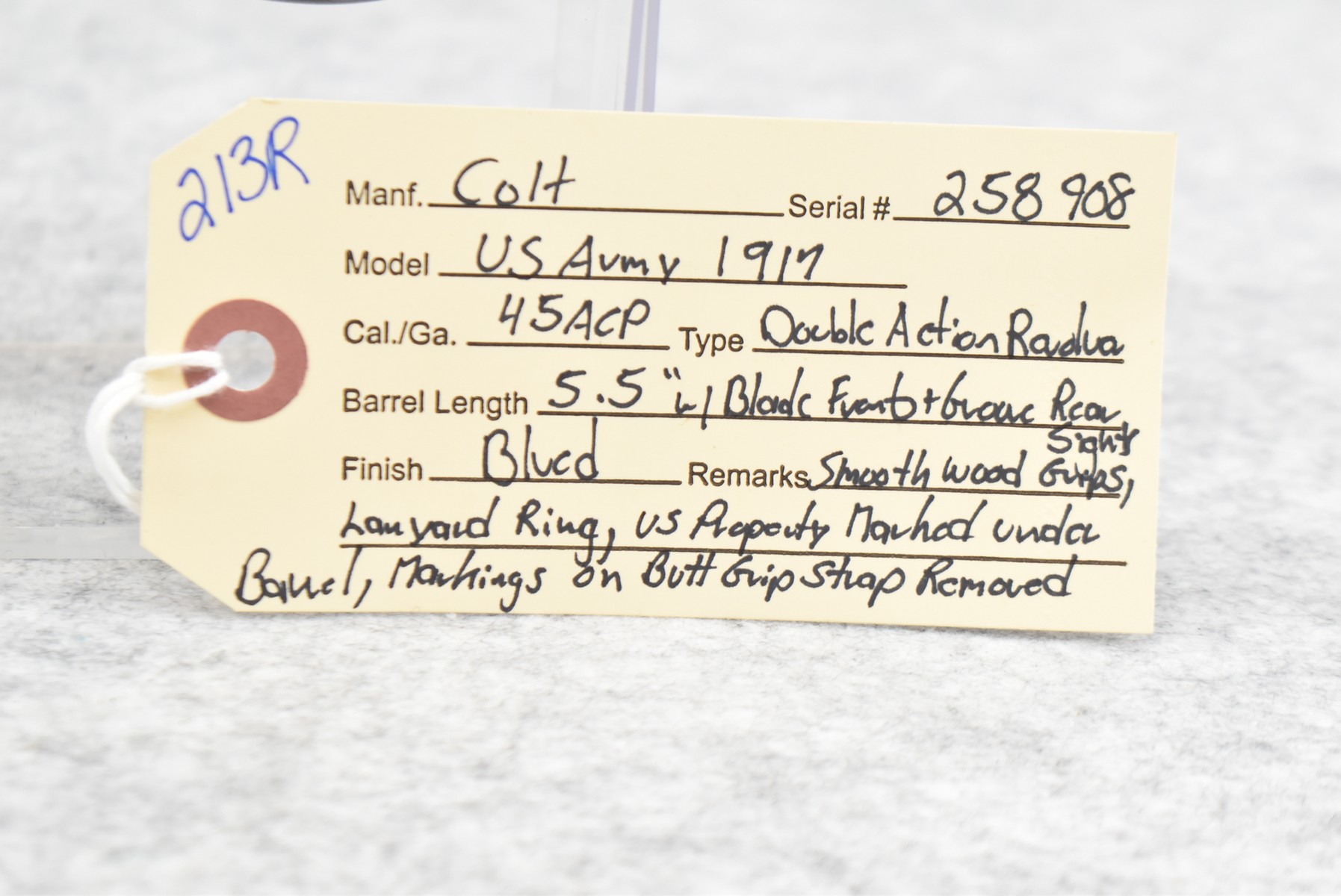 213R. Colt – Mod. US Army 1917 – 45 ACP Cal. Double Action Revolver – w/5.5” Barrel w/Blade Front & Groove Rear Sights – Blued Finish – w/Smooth Wood Grips – w/Lanyard Ring – “US Property” Marked Under Barrel – Markings on Bottom of Butt Grip Strap Removed