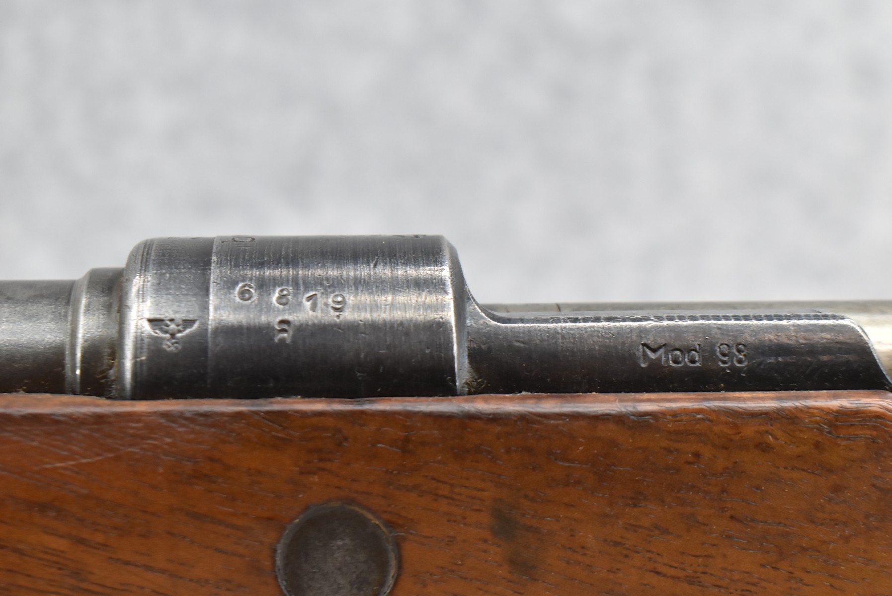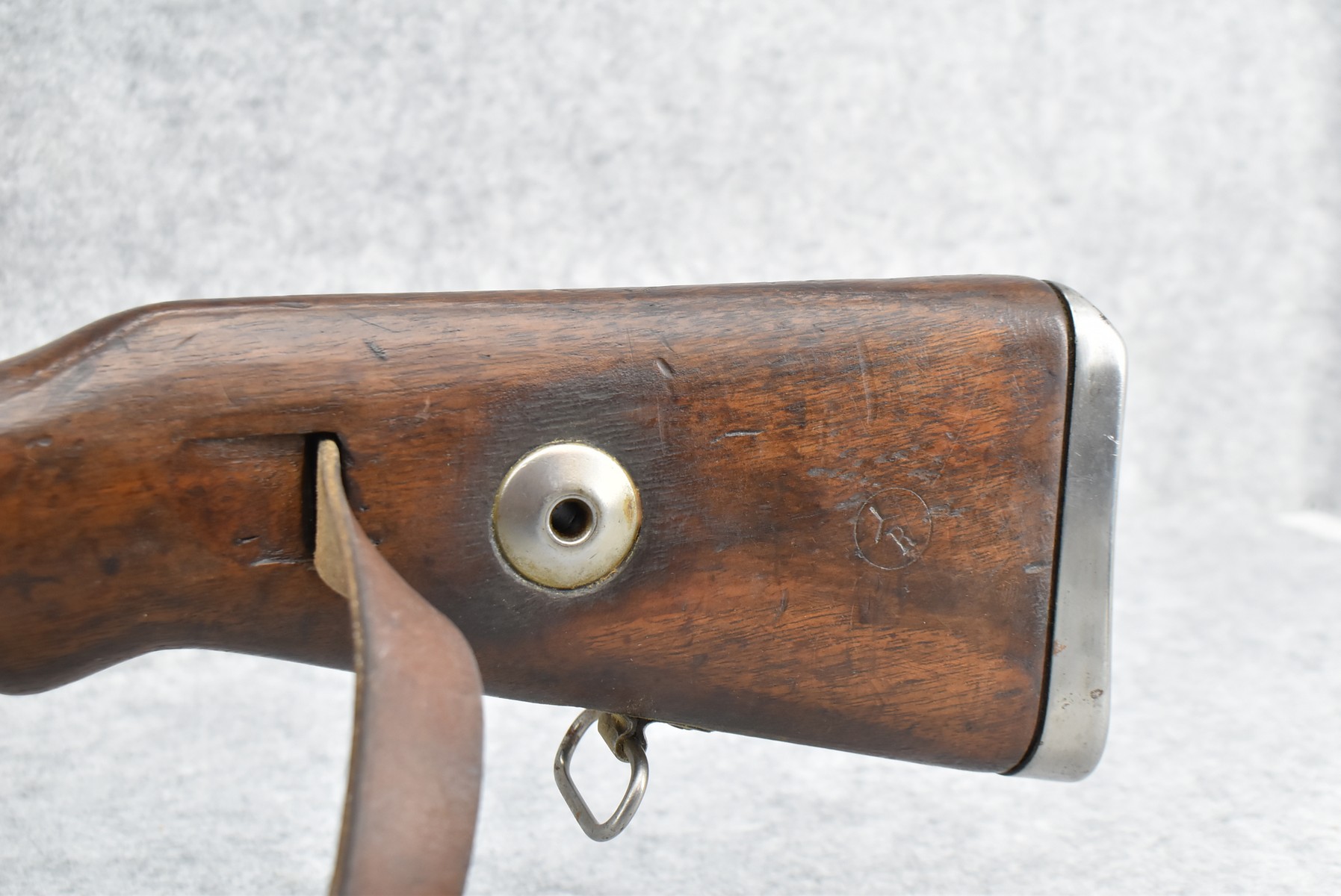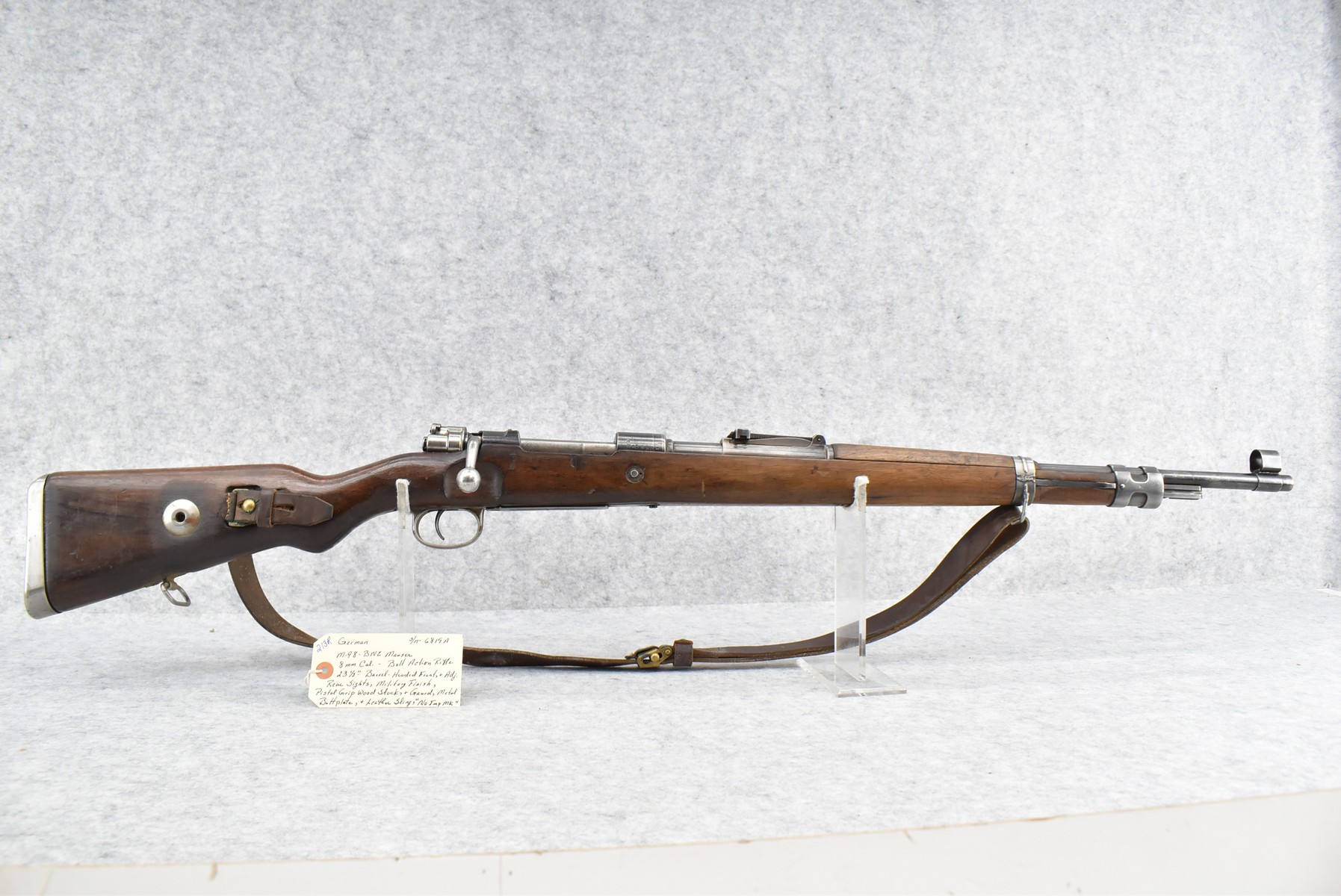 213R. Steyr-Daimler-Puch (German) – Mod. 98k – 8mm Cal. Bolt Action Rifle – w/23 ½” Barrel w/Hooded Front & Adj. Rear Sights – Military Finish – w/Pistol Grip Wood Stocks w/Metal Butt Plate – w/Leather Sling – Mfg. bnz – w/German Proof Markings