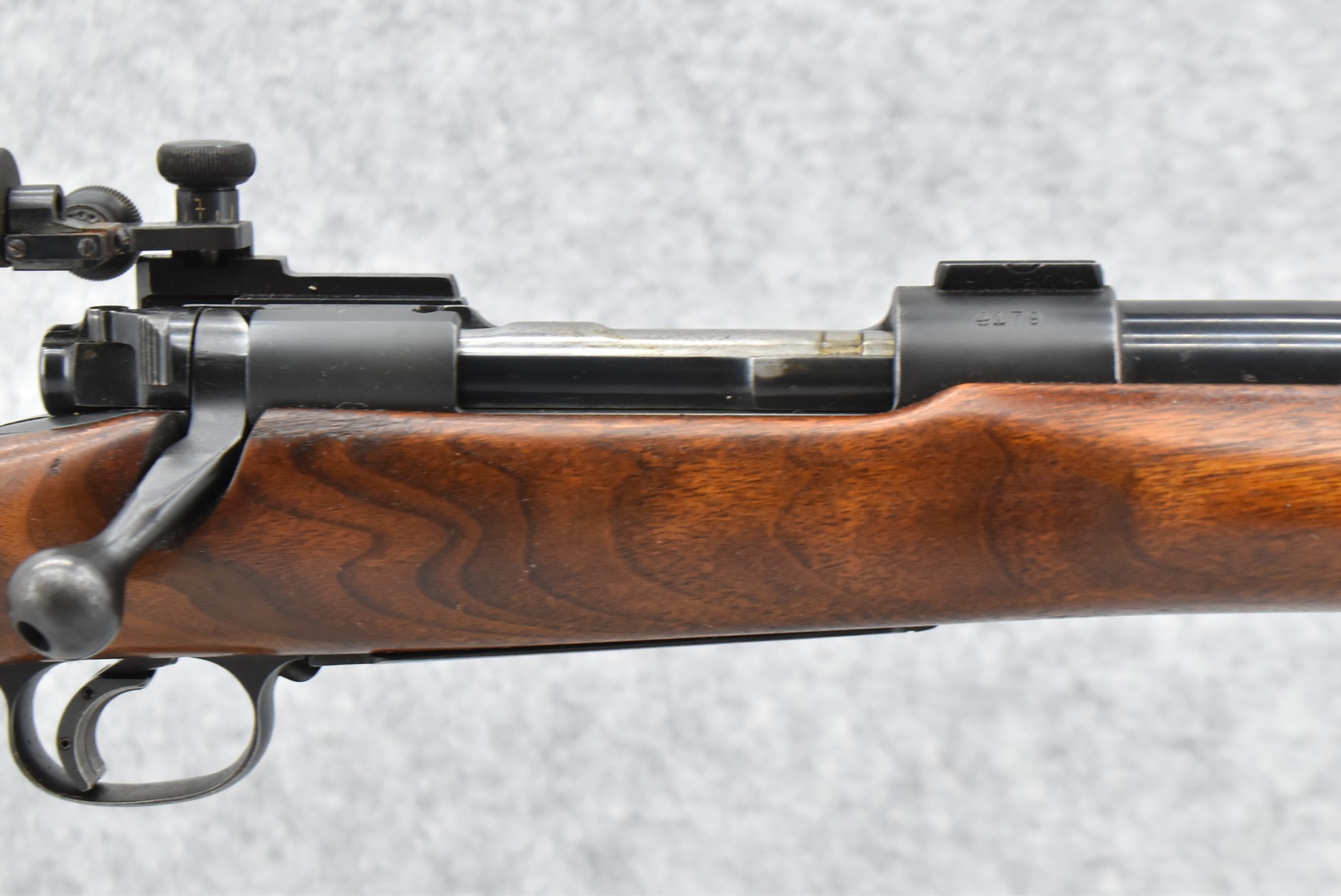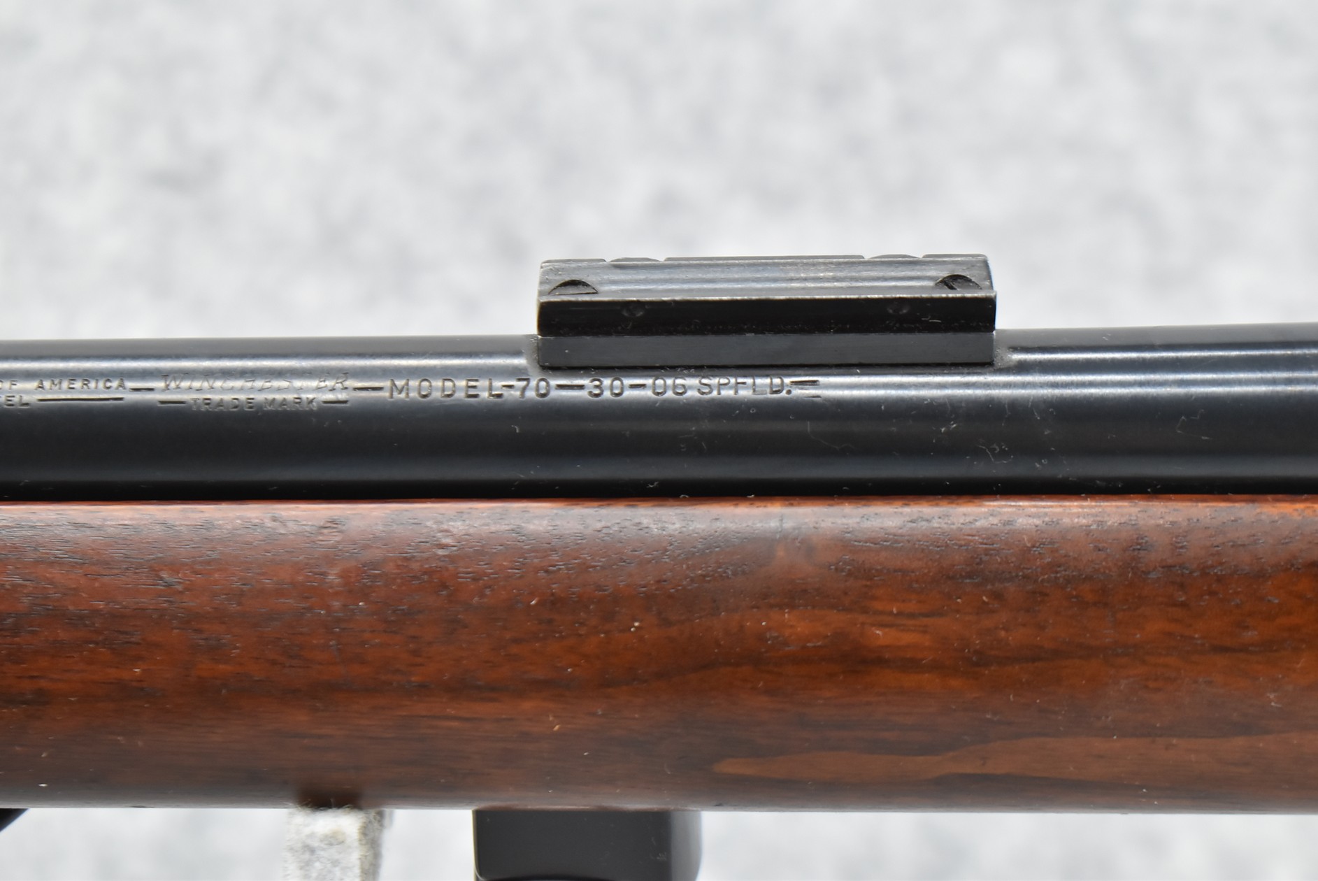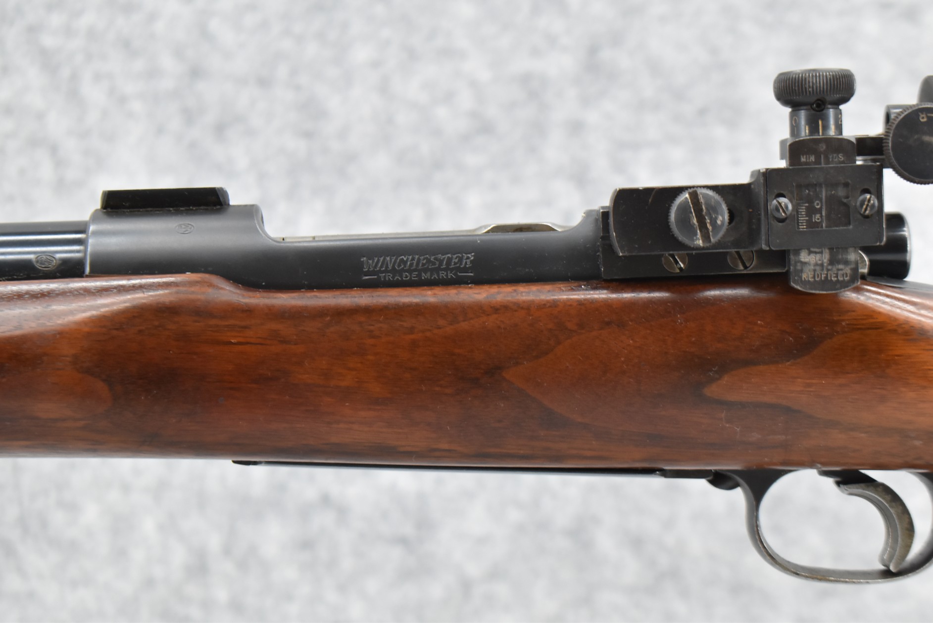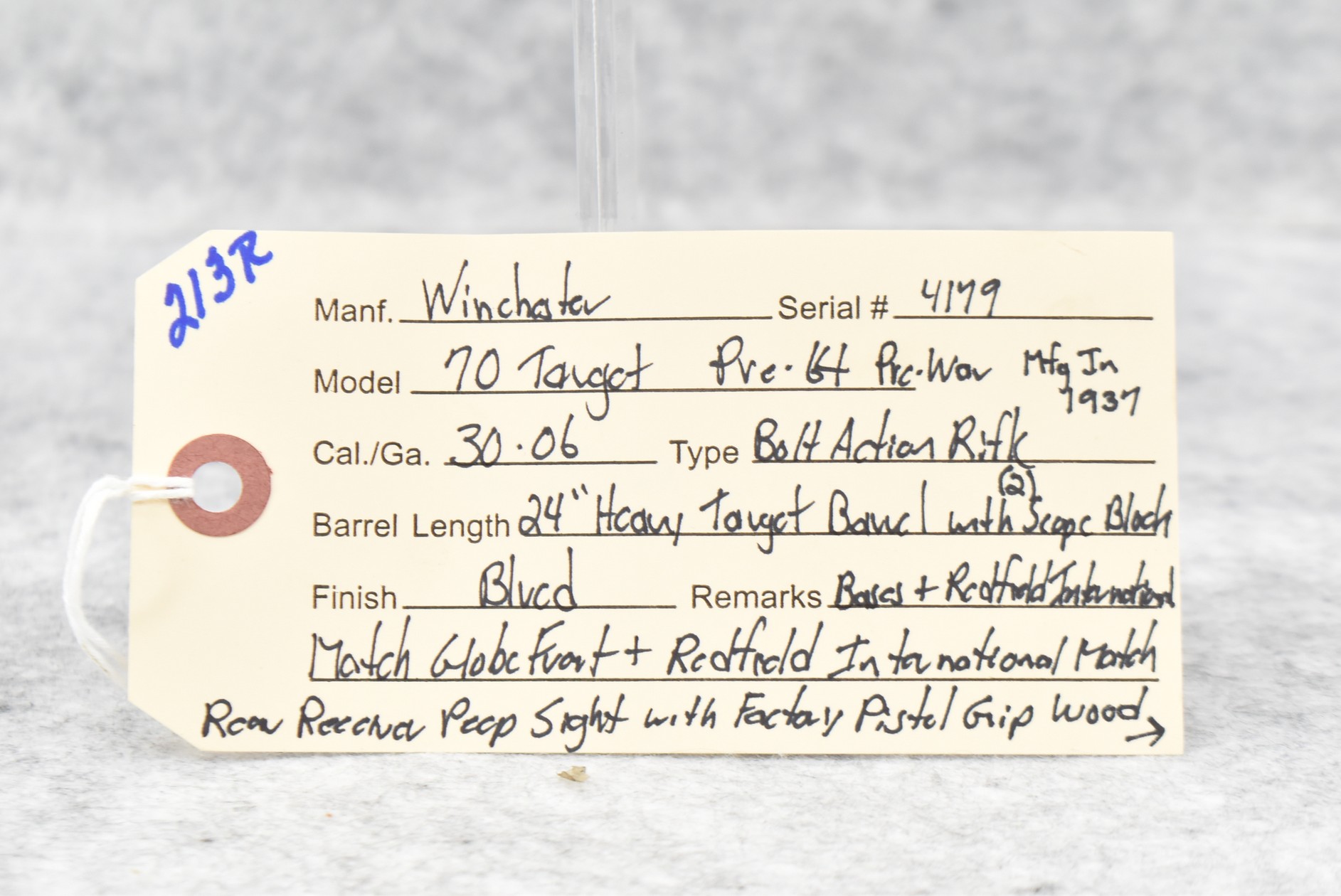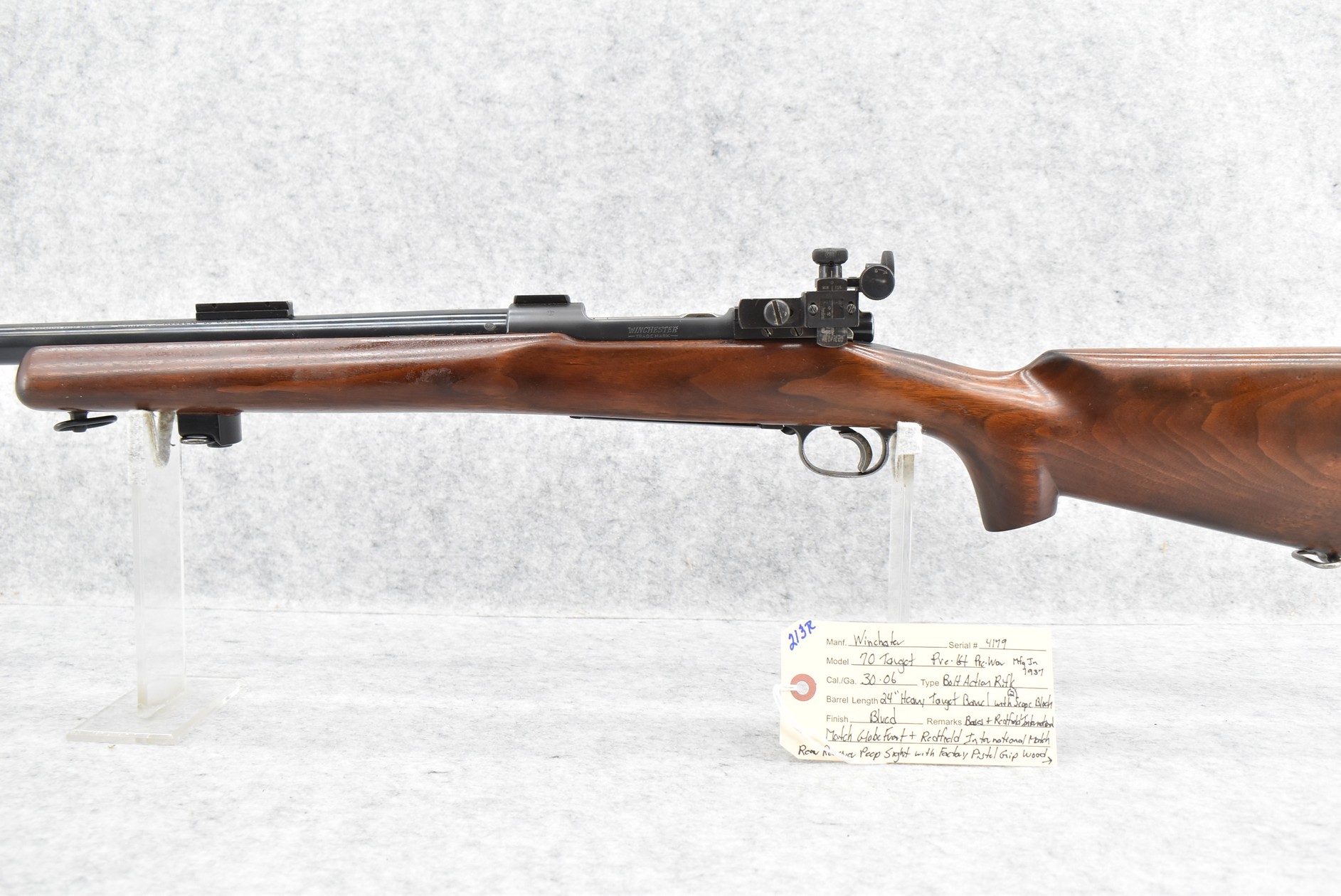 213R.     Winchester – Mod. 70 Target (Pre-64, Pre-War) – 30-06 Cal. Bolt Action Rifle – w/24” Factory Heavy Target Barrel w/2 Scope Block Bases w/Redfield International Mach Globe Front & Redfield International Match Rear Receiver Peep Sight – w/Factory Pistol Grip Wood Stock w/Palm Stop Rail – w/Swivels – Mfg. 1937