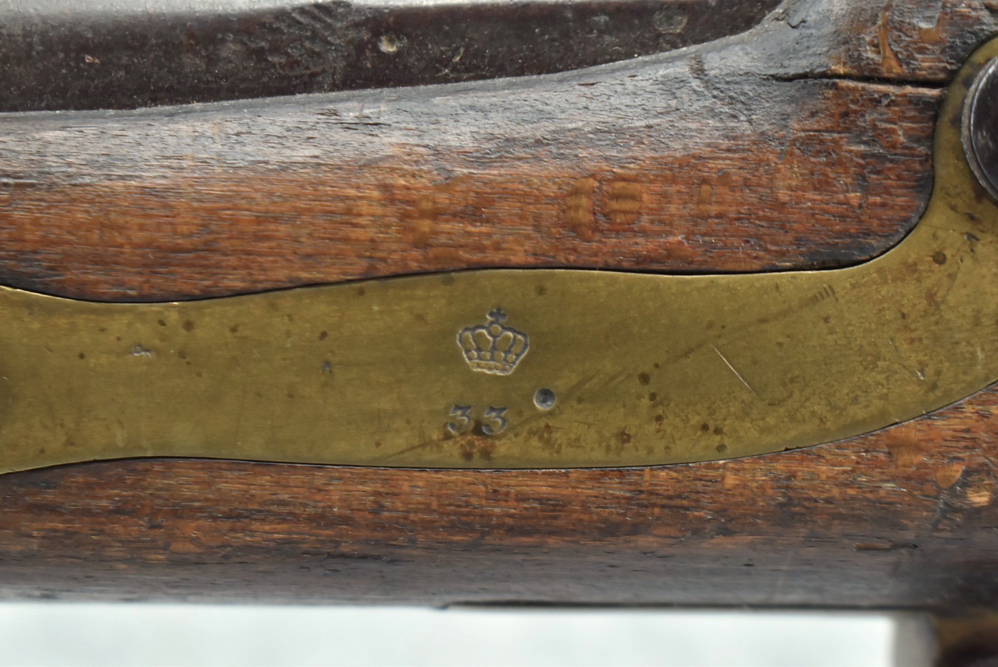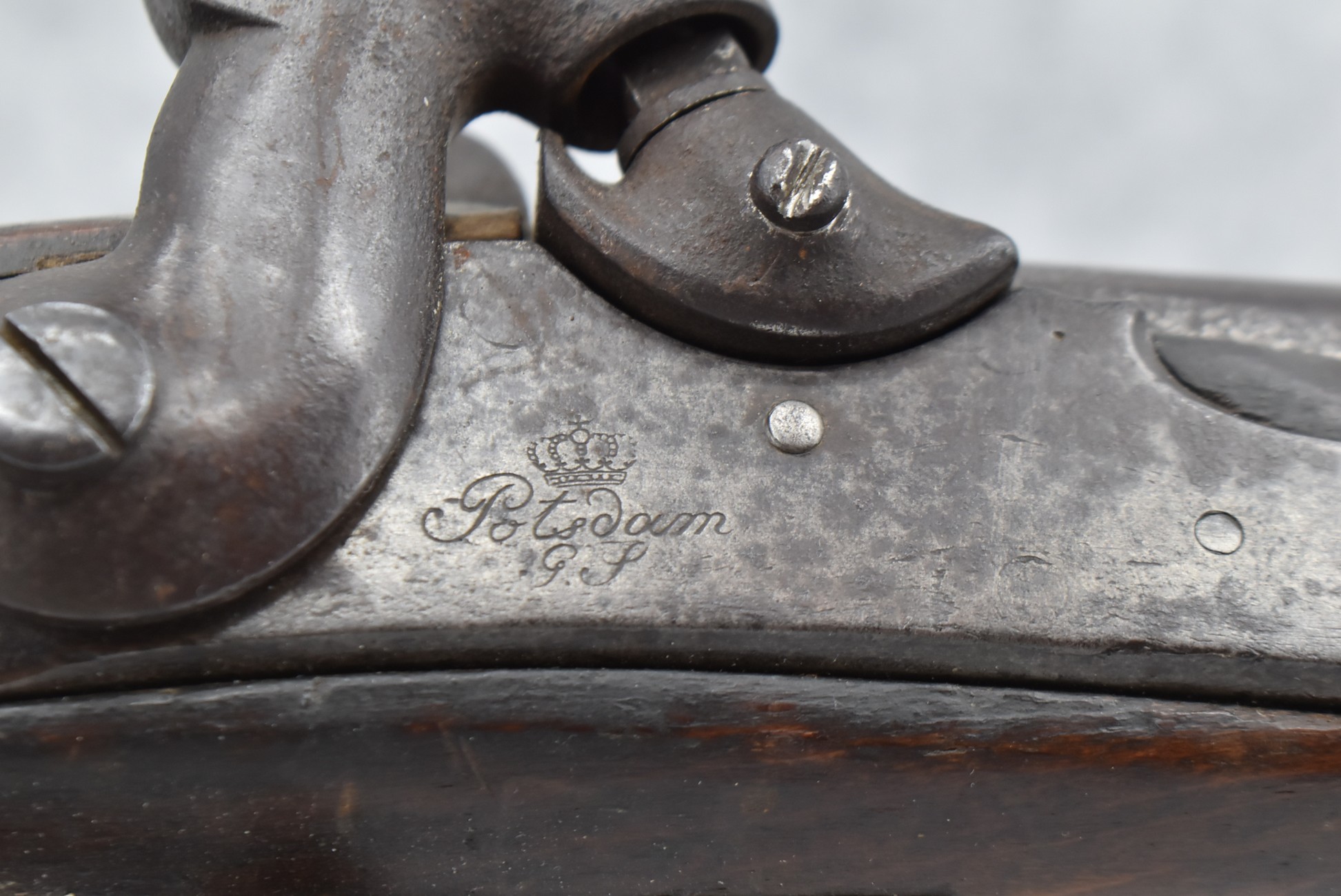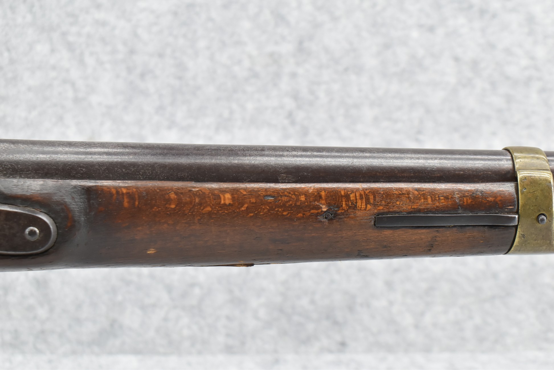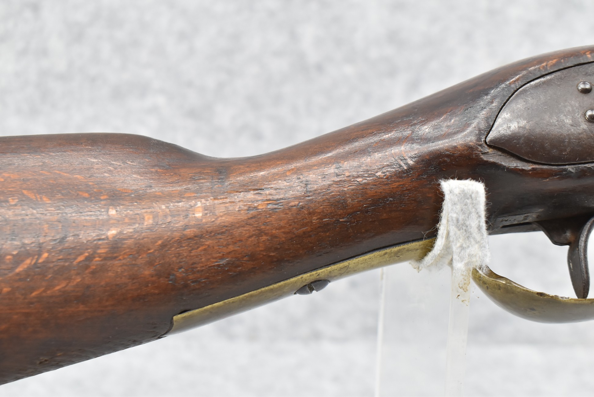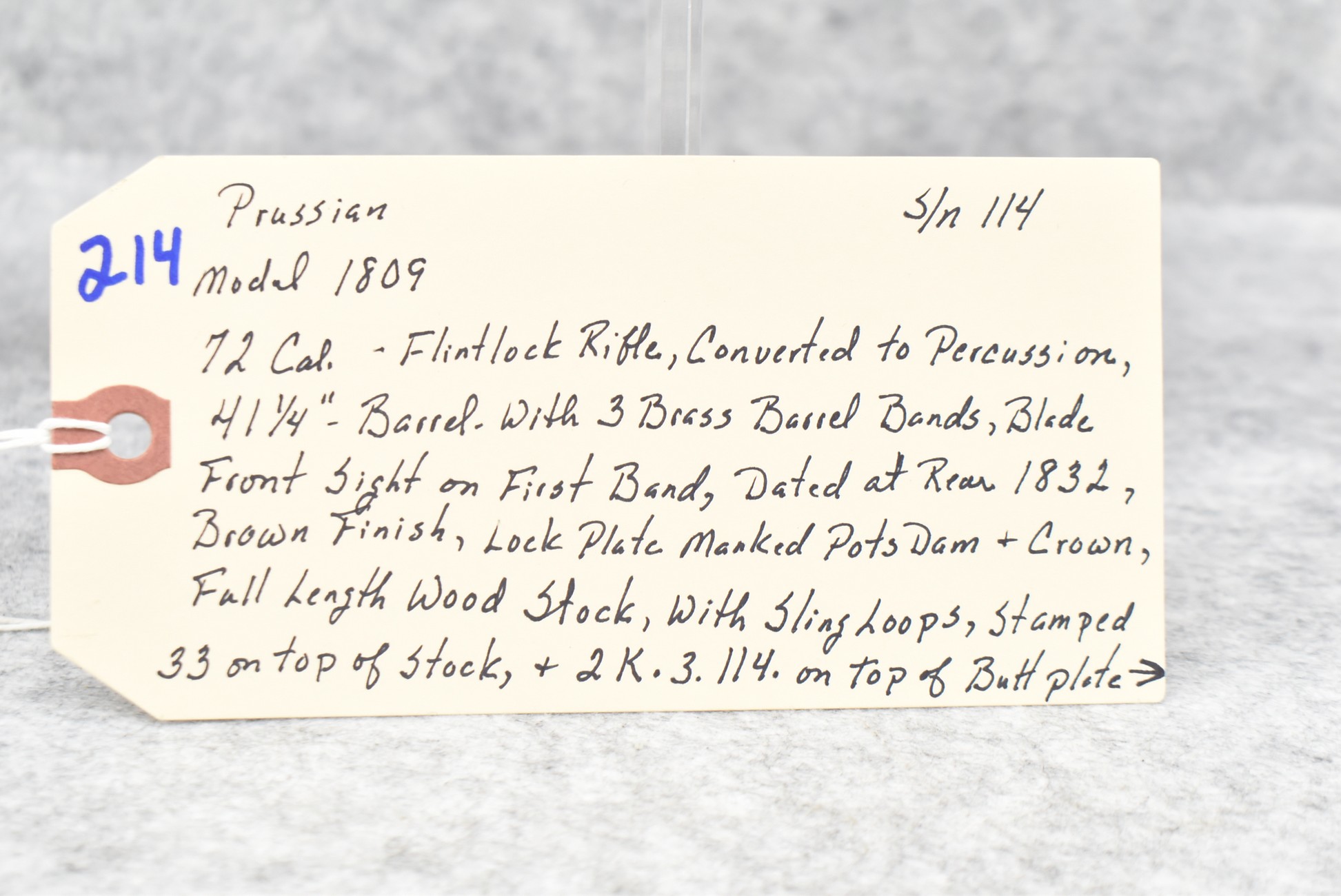 214. Prussian – Mod. 1809 – 72 Cal. Flintlock Rifle Converted to Percussion Musket – w/41 ¼” Barrel w/3 Brass Barrel Bands & Blade Front Sight on First Band – Brown Finish – w/Full Length Wood Stock w/Metal Butt Plate – w/Sling Loops – Lock Plated Marked “Potsdam” w/A Crown – “33” Stamped on Top of Stock & “2K.3.114.” on Top of Butt Plate w/Crown “33” Stamped on Trigger Guard & Brass Lock Strap on Left Side of Stock – Dated 1832