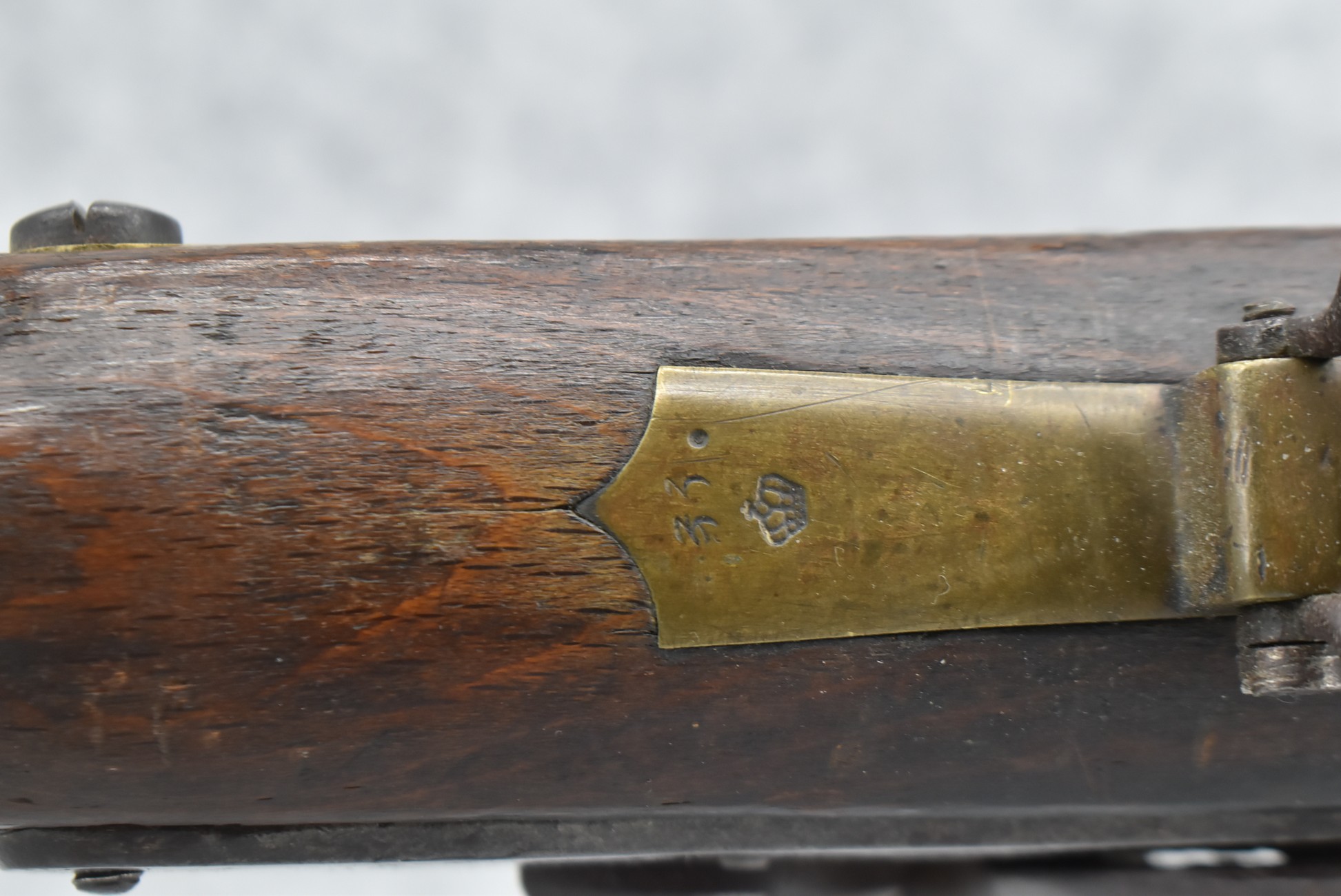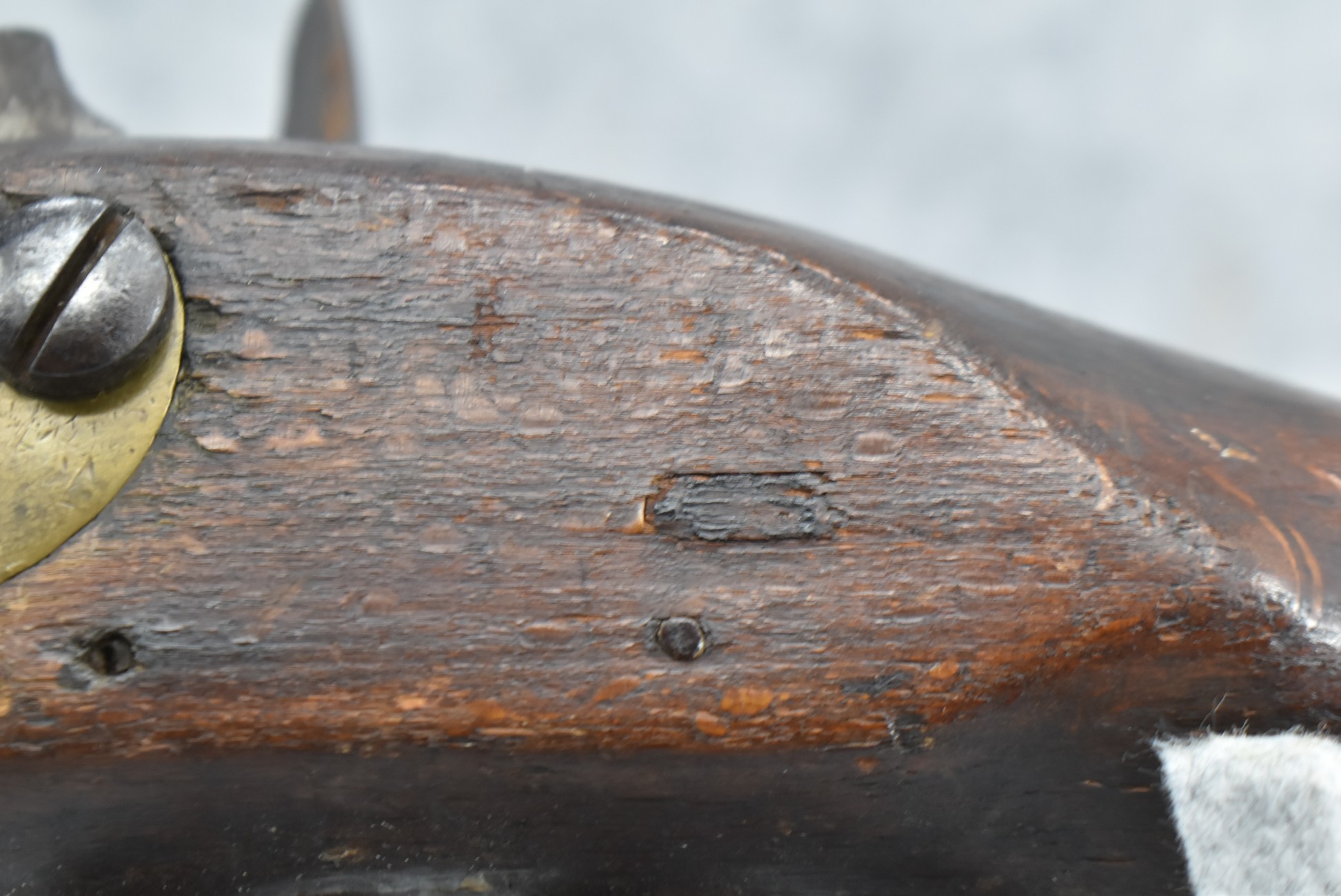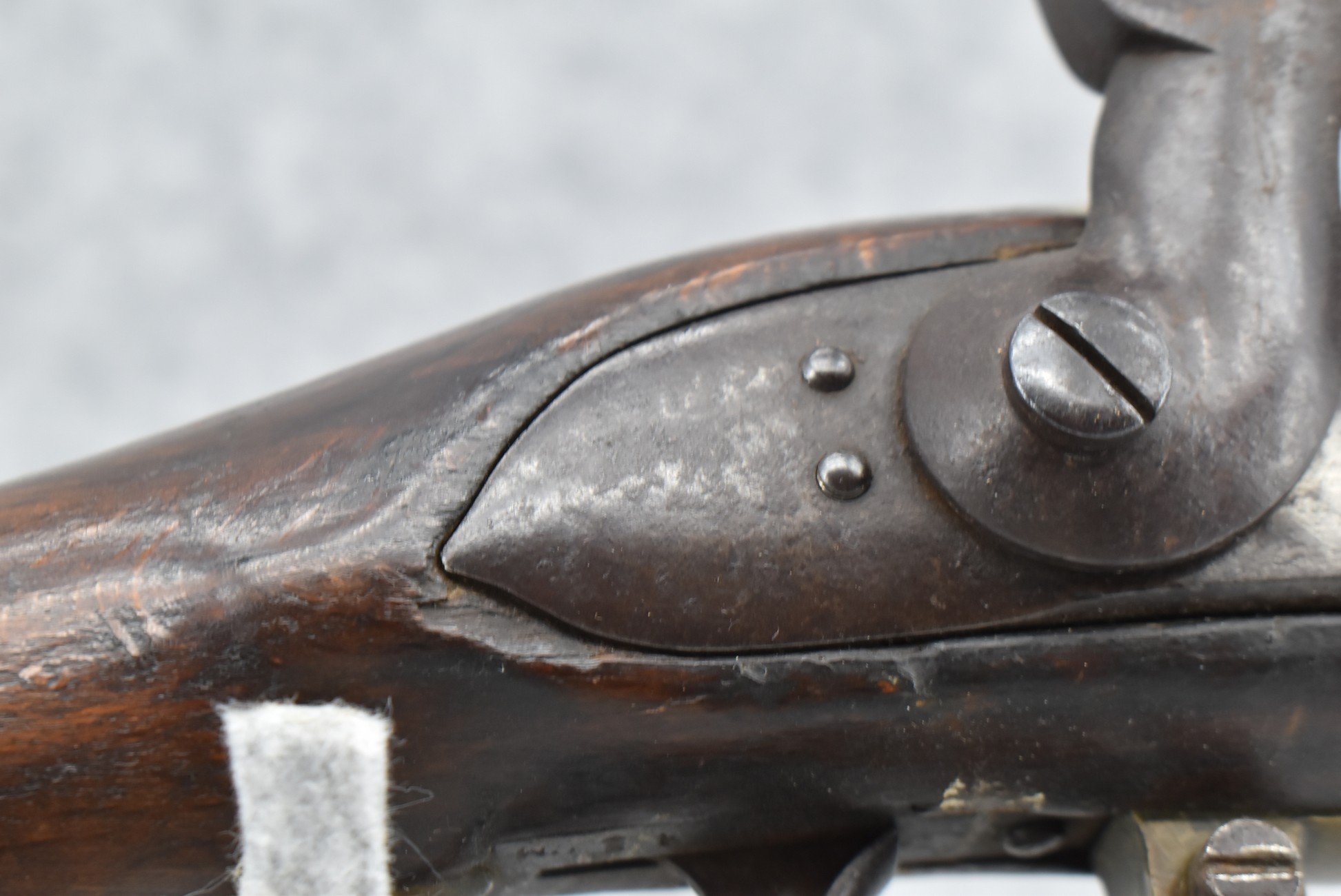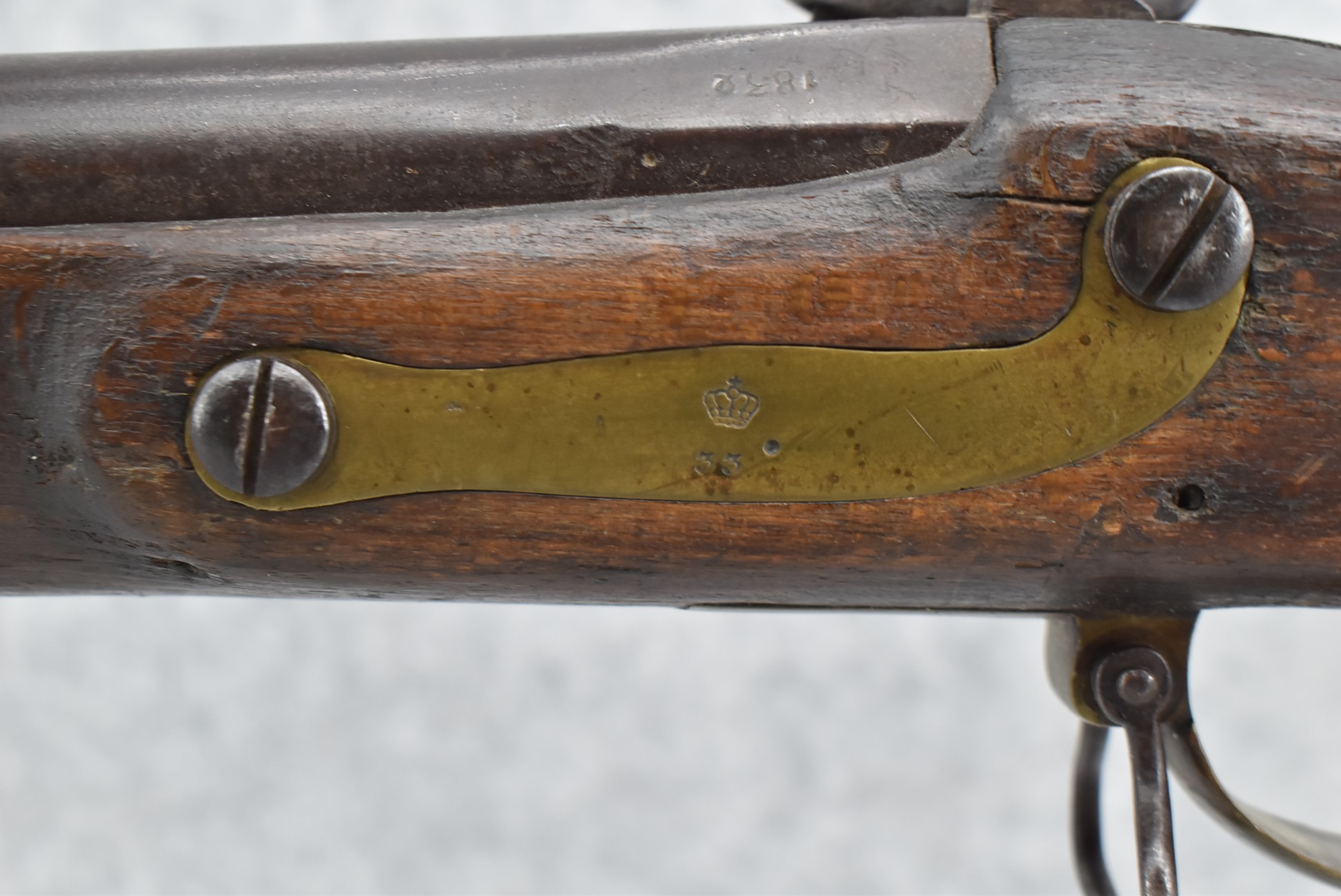 214. Prussian – Mod. 1809 – 72 Cal. Flintlock Rifle Converted to Percussion Musket – w/41 ¼” Barrel w/3 Brass Barrel Bands & Blade Front Sight on First Band – Brown Finish – w/Full Length Wood Stock w/Metal Butt Plate – w/Sling Loops – Lock Plated Marked “Potsdam” w/A Crown – “33” Stamped on Top of Stock & “2K.3.114.” on Top of Butt Plate w/Crown “33” Stamped on Trigger Guard & Brass Lock Strap on Left Side of Stock – Dated 1832