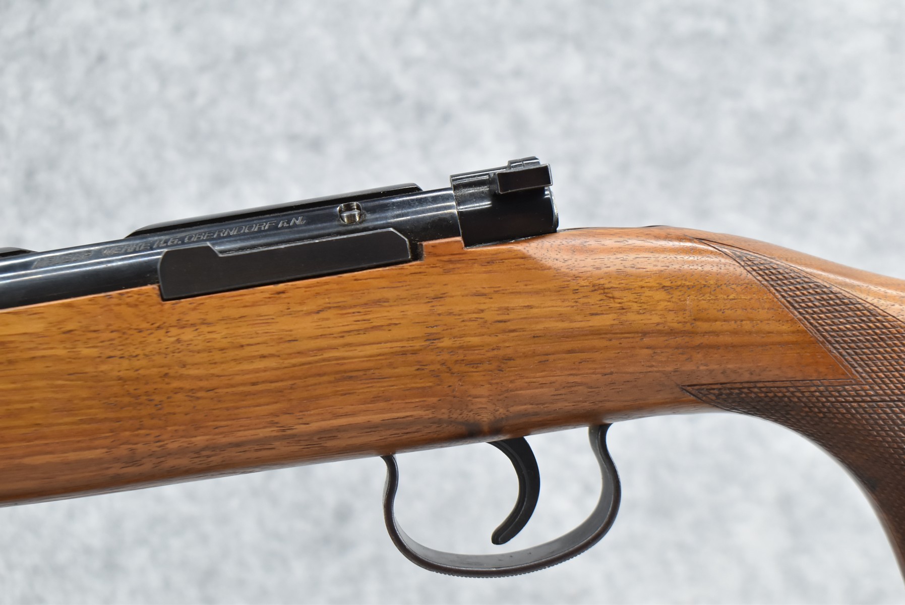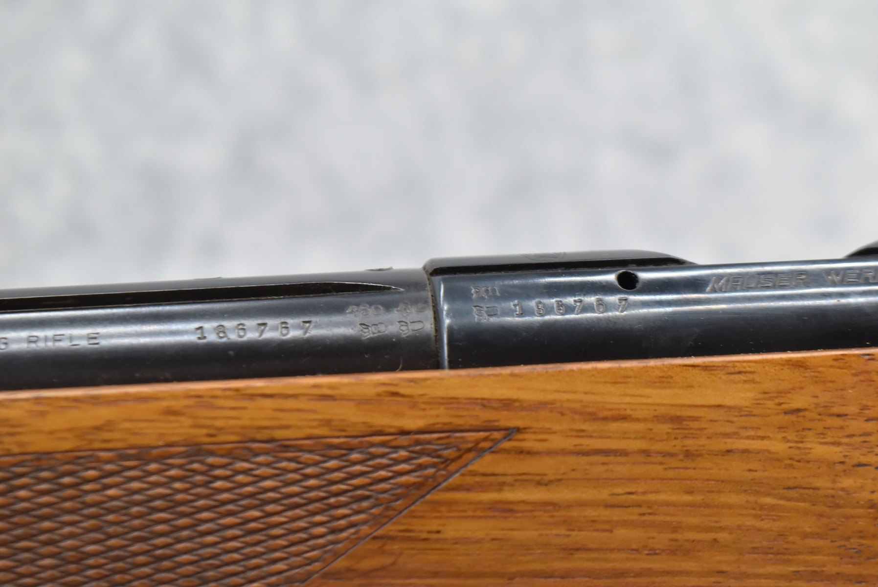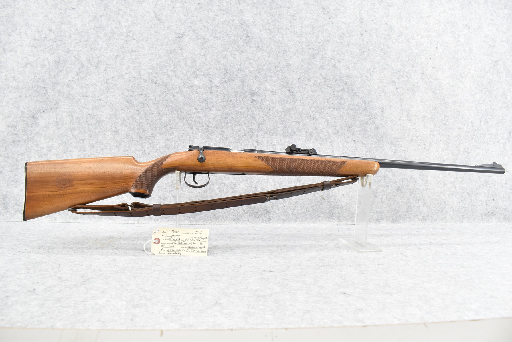 214R. Mauser – Mod. Sportmodell – 22 Long Rifle Cal. Bolt Action Single Shot Target Rifle – w/27” Barrel w/Blade Front & Adj. Rear Ladder Sights – Blued Finish – w/Checkered Capped Pistol Grip Wood Stock w/Factory Butt Plate – w/Grooved Receiver – w/Leather Sling