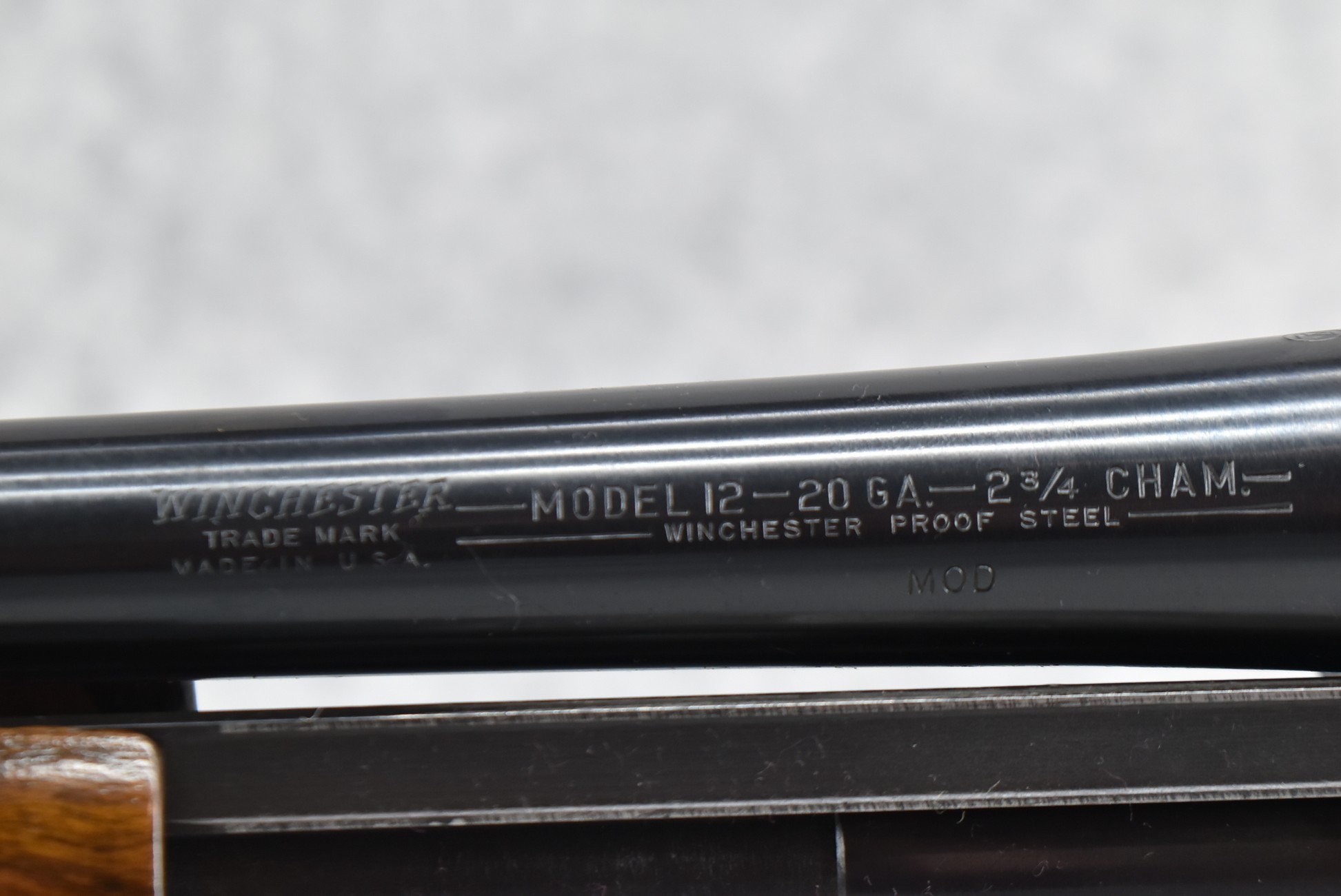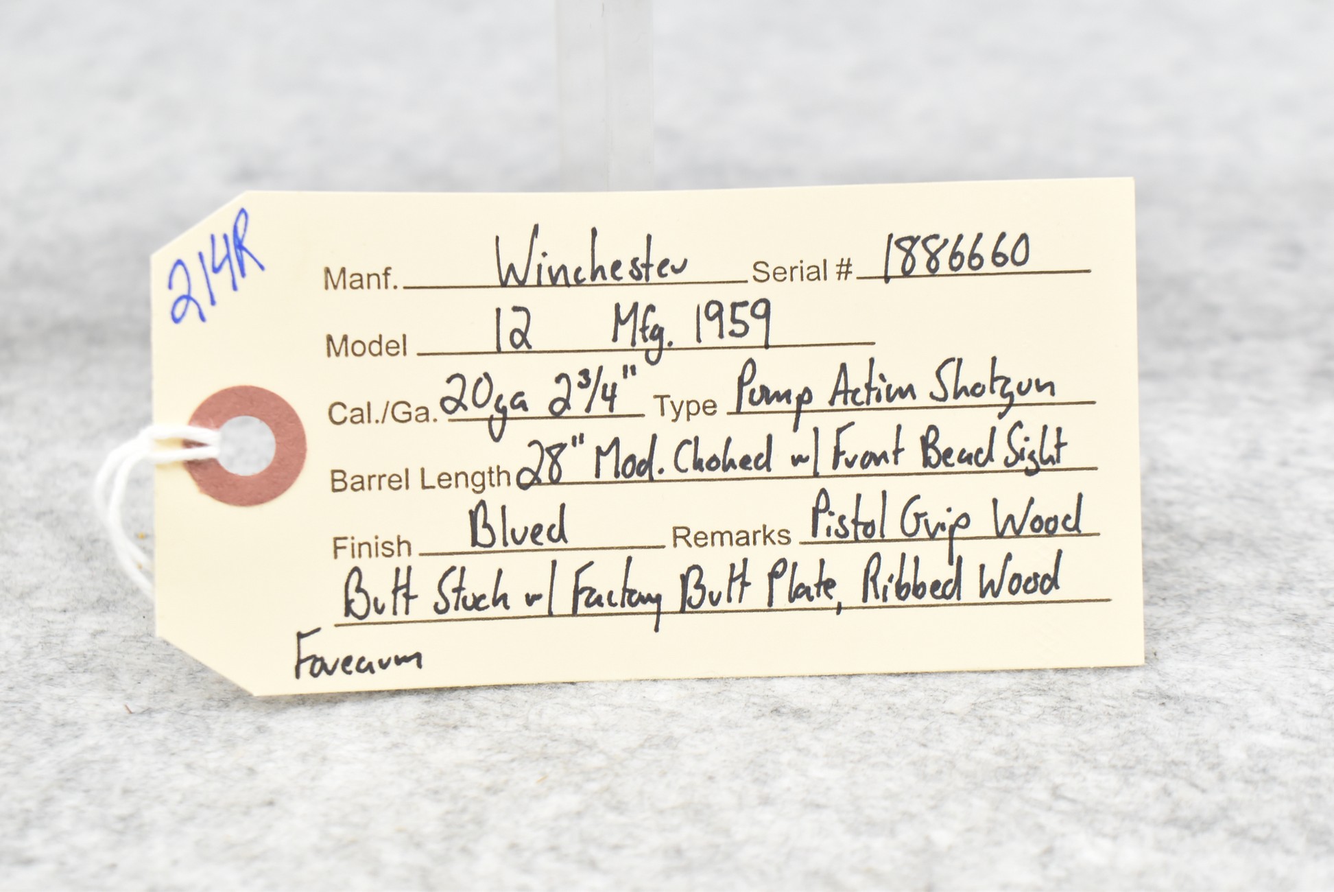 214R. Winchester – Mod. 12 – 20ga. 2 ¾” Pump Action Shotgun – w/28” Mod. Choked Barrel w/Front Bead Sight – Blued Finish – w/Pistol Grip Wood Butt Stock w/Factory Butt Plate & Ribbed Wood Forearm – Mfg. 1959