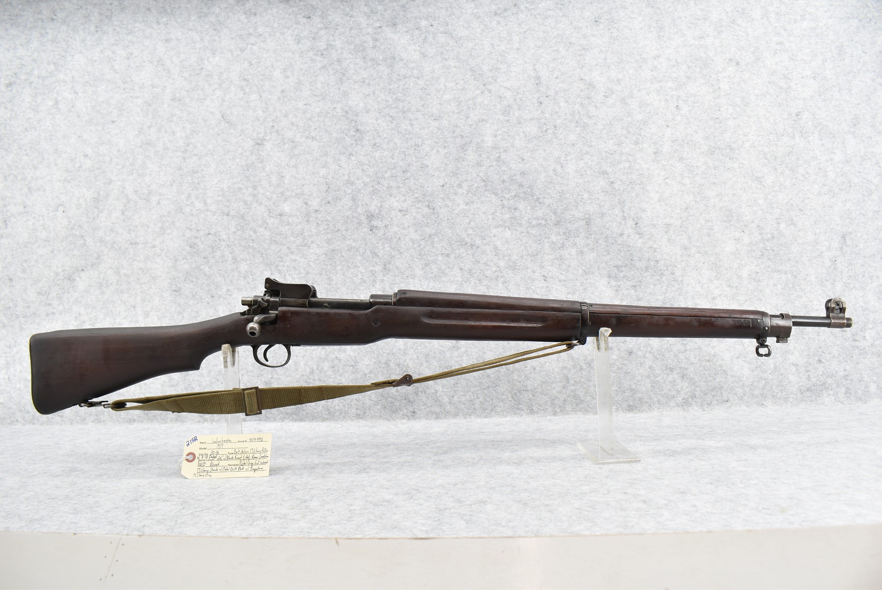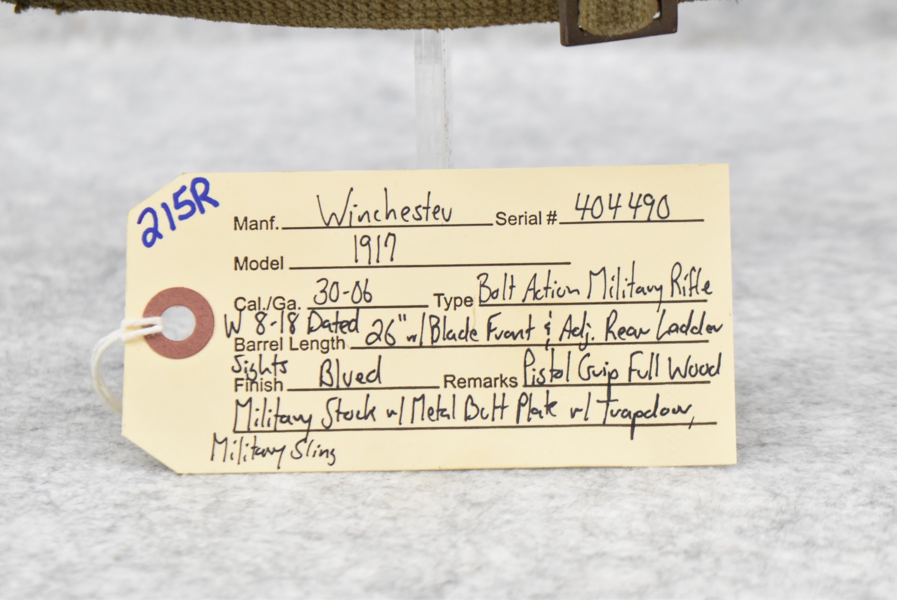 215R. Winchester – Mod. 1917 – 30-06 Cal. Bolt Action Military Rifle – w/26” W 8-18 Barrel w/Blade Front & Adj. Rear Ladder Sights – Blued Finish – w/Pistol Grip Full Wood Military Stock w/Metal Butt Plate w/Trapdoor – w/Military Sling