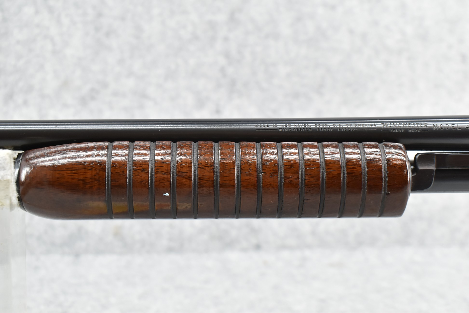 215R. Winchester – Mod. 42 – 410ga. 3” Pump Action Shotgun – w/28” Full Choked Barrel w/Front Bead Sight – Blued Finish – w/Pistol Grip Wood Butt Stock w/Factory Butt Plate & Ribbed Wood Forearm – w/Hang Tag – Mfg. 1947