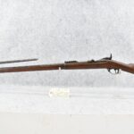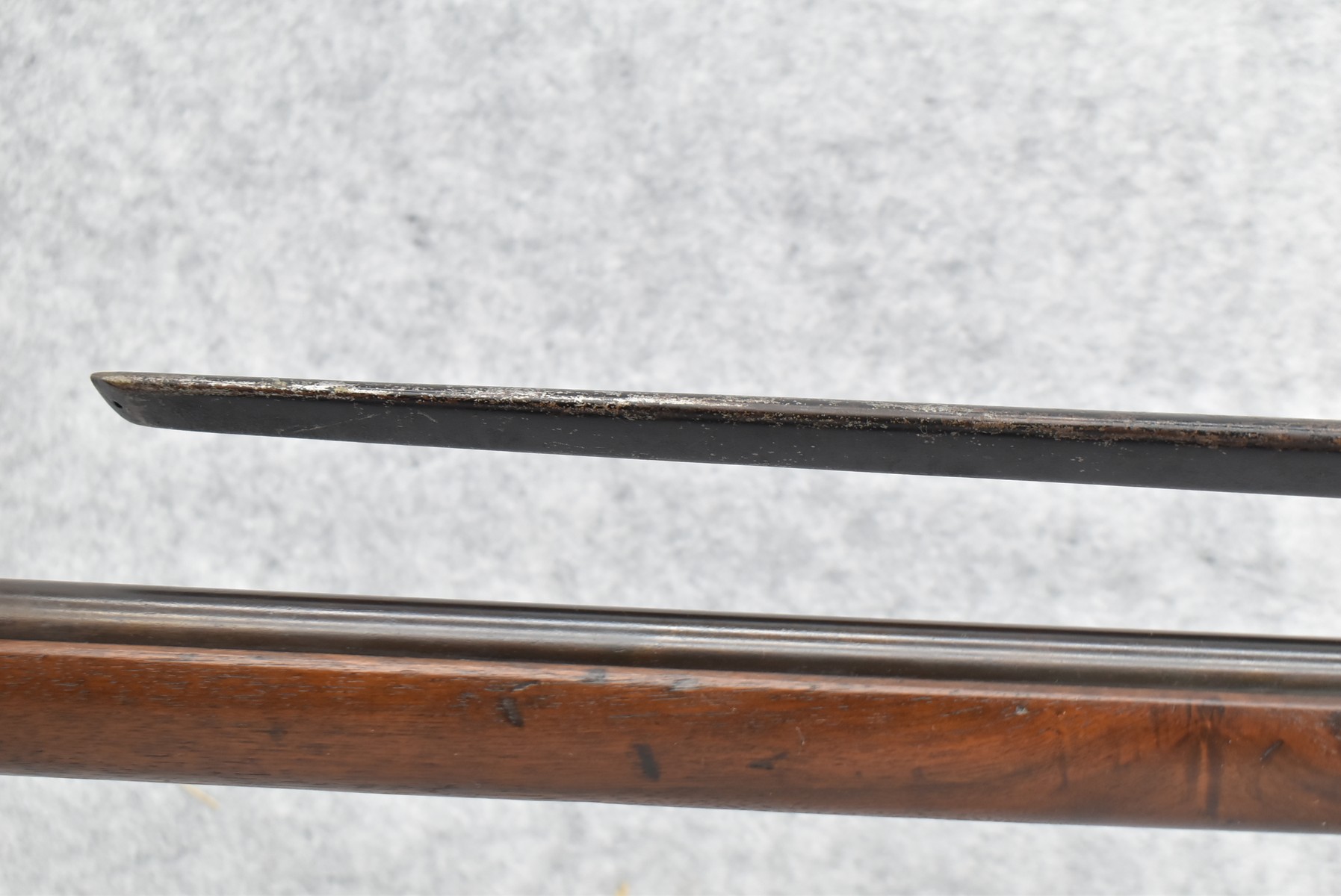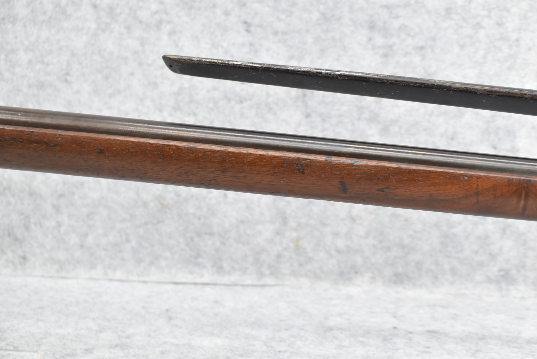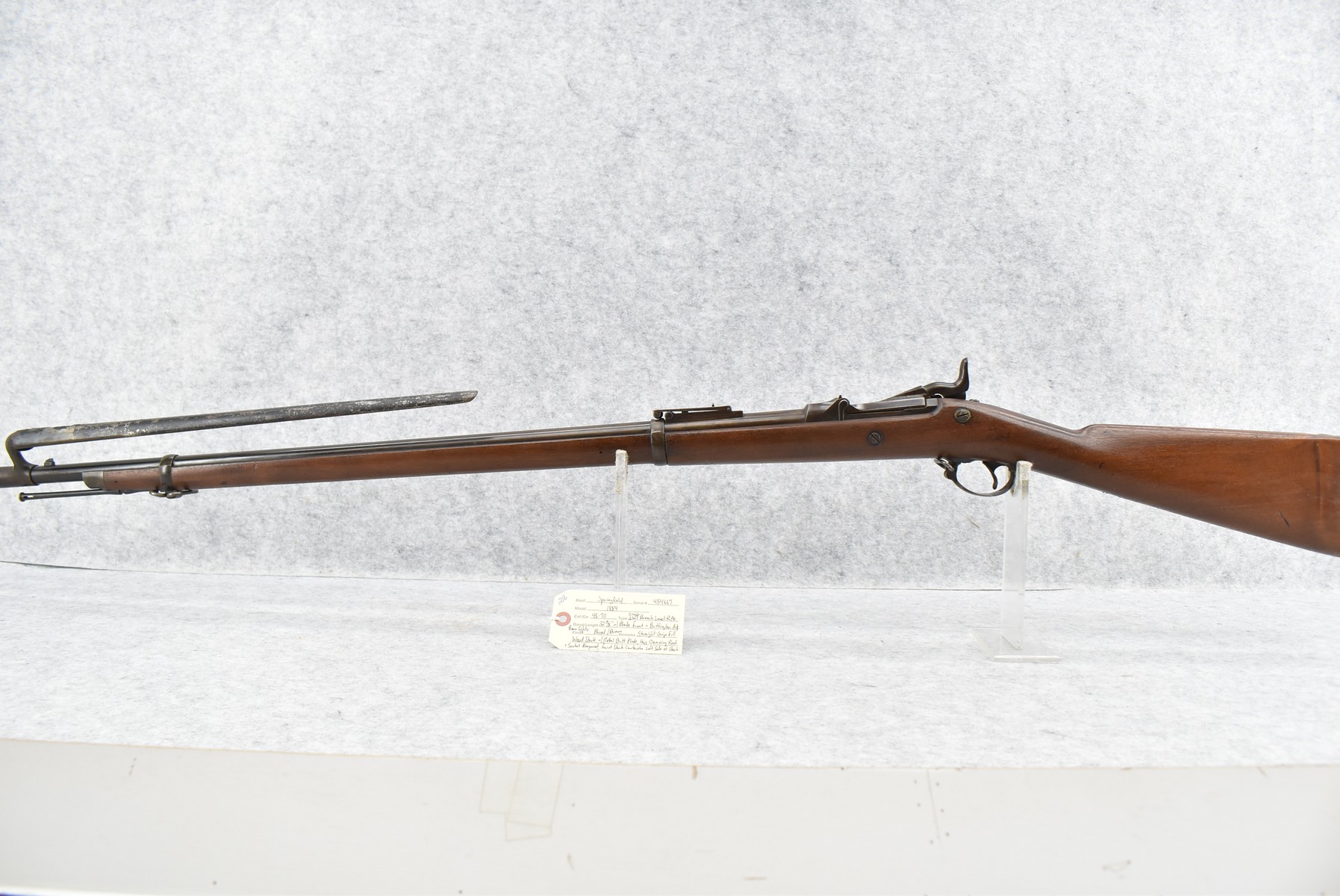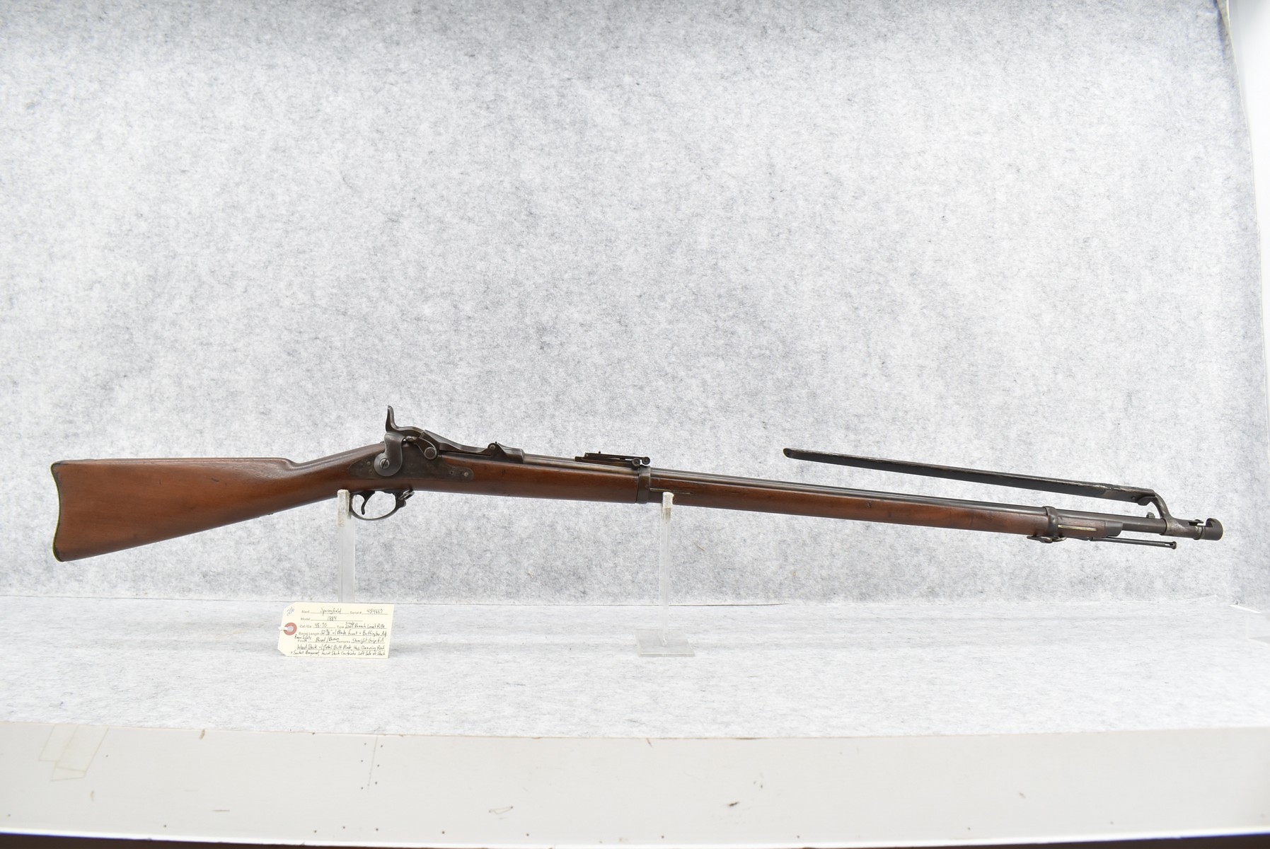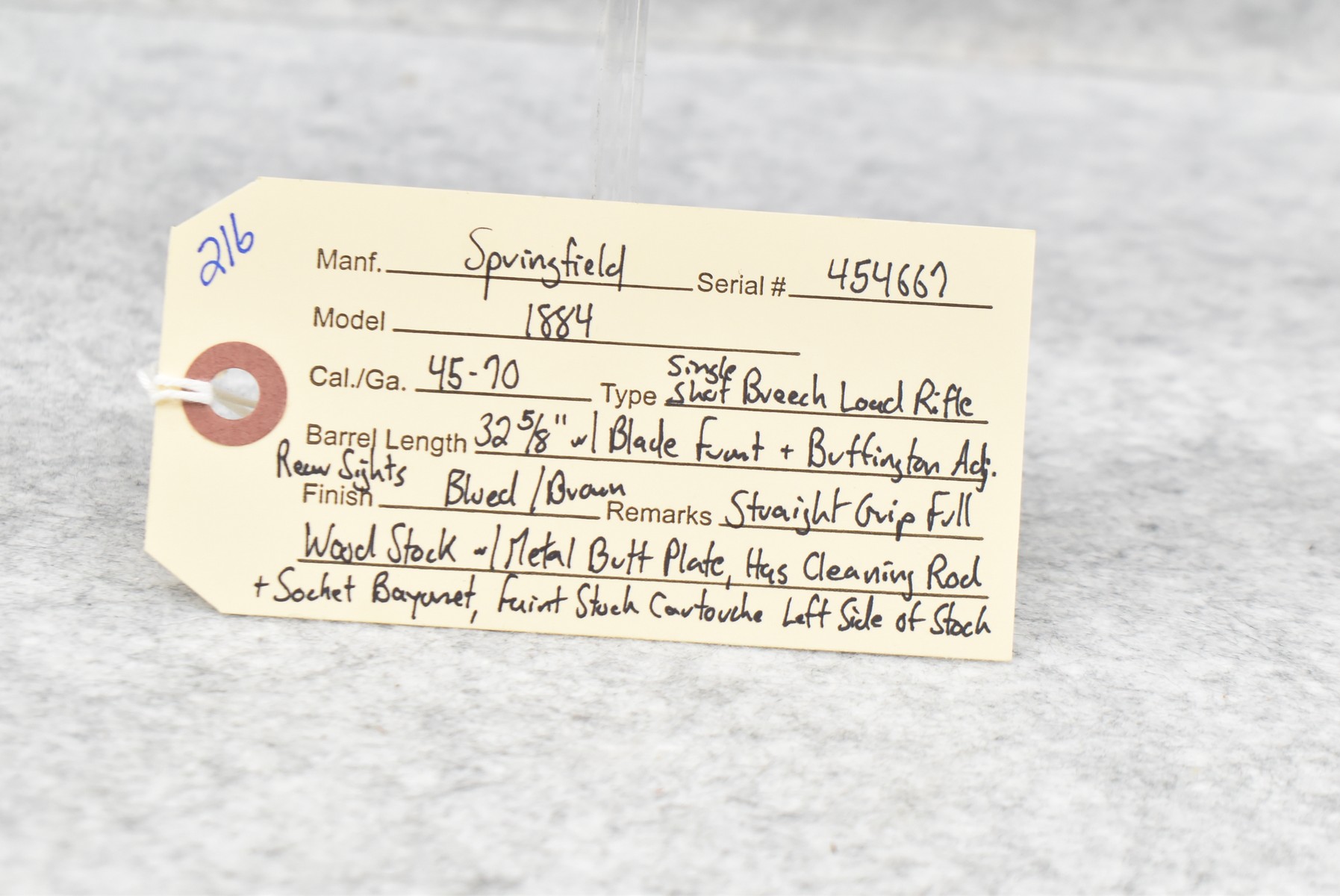216. Springfield – Mod. 1884 – 45-70 Cal. Single Shot Breech Loading Rifle – w/32 5/8” Barrel w/Blade Front & Buffington Adj. Rear Sights – Blued/Brown Finish – w/Straight Grip Full Wood Stock w/Metal Butt Plate w/Faint Stock Cartouche on Left Side of Stock – w/Cleaning Rod – w/Socket Bayonet & Scabbard