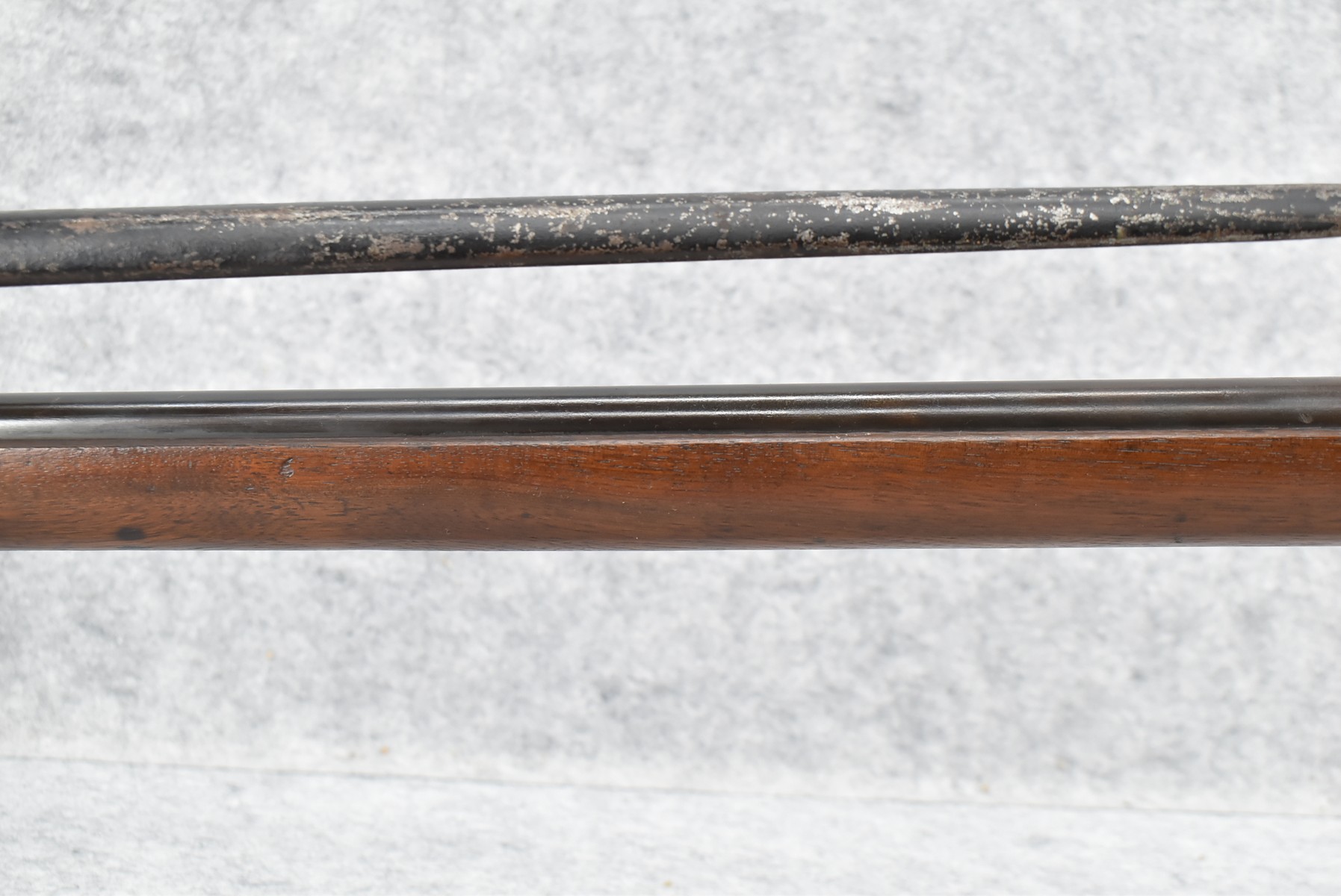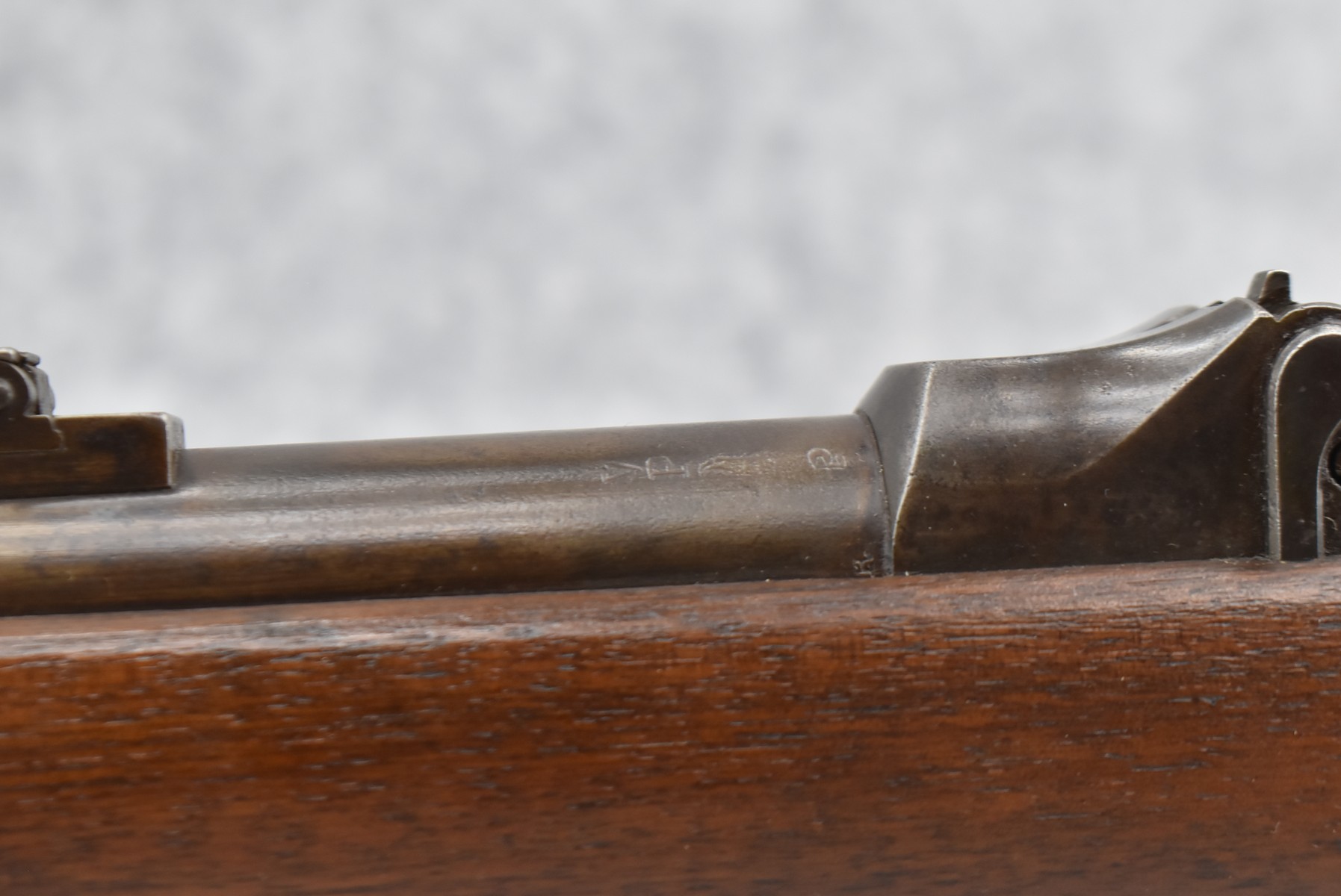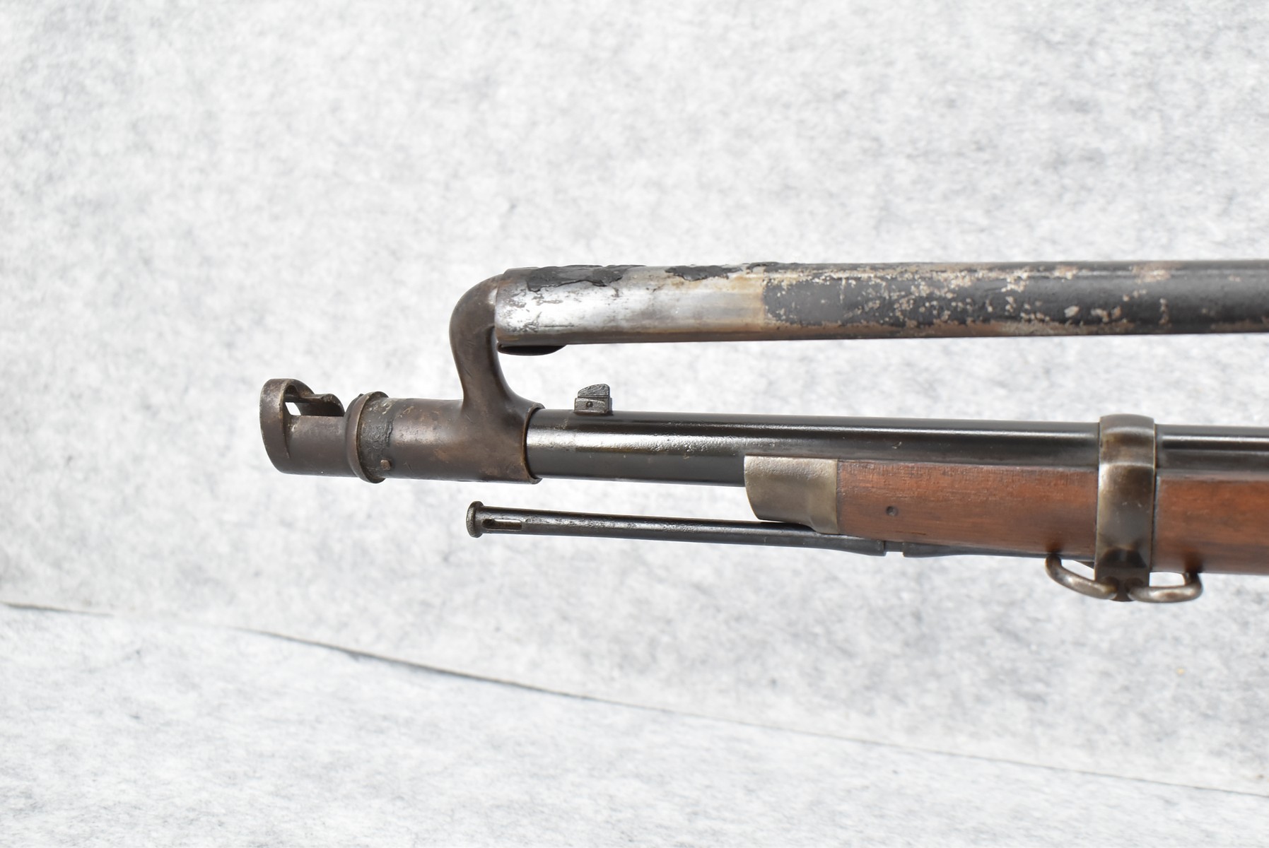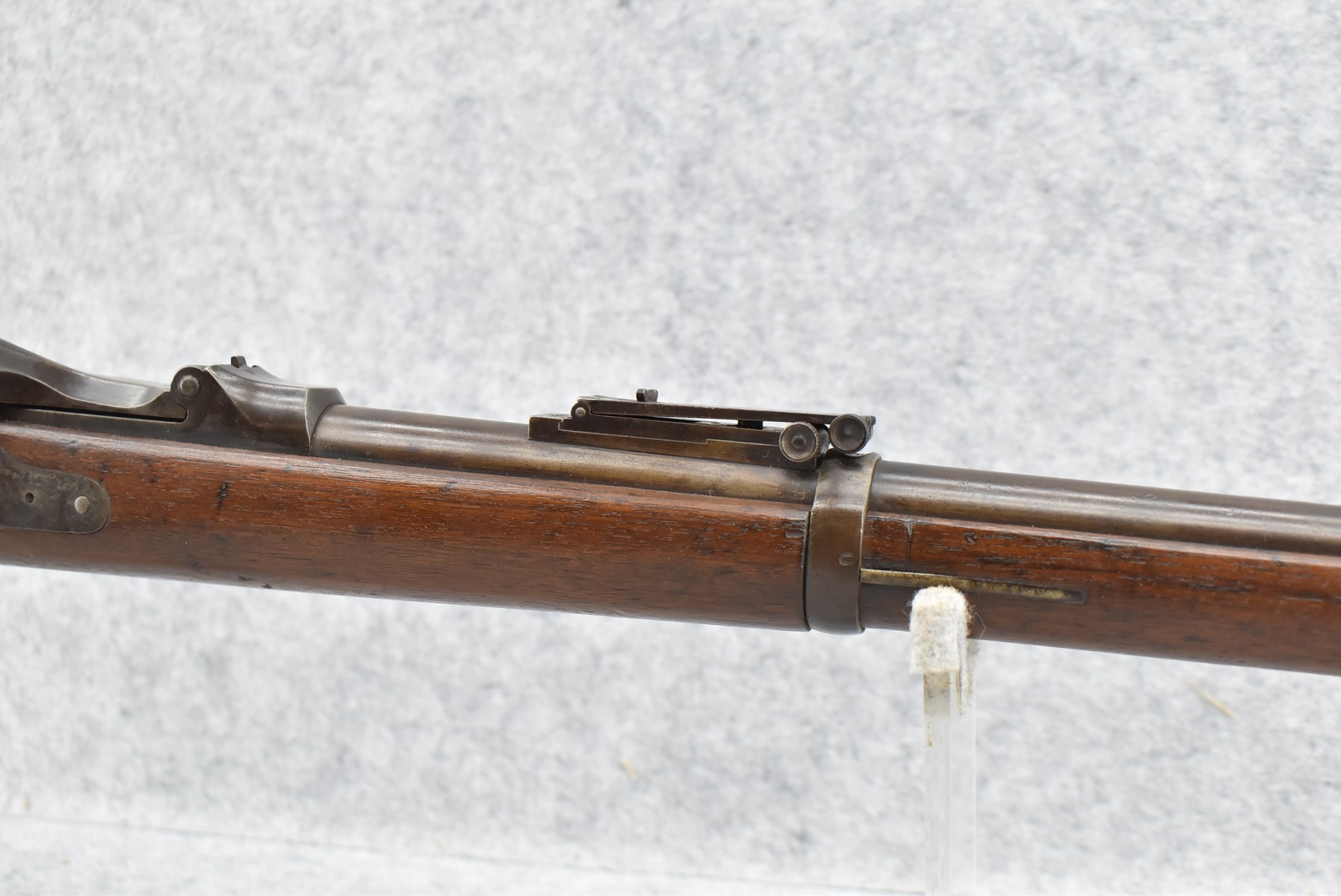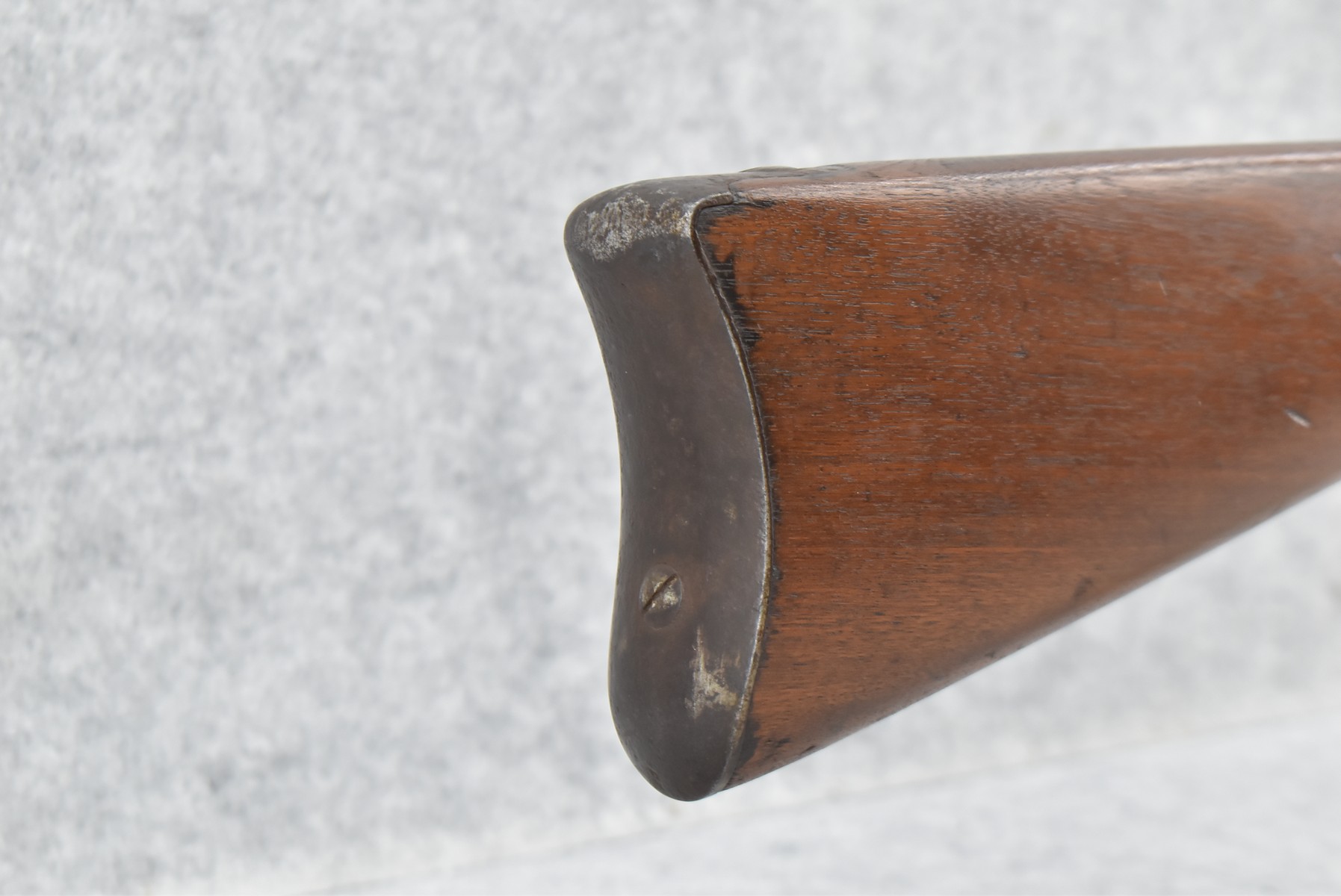 216. Springfield – Mod. 1884 – 45-70 Cal. Single Shot Breech Loading Rifle – w/32 5/8” Barrel w/Blade Front & Buffington Adj. Rear Sights – Blued/Brown Finish – w/Straight Grip Full Wood Stock w/Metal Butt Plate w/Faint Stock Cartouche on Left Side of Stock – w/Cleaning Rod – w/Socket Bayonet & Scabbard