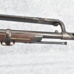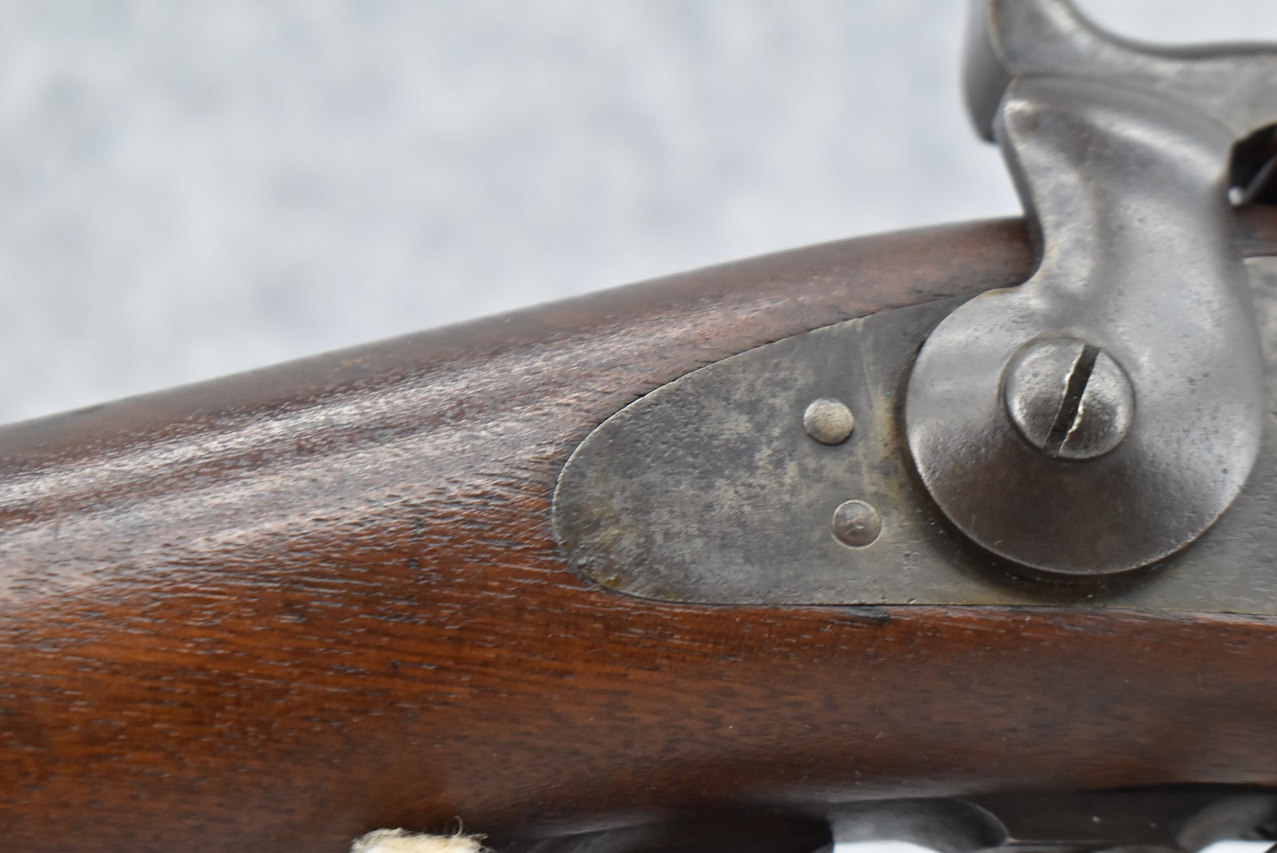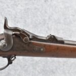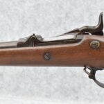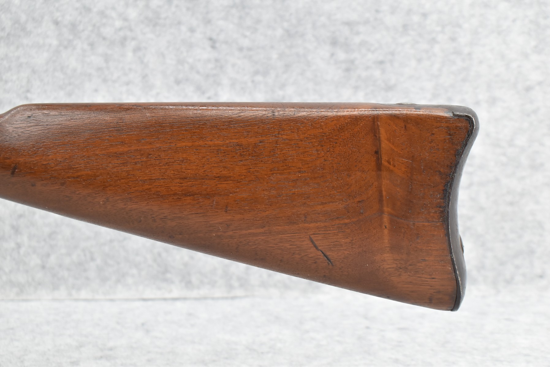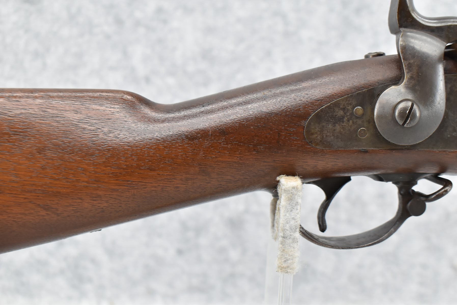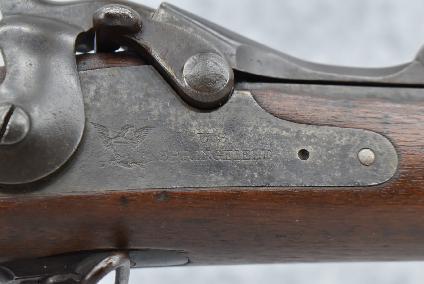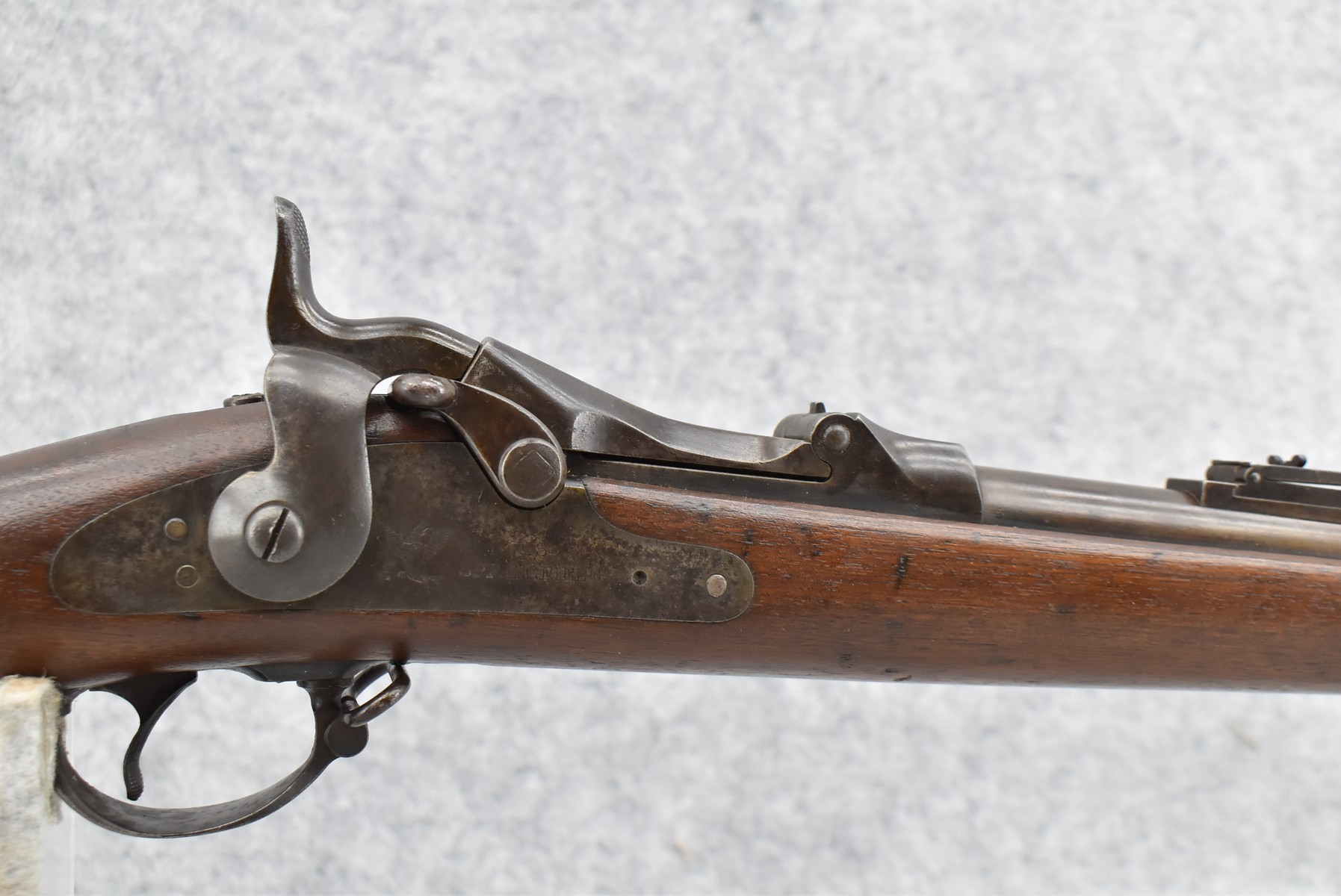 216. Springfield – Mod. 1884 – 45-70 Cal. Single Shot Breech Loading Rifle – w/32 5/8” Barrel w/Blade Front & Buffington Adj. Rear Sights – Blued/Brown Finish – w/Straight Grip Full Wood Stock w/Metal Butt Plate w/Faint Stock Cartouche on Left Side of Stock – w/Cleaning Rod – w/Socket Bayonet & Scabbard