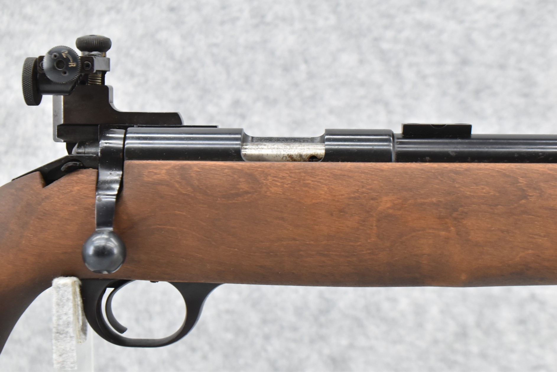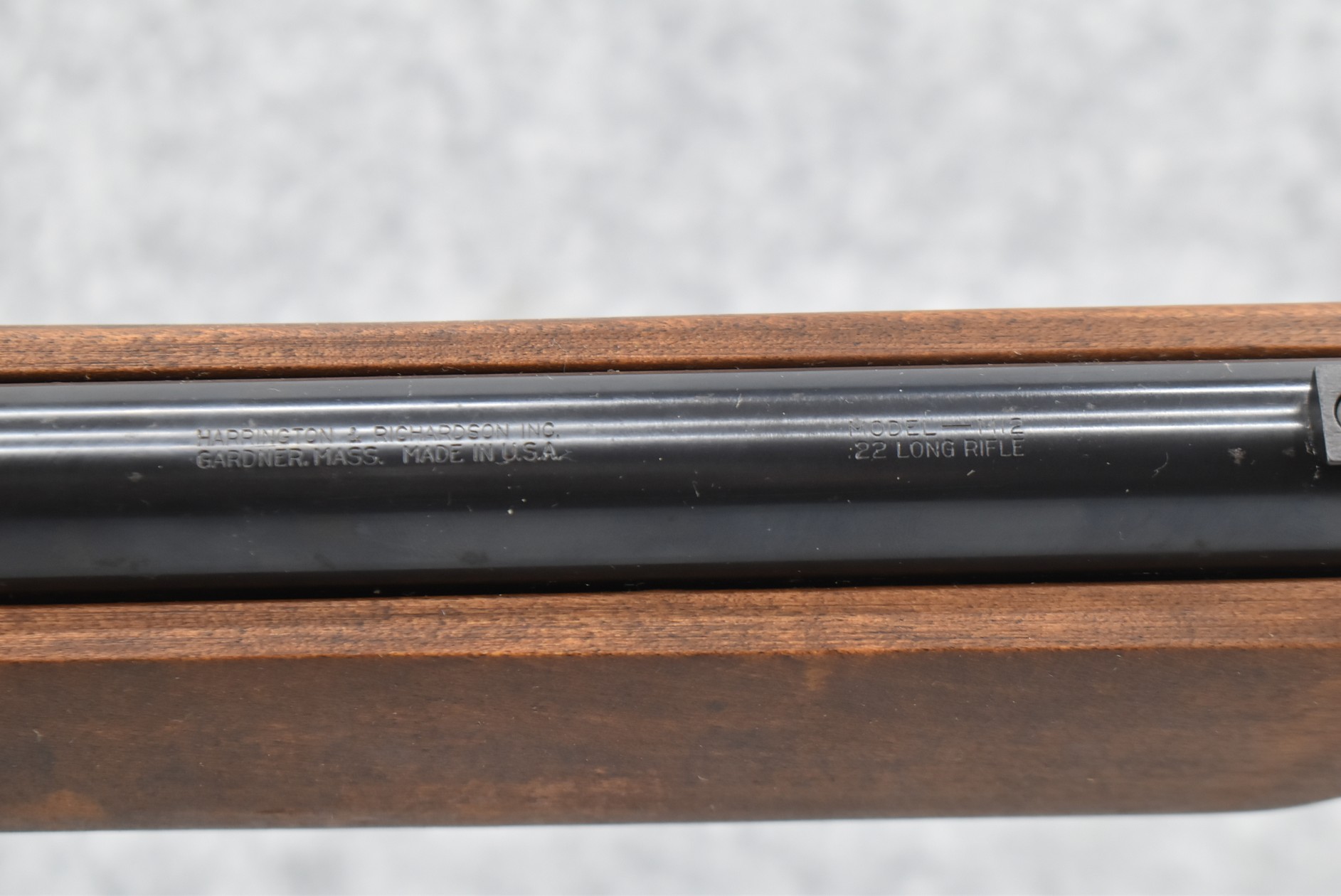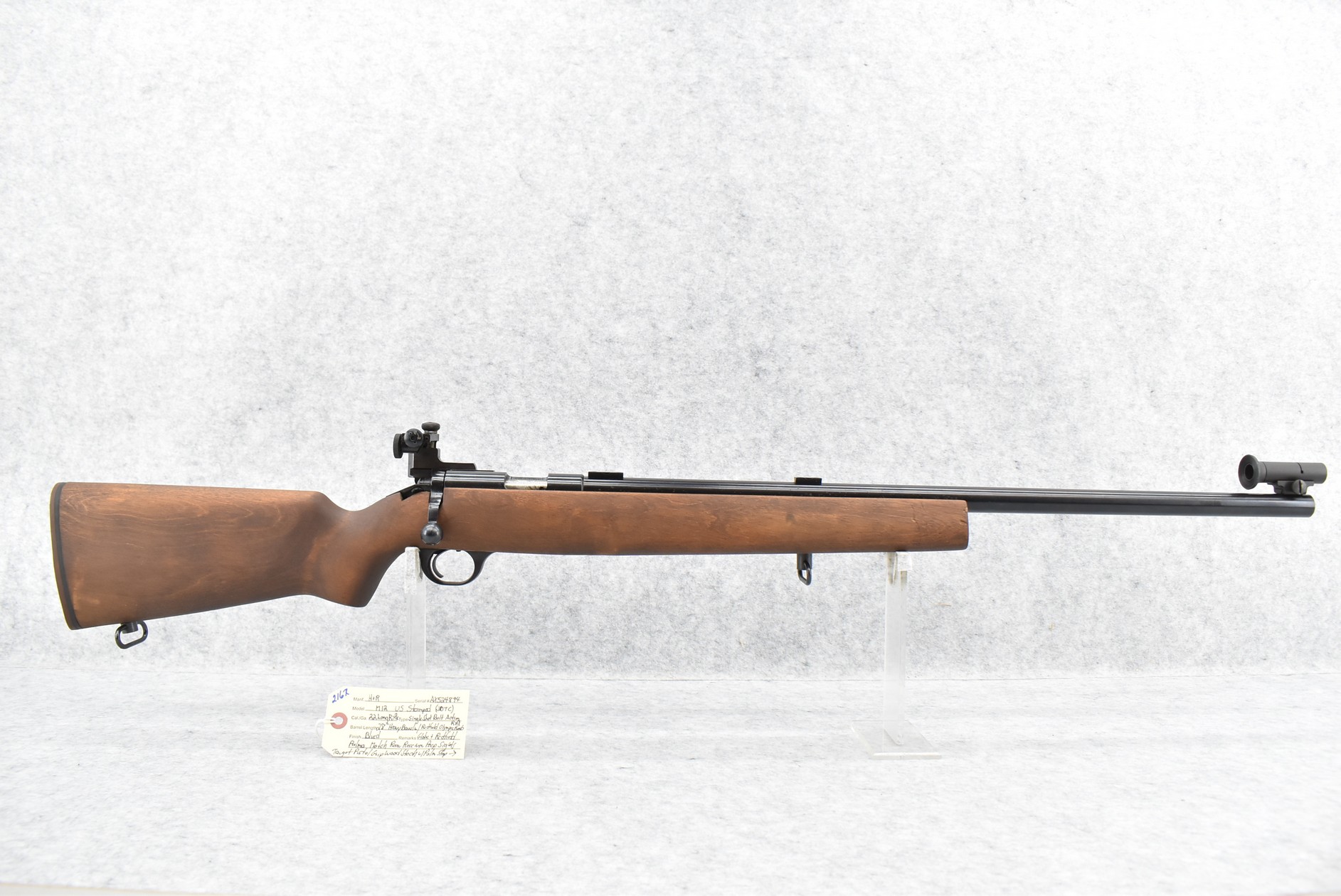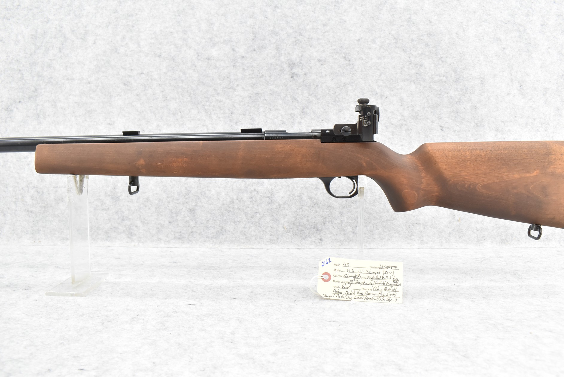 216R. H. & R. – Mod. M12 – U.S. Stamped (JROTC) – 22 Long Rifle Cal. Single Shot Bolt Action Rifle – w/28” Heavy Barrel w/Redfield Olympic Front Globe & Redfield Palma Match Rear Receiver Peep Sights – Blued Finish – w/Target Pistol Grip Wood Stock w/Palm Stop Rail & Swivels – w/2pc. Scope Blocks – Gun Weighs 11 lbs. – Mfg. 1981-1986