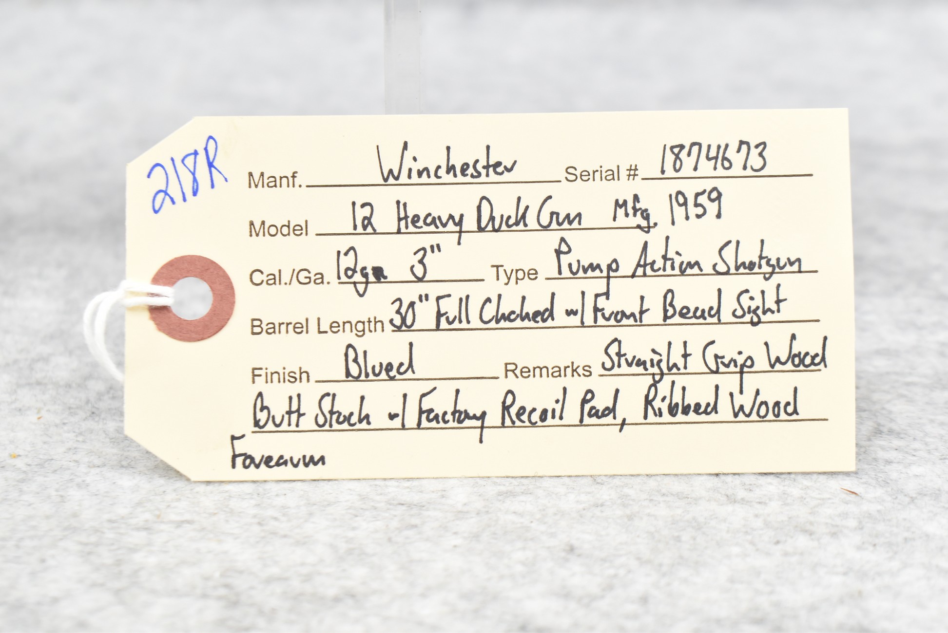 218R.     Winchester – Mod. 12 Heavy Duck Gun – 12ga. 3” Pump Action Shotgun – w/30” Full Choked Barrel w/Front Bead Sight – Blued Finish – w/Straight Grip Wood Butt Stock w/Factory Recoil Pad & Ribbed Wood Forearm – Mfg. 1959