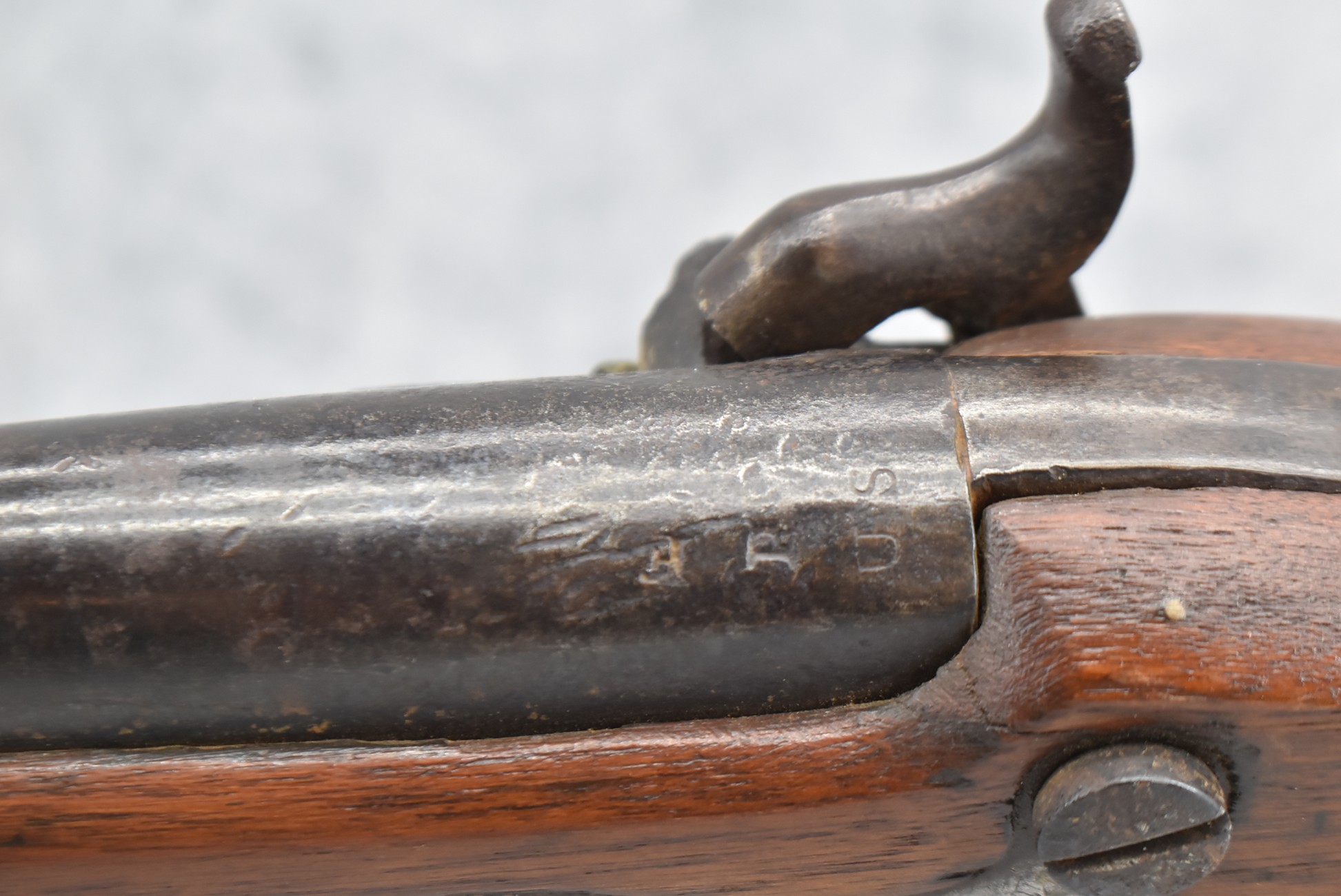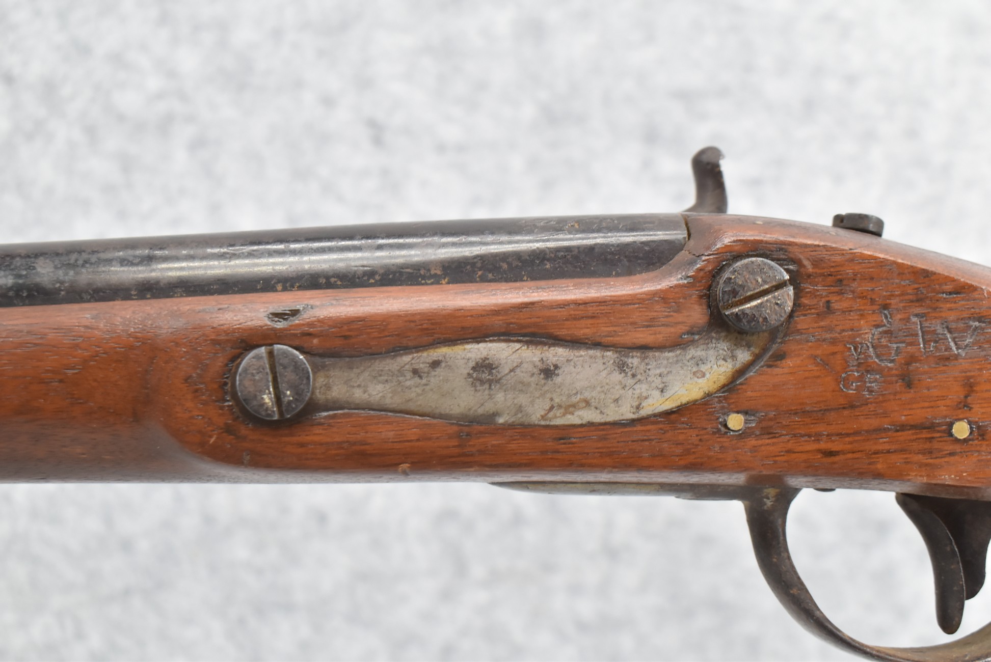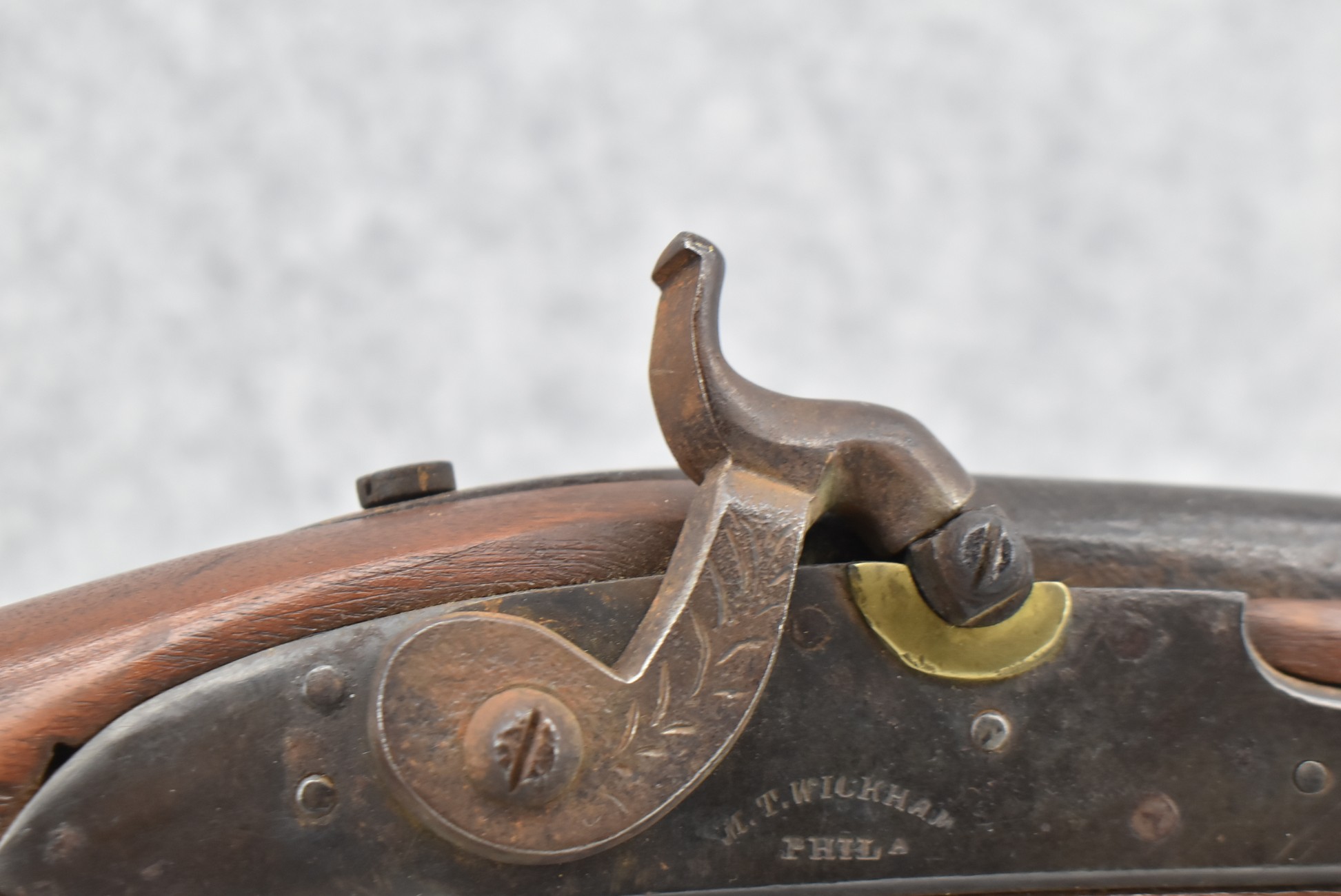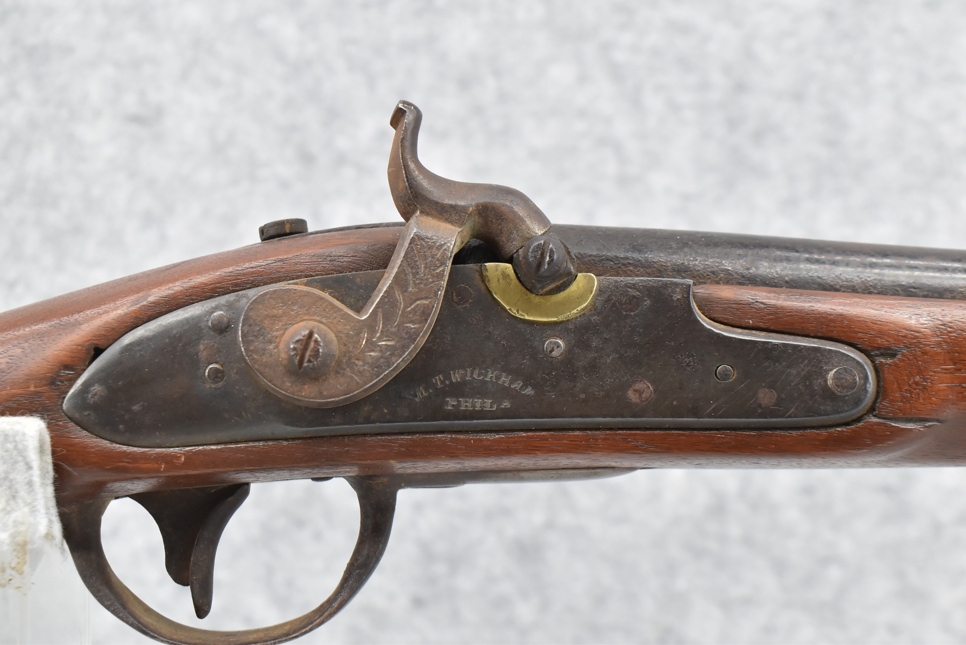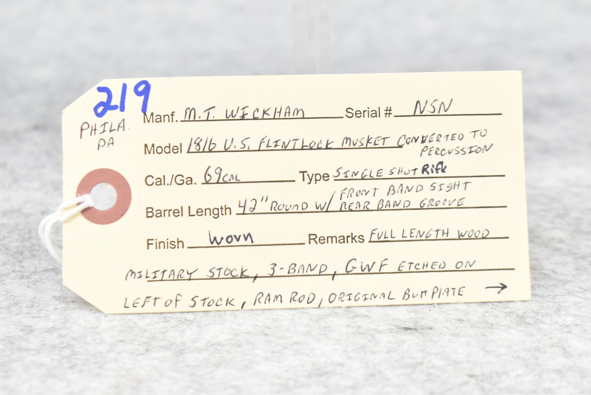 219. M.T. Wickham (Phila.PA) – Mod. 1816 U.S. Flintlock Musket Converted to Percussion – 69 Cal. Single Shot Rifle – w/42” Round Barrel w/Front Band Sight & Rear Band Groove Sight – Worn Finish – w/Full Length Wood Military Stock w/Original Butt Plate – w/“GWF” Etched on Left Side of Stock – w/3 Barrel Bands – w/Ram Rod – Approx. 16,600 Mfg. Between 1822-1837