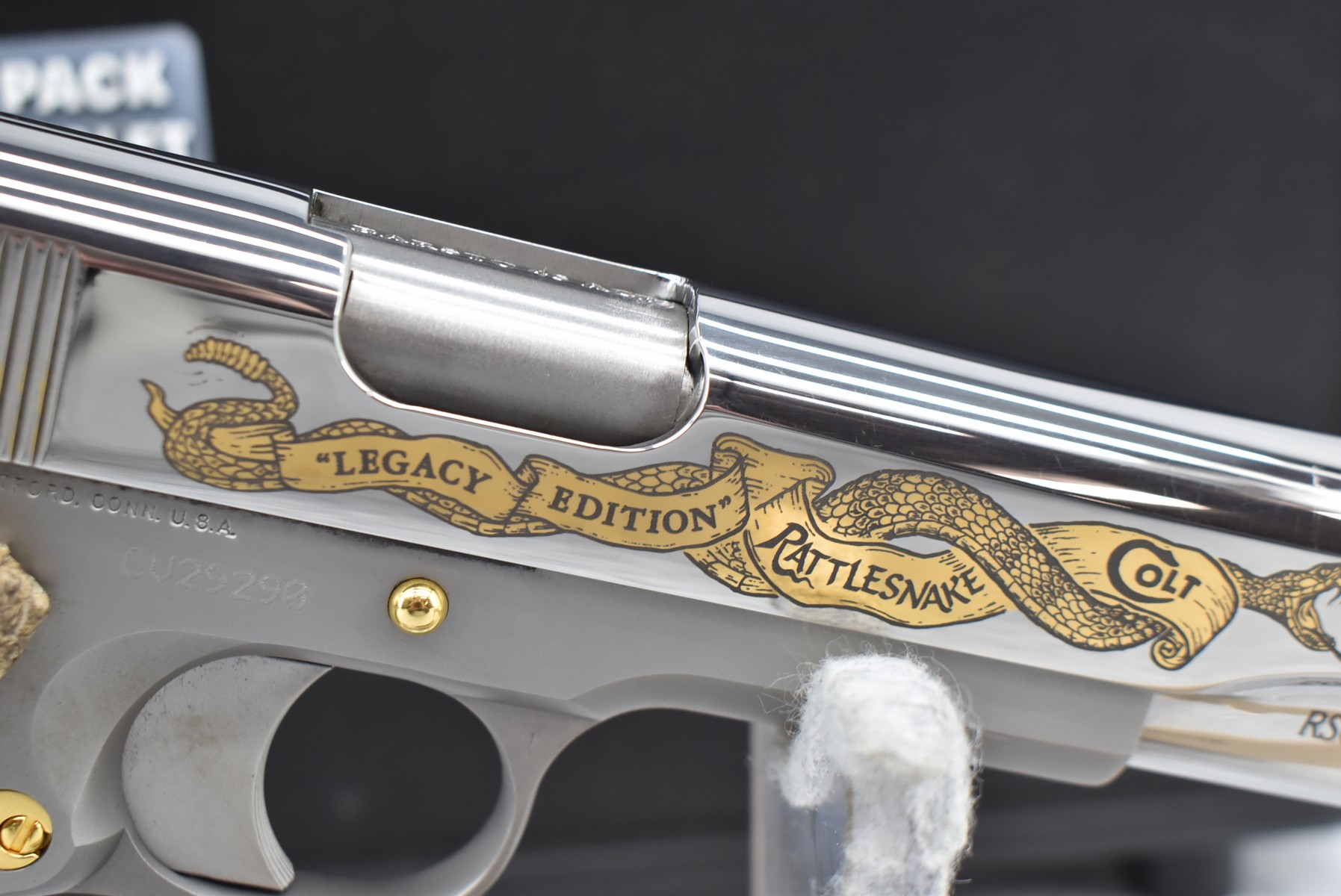 220R. Colt – Mod. 1911 – “Rattlesnake Legacy Edition” America Remembers – 45 Auto Cal. Semi-Auto Pistol – w/5” Barrel w/Trijicon Front & Rear Night Sights – Stainless Finish – w/Factory Snake Scale Grips – Both Sides of Slide Etched “Legacy Edition Rattlesnake” in a Banner – #RS0635 of 1,000 Mfg. – New & Unfired w/Factory Mag
